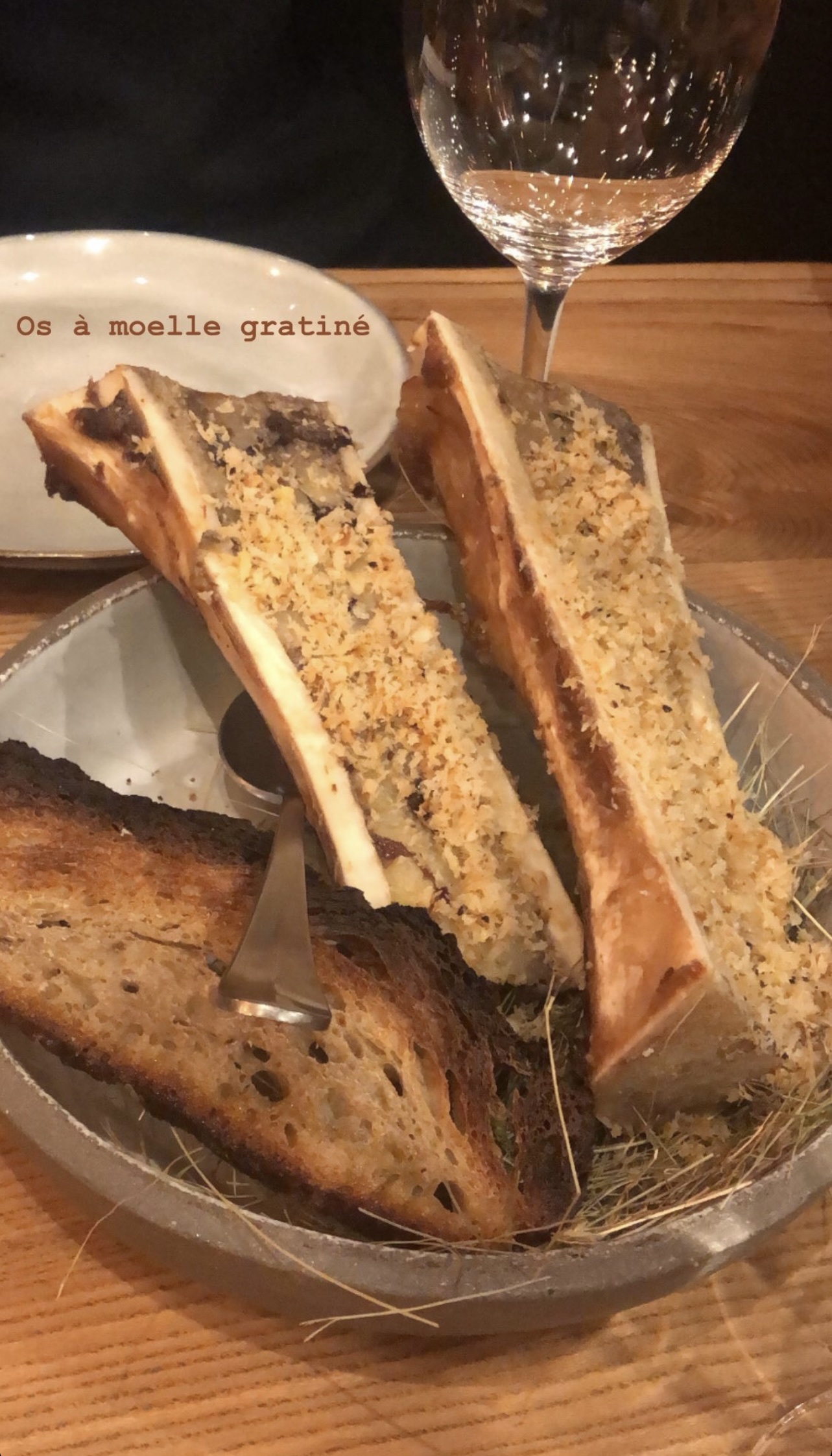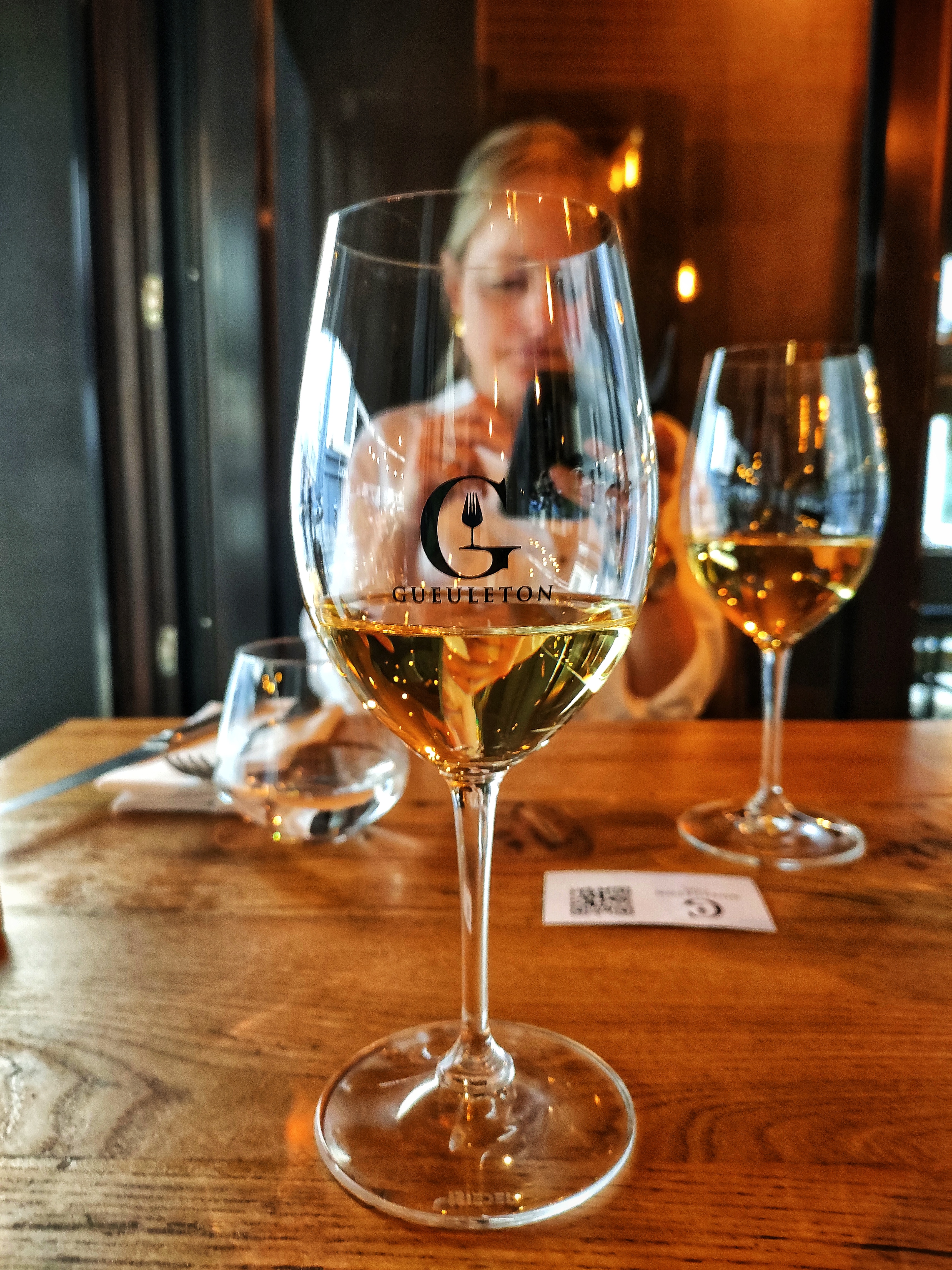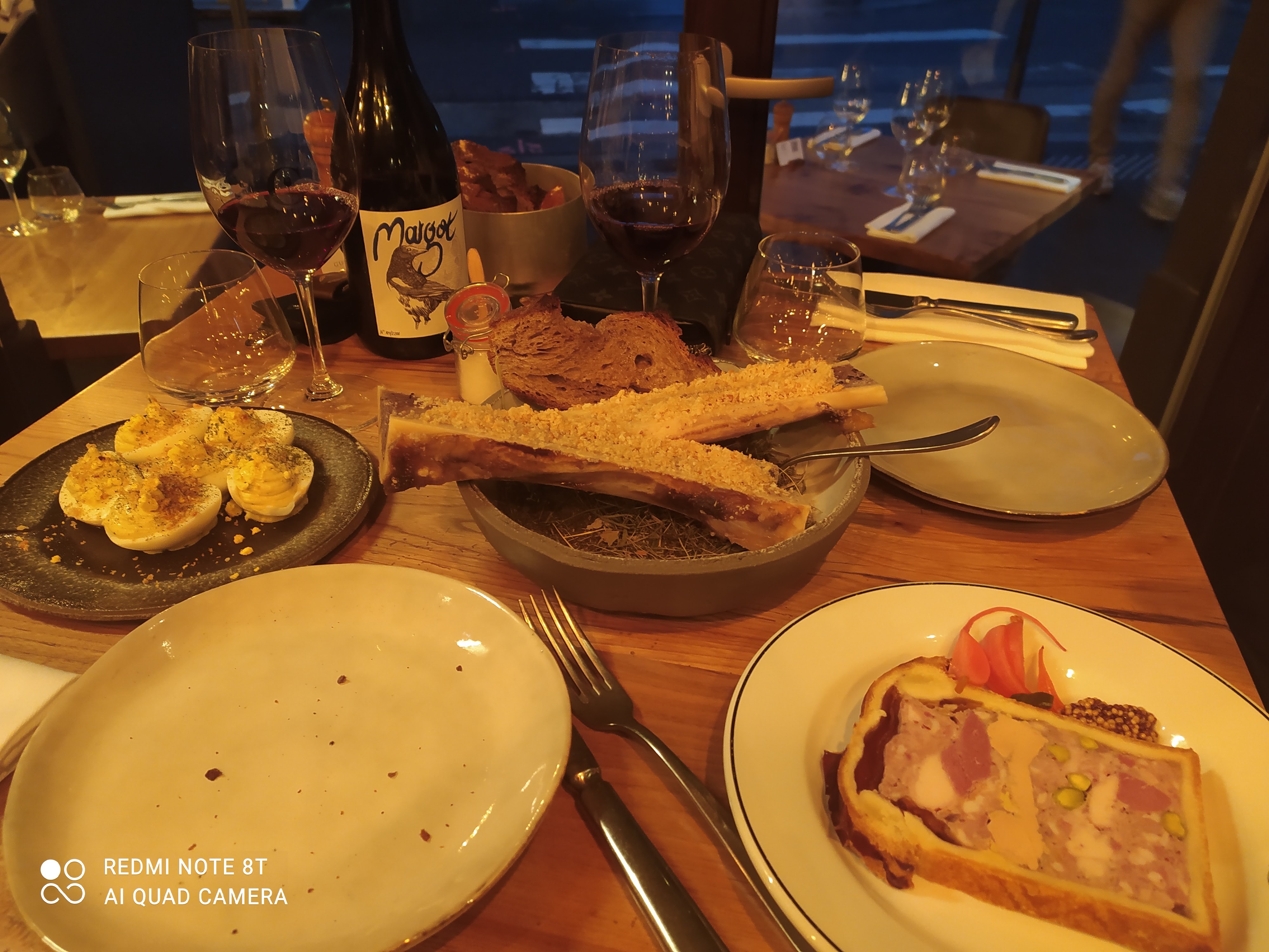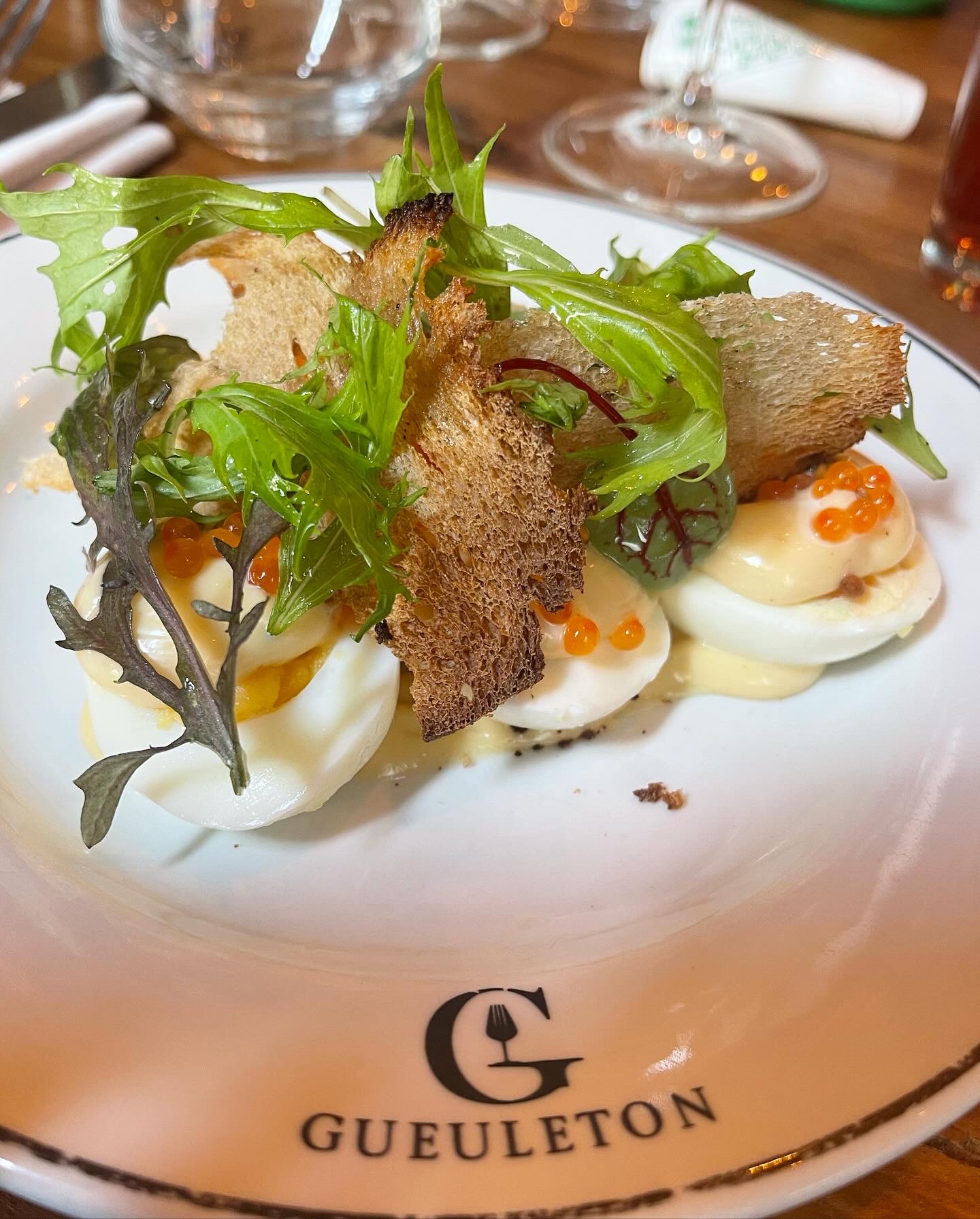 Os à moelle, oeufs mimosas, boudin noir et asperges, un régale. Nous n’avions pas assez faim pour les viandes qui avaient cependant l’air délicieuses, mais ces entrées ont été tellement à la hauteur qu’aucun regret n’a été éprouvé. Le service chaleureux, drôle et efficace. Un très bon vin blanc de Chenin. Gueuleton toujours aussi incroyable !