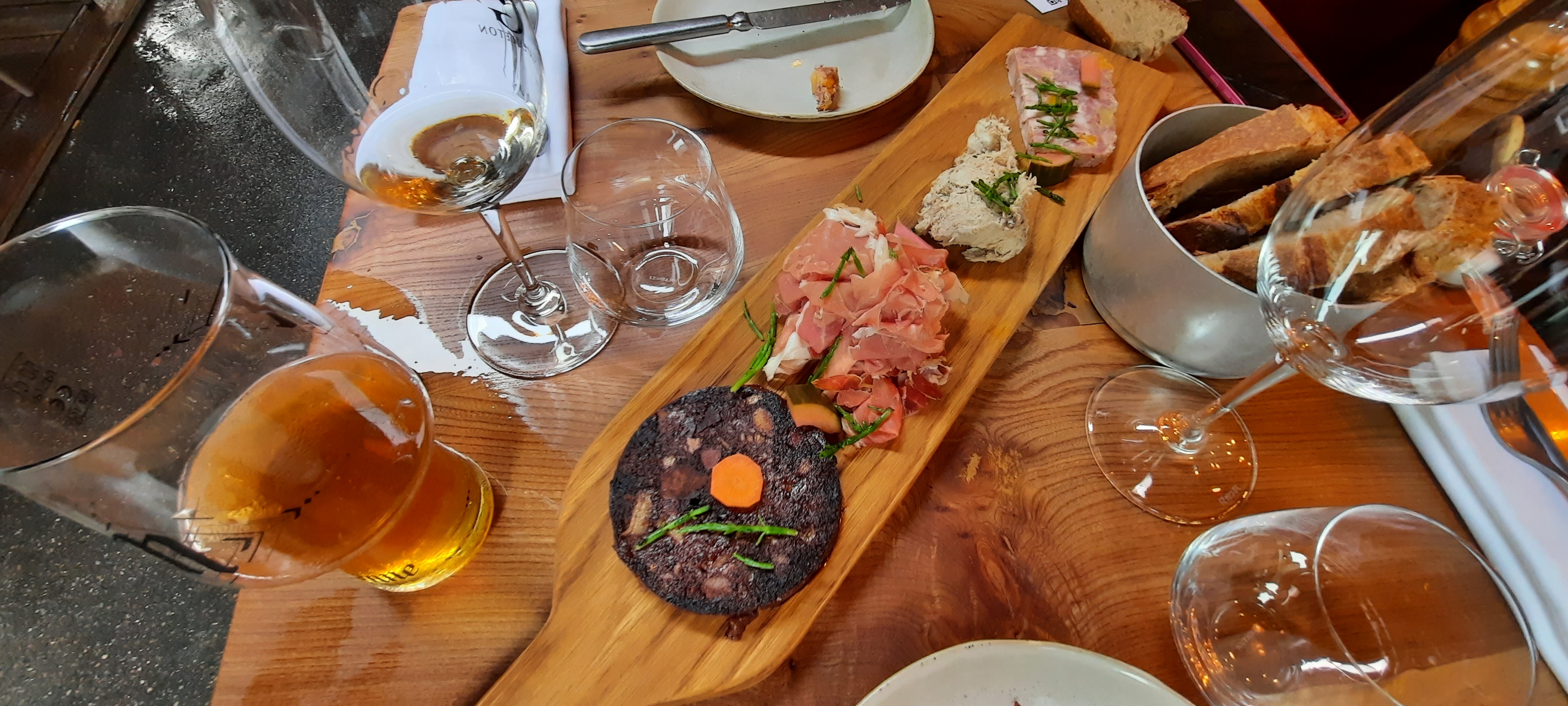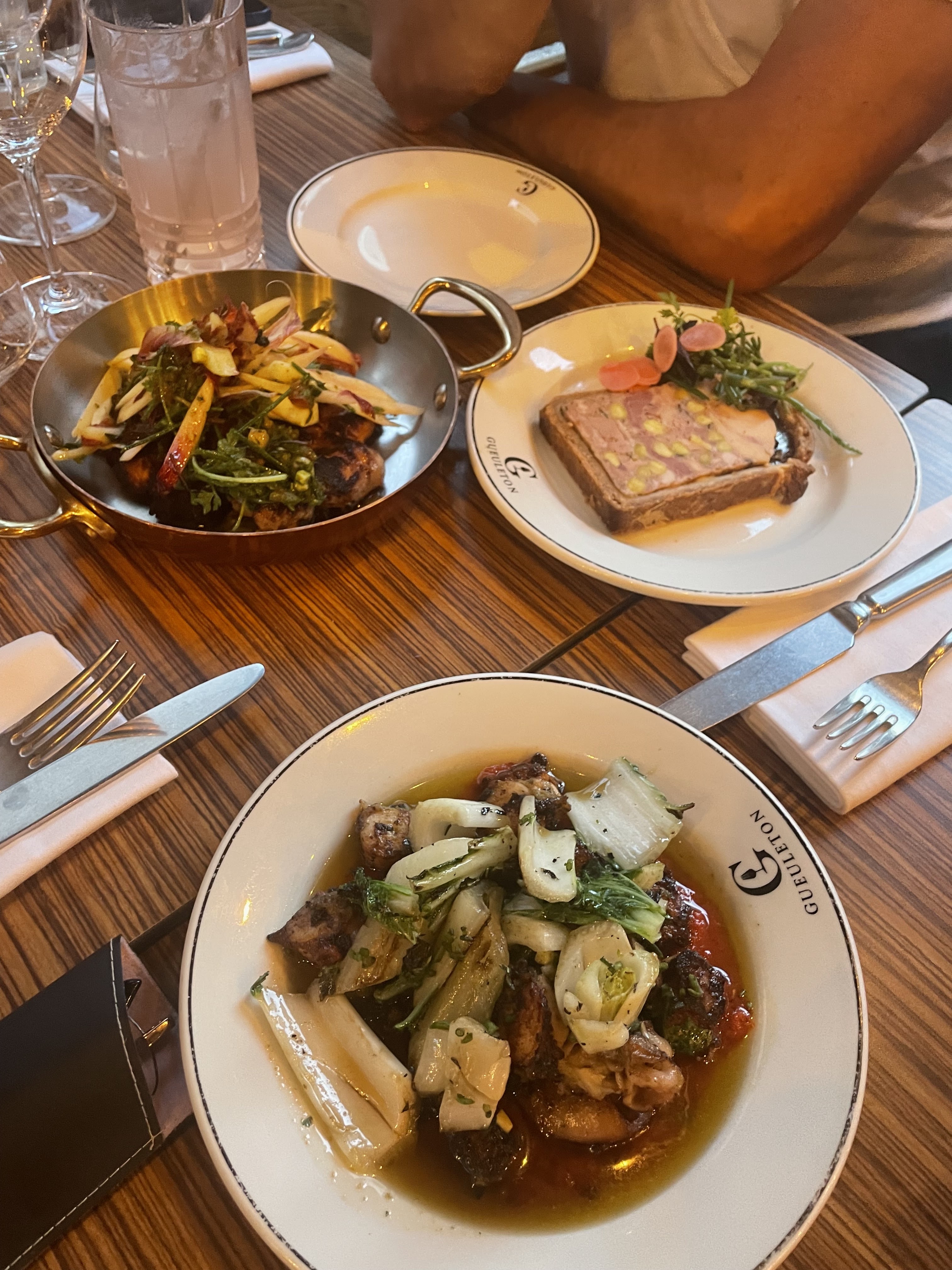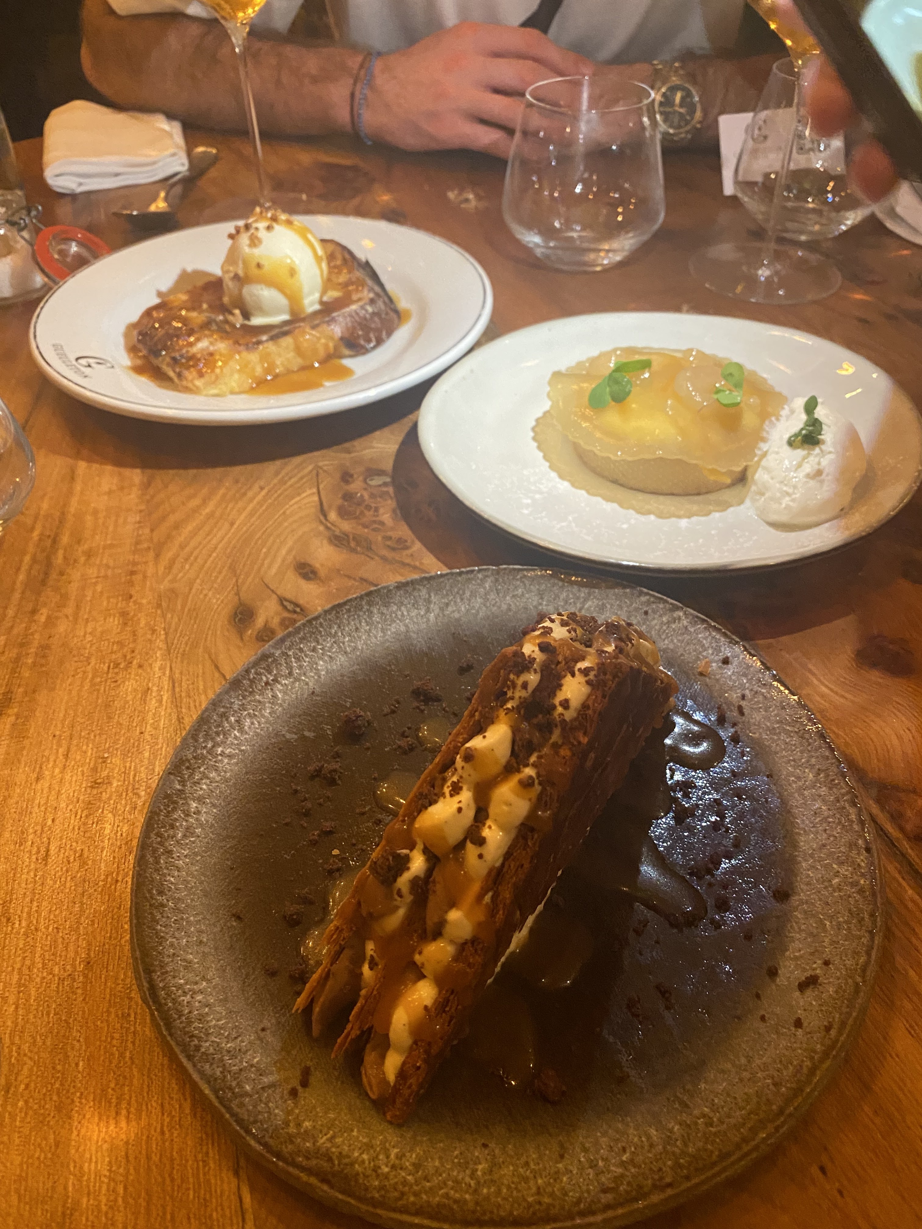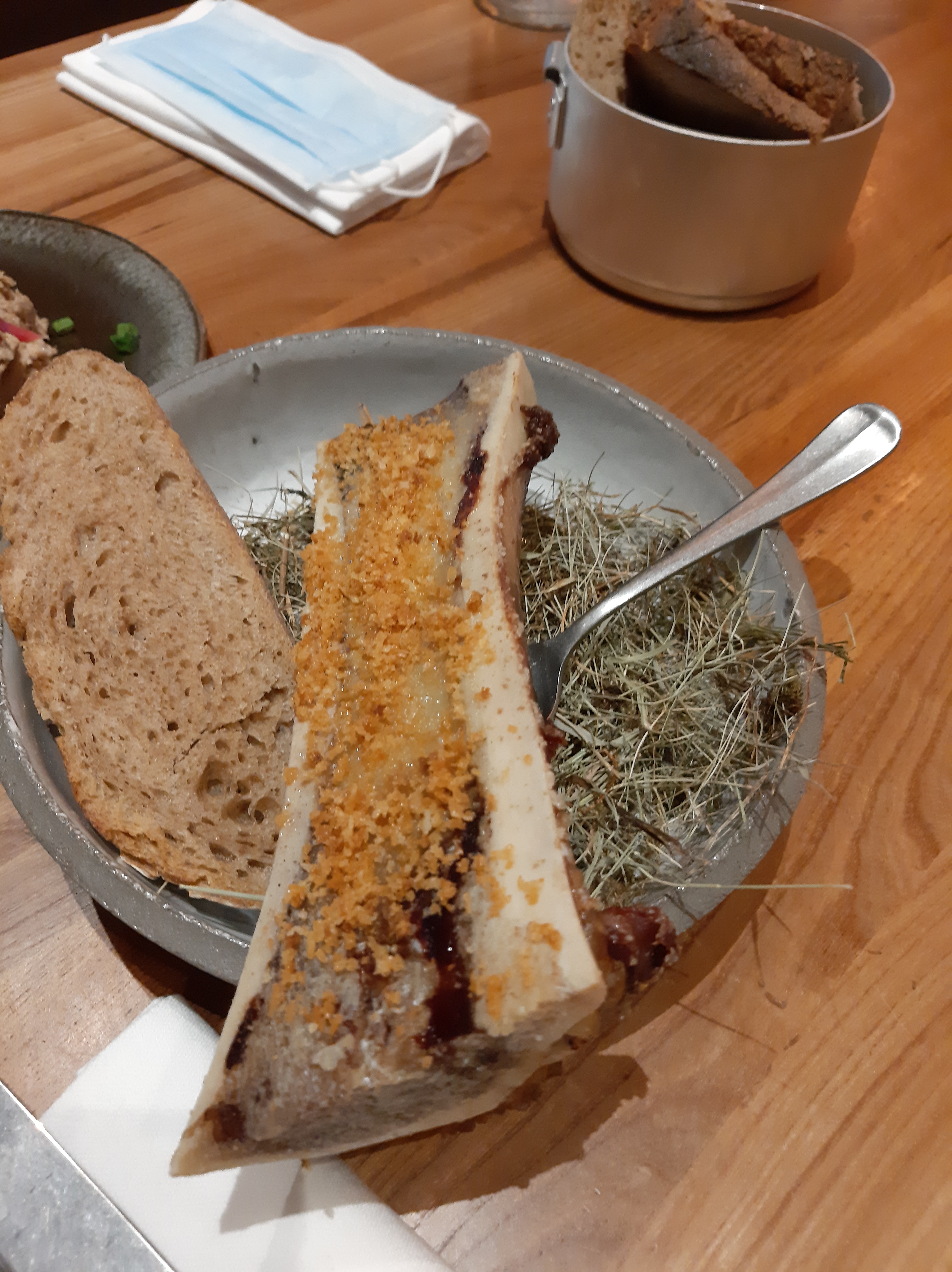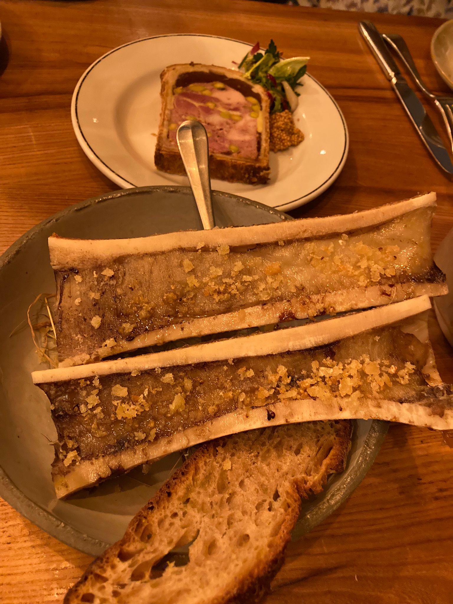 Os à moelle, oeufs mimosas, boudin noir et asperges, un régale. Nous n’avions pas assez faim pour les viandes qui avaient cependant l’air délicieuses, mais ces entrées ont été tellement à la hauteur qu’aucun regret n’a été éprouvé. Le service chaleureux, drôle et efficace. Un très bon vin blanc de Chenin. Gueuleton toujours aussi incroyable !