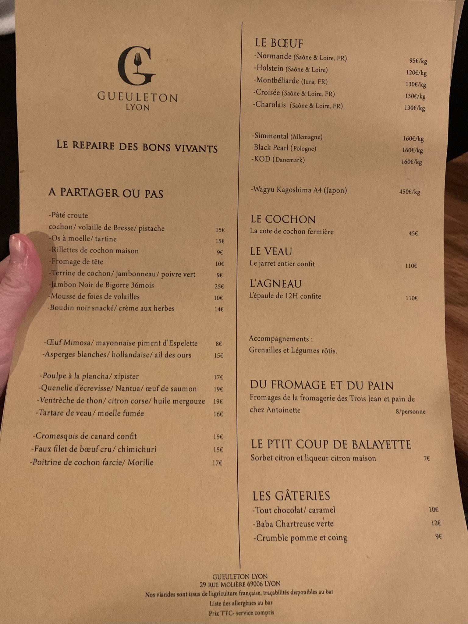 Cela fait 3-4 fois que j’y vais et c’est TOUJOURS un régal !! Étant parisienne d’origine, j’ai découvert ce lieu grâce à des amis lyonnais et maintenant, c’est devenu une étape incontournable lorsque mes amis viennent me rendre visite à Lyon !! On y mange bien et comme le prônent les fondateurs de Gueuleton, c’est un repaire de bons vivants !! Le staff est top, serviable et accueillant, vous pouvez commander tout ce qu’il y a sur la carte en fermant les yeux car tout est bon! Même le plus fin gourmet de mes amis a lâché un « c’est délicieux » (spéciale dédicace à Patoche). Le sommelier donne d’excellents conseils sur le vin pour accompagner les diverses viandes proposées à la carte selon le budget disponible (faut pas se mentir, pour bien manger, cela demande tout de même de lâcher un sacré billet 💵). Nous y retournons début janvier entre amis lyonnais pour fêter la nouvelle année autour de cette bonne bouffe ! Nous recommandons vivement cet endroit chaleureux et convivial !