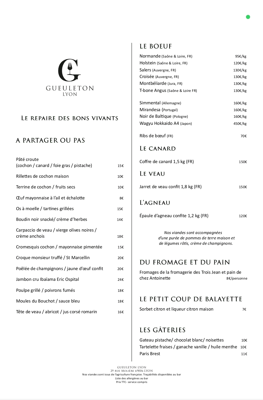 J’ai testé l’adresse de Lyon ce-jour, lors de mon passage en ville. Si vous aimez le gras, les bonnes viandes ainsi que les bonnes bouteilles, vous avez le devoir de vous y rendre. J’ai passé un moment extra et j’ai été servi par une équipe qui vous fait sentir comme un des leurs. Là-bas le client n’est pas roi, car c’est un ami, et les valeurs de « Gueuleton » sont respectées. On y va pour passer un bon moment, seul ou à plusieurs, et ils s’occupent de ne pas vous décevoir dans l’assiette. Niveau prix, c’est très correct pour la qualité et les quantités, comparées à ce que j’ai pu lire, par rapport à d'autres restaurants qui se disent « spécialistes » des viandes maturées. J’y retournerai les yeux fermés.