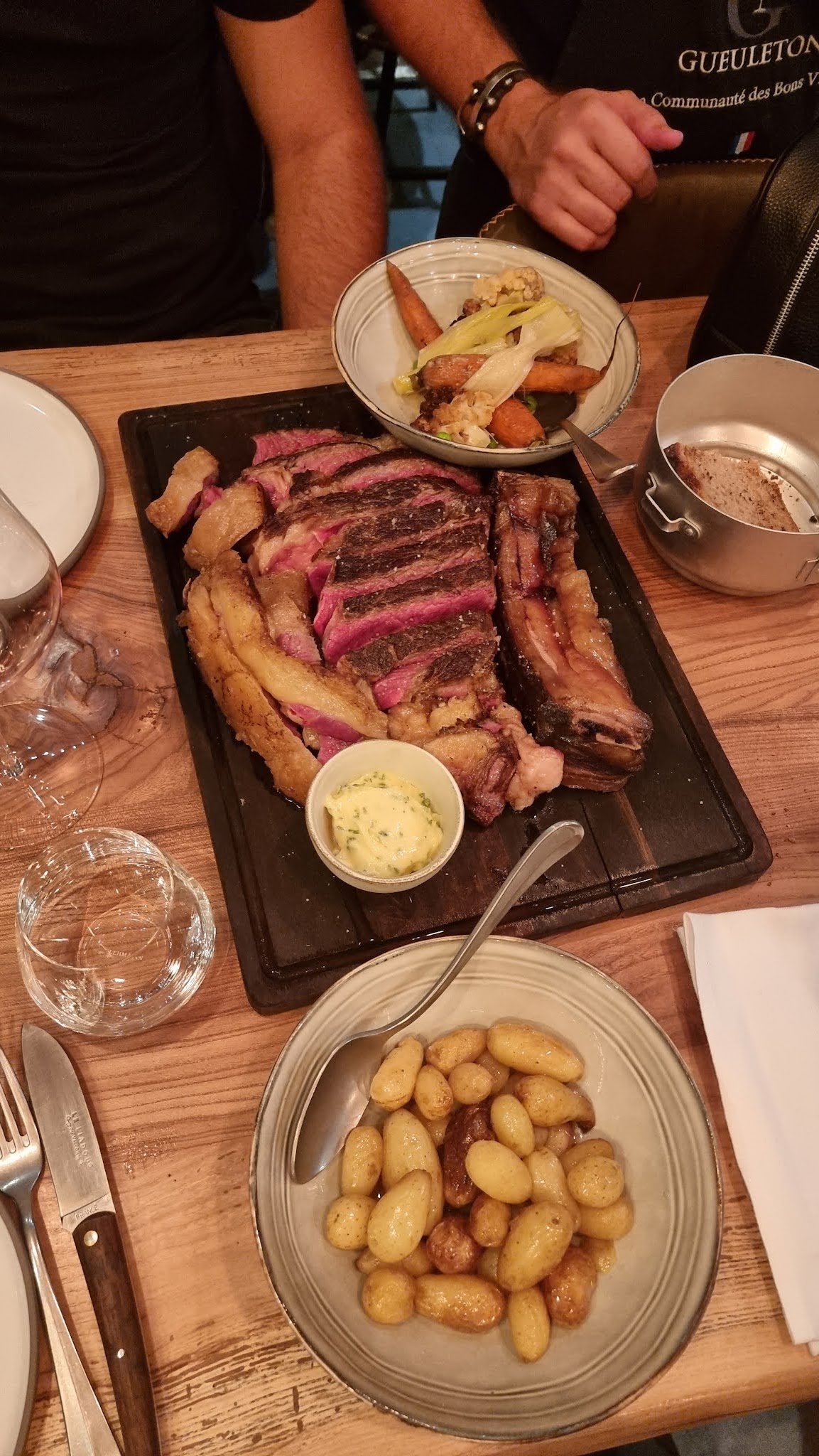 Très bon moment passé entre amis. La viande est très bonne et parfaitement cuite. Les serveurs et le manager ont été très chaleureux et commerçant. Point à améliorer : - Les accompagnements sont très minimalistes (un petit bol de purée et une petite assiette de légume pour 5). On a certes pu en redemander mais de mon point de vu, la présentation et le contenu serait à améliorer surtout par rapport aux prix de la côté de bœuf (130€ /kg pour une Montbéliard). Exemple : compléter (pour le même prix) la présentation avec : - De l'OS à Moelle - Une poellée de champignon - Pouvoir aussi proposer des frites maison à la place de la purée. - Etc... - Une gamme de vin plus abordable : Le restaurant dispose d'une très belle cave à vin. Malheureusement il y a très peu de vin en dessous de 50 euros la bouteille. Je pense que ça serait bénéfique de compléter cette très belle carte avec quelques nouveaux vins autour de 30/35 euros la bouteille. Pour conclure, j'ai été très ravi d'avoir pu au moins une fois manger chez Gueuleton et je ne le regrette pas, nous avons passé un super moment. Toutefois pour vraiment bien profiter du restaurant et des plats, il faut préparer un budget conséquent. C'est un point de vue personnel, mais je pense qu'il est important d'améliorer les accompagnements des plats afin d'avoir un meilleur sentiment par rapport au prix/qualité.