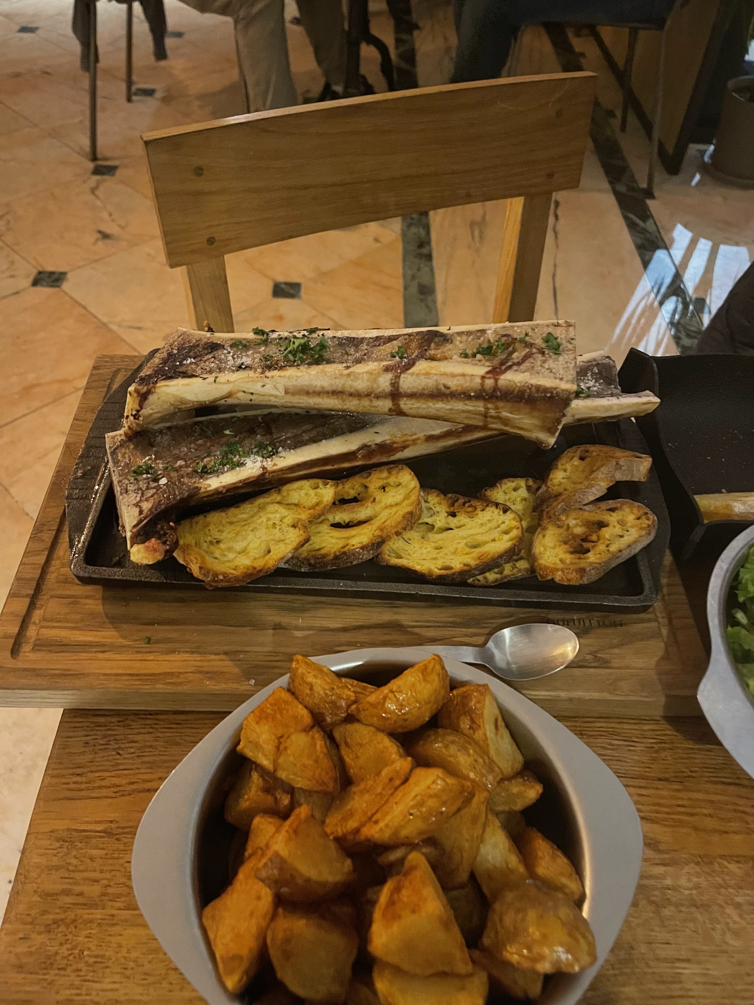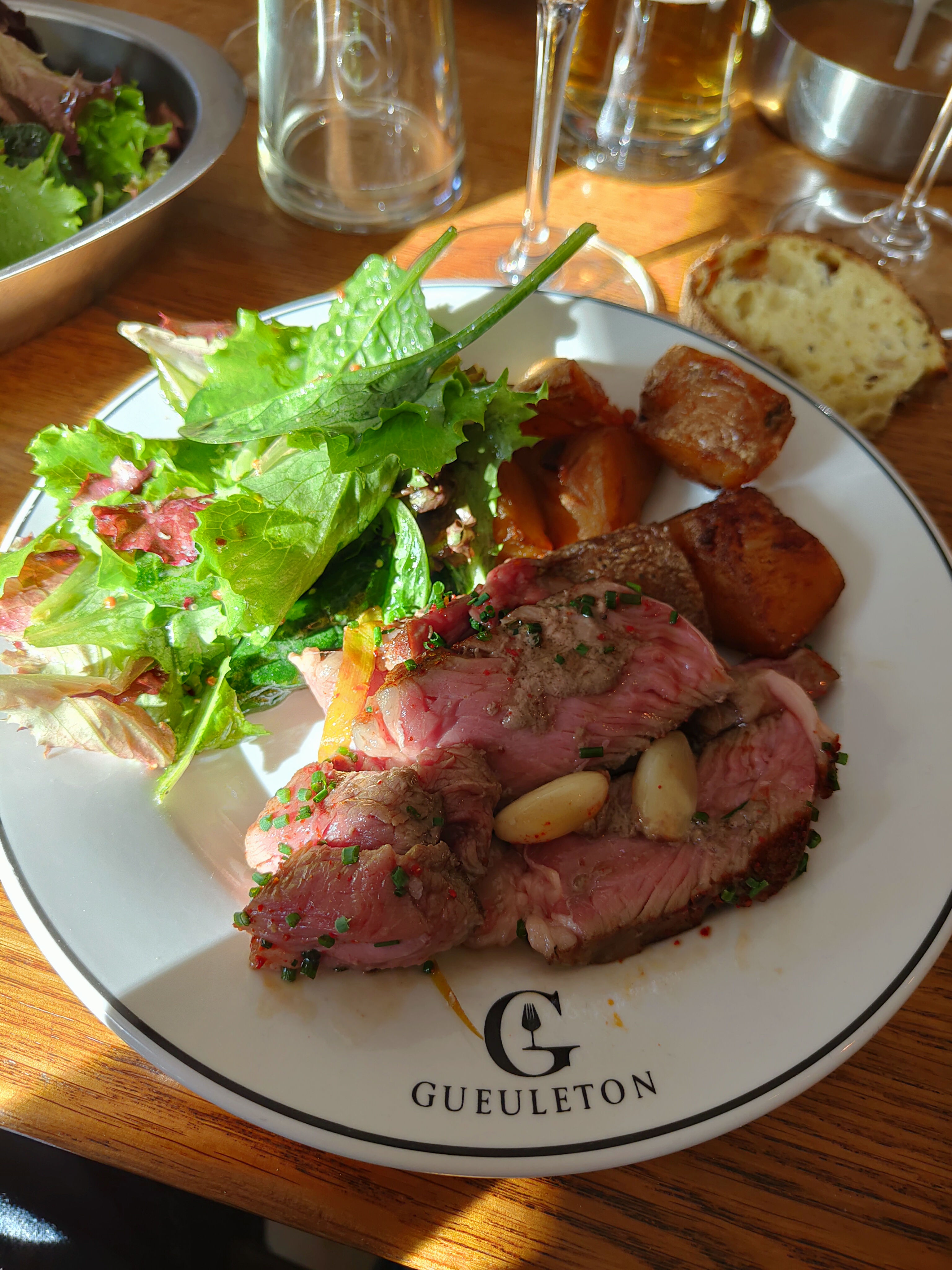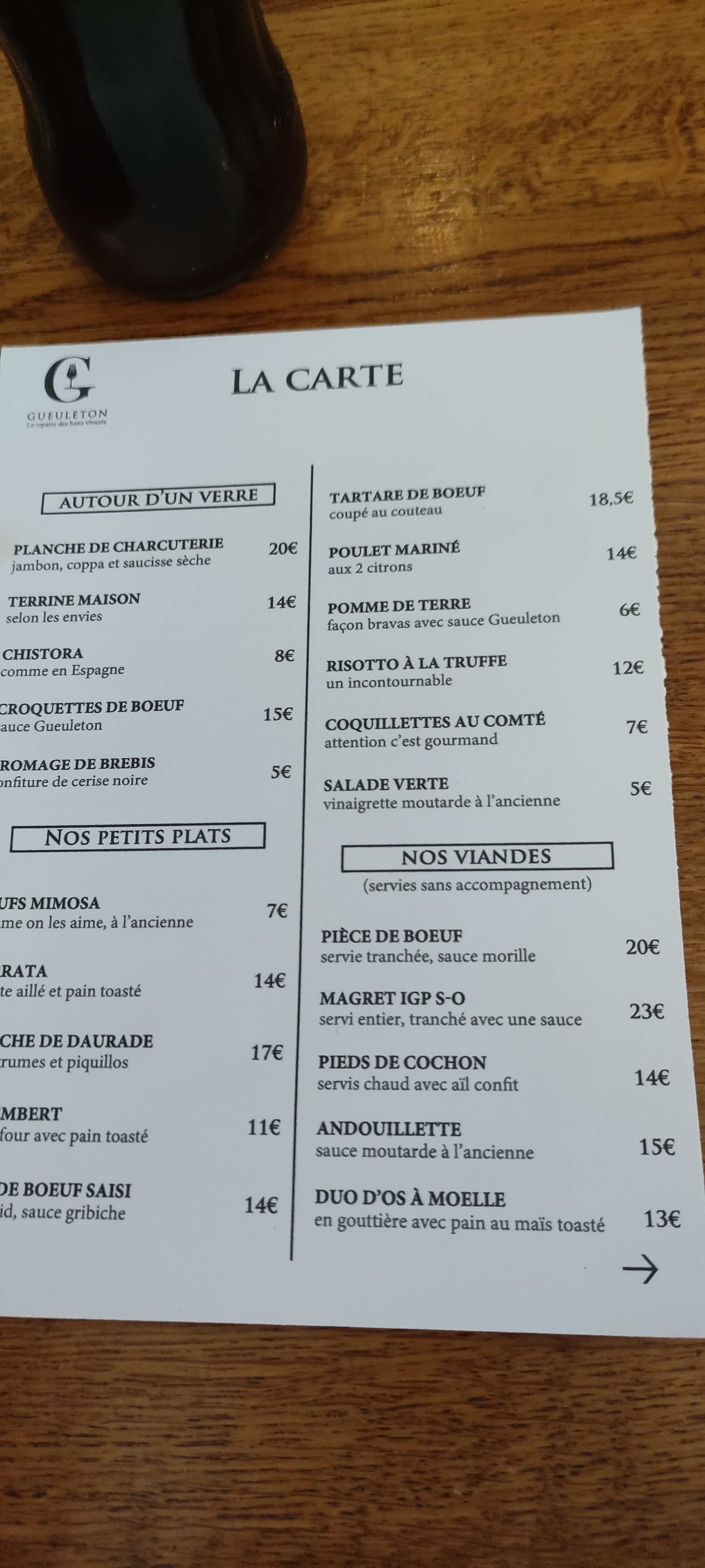Endroit très sympa, service impeccable, Viande excellente....malgré le prix .. élevé....étant amateur de côte de bœuf , Il y a de très bon resto dans la ville ,qui en propose aussi (cote de Galice par exemple) A un prix raisonnable. On paye je pense la réputation de l enseigne Gueleton . Difficile de s'adapter à des prix qui grimpent autant. Cela dit nous avons passés une très bonne soirée.