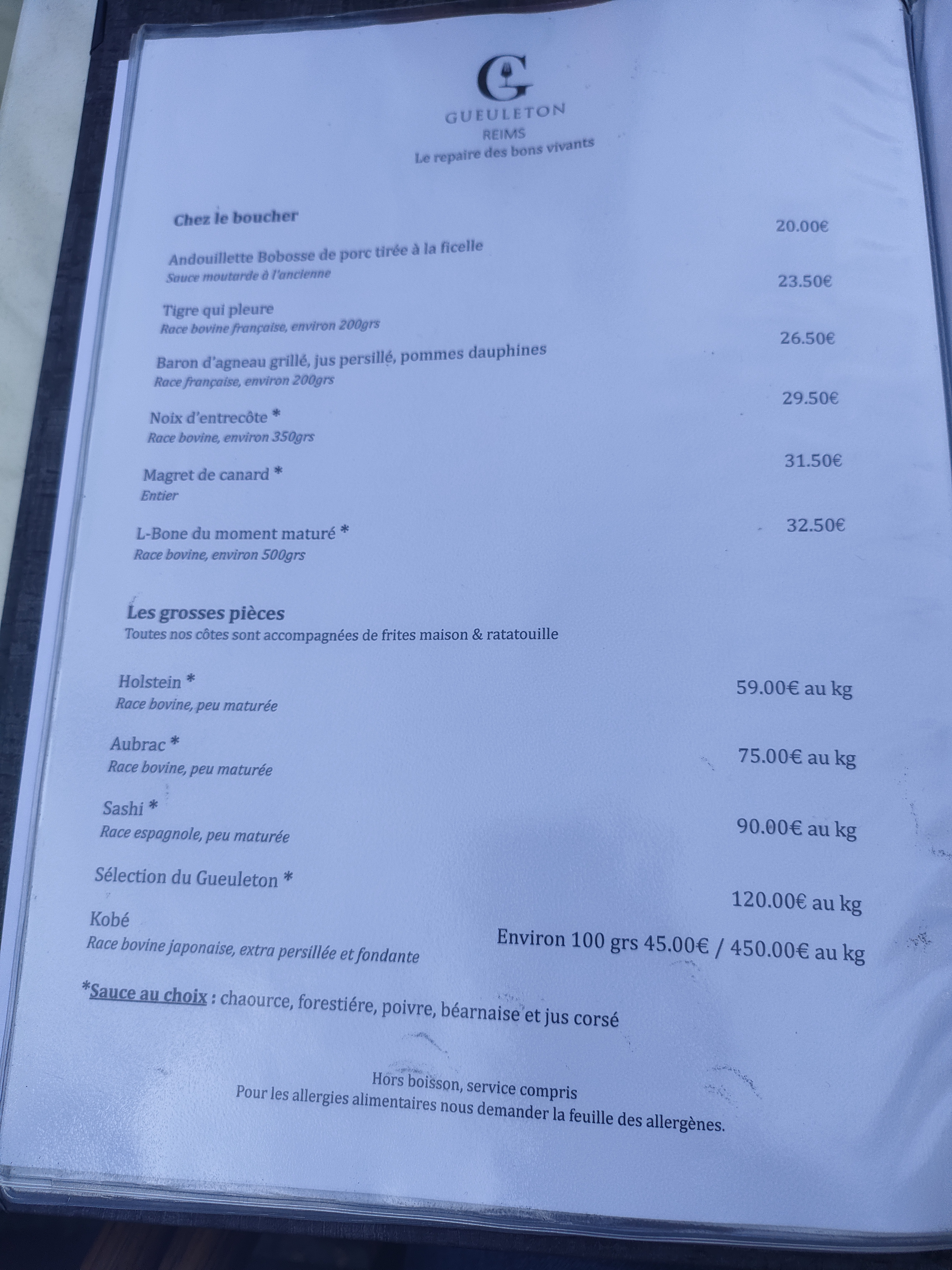 Une déception pour ce restaurant. Très enthousiaste à découvrir le restaurant mais le constat est décevant. Produit basique, mon L-Bone n’avait pas d’épaisseur du coup pas saignant mais rosé. Prix des vins, un peu surdimensionné par rapport aux produits. Pas une bonne expérience pour le Gueuleton de Reims. On mange mieux dans les autres brasserie avec un rapport/ qualité/ prix plus intéressant. On paie cher pour voir des serveurs avec un béret…