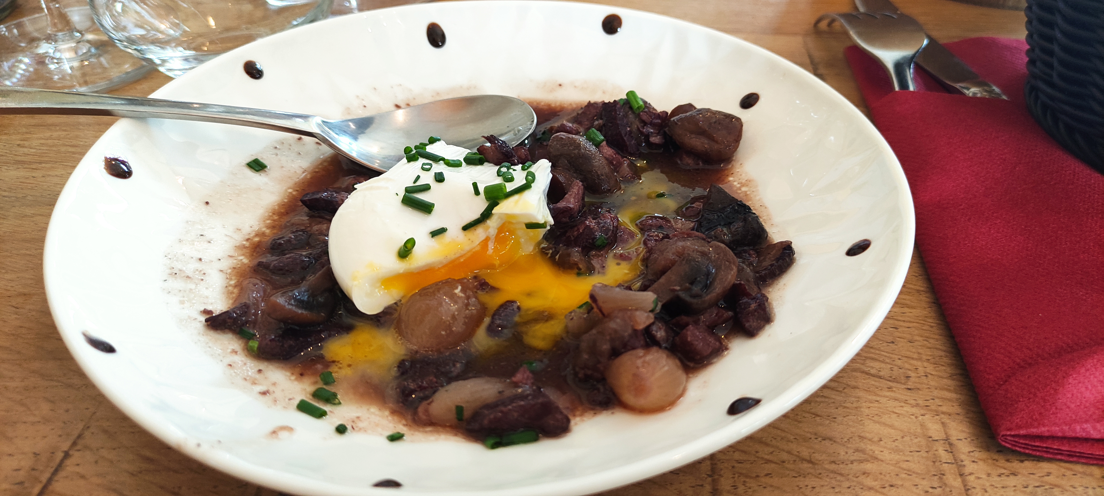 Bon accueil. Os a moelle délicieux bien présenté. Oeuf meurette très bon , oeuf poché parfaitement maîtrisé. Bonne viande Un Petit passage qui vaut le coup