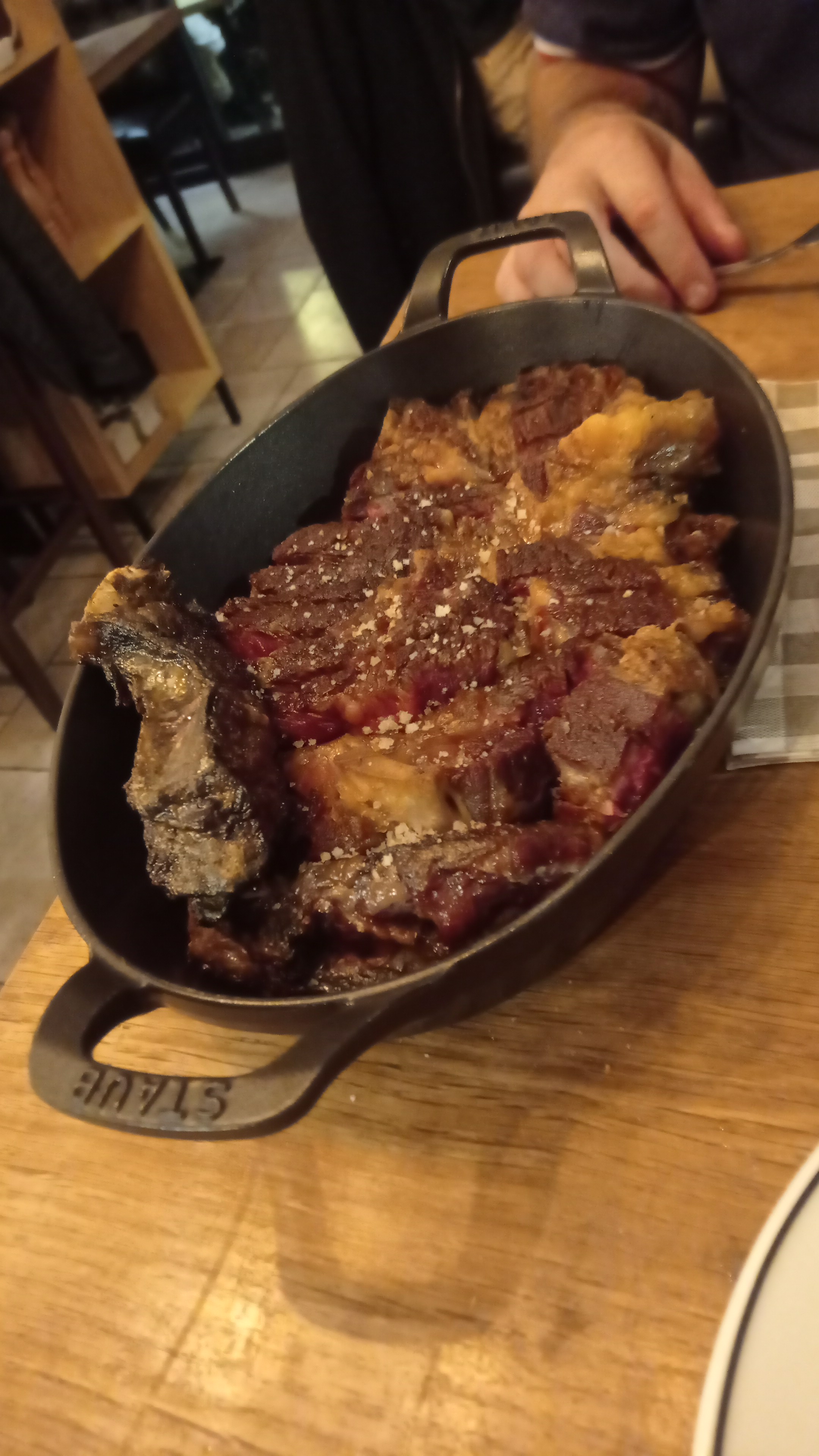 J'ai entendu tellement de bonnes choses à propos de ce restaurant, alors mes amis et moi avons décidé de vérifier par nous-mêmes. A notre arrivée, le monde semblait bien, bon choix de viandes, superbe carte des vins, nous avons commencé avec de la charcuterie à partager et une bouteille de champagne. Il a fallu du temps avant d'être servis - 40 minutes. Nous leur avons demandé à plusieurs reprises s'ils ne nous avaient pas oubliés. Malheureusement, les serveurs ne connaissent pas vraiment le menu, ne leur demandez pas d'où vient la viande... Puis c'est devenu de plus en plus étrange, un des pieds de ma chaise de bar a soudainement commencé à bouger et je suis tombé, mais les serveurs étaient plus préoccupé par la chaise que moi. Le service est devenu de plus en plus lent, nous avons commandé davantage et ils ont réussi à oublier. Nous avons réorganisé. La fin a été formidable, le manager est venu, même pas un bonjour, j'espère que vous avez apprécié oh et nous avons dépensé 700 euros. rien juste rester à côté de la serveuse et compter devant nous si nous avons payé assez. Puis il a baissé son masque, il est retourné à l'intérieur et la table à côté de nous a commandé du café, le gérant avait les doigts dans la bouche puis il a attrapé tous les cafés et les a sentis (je ne sais pas pourquoi) puis ils les ont servis à table. à côté de nous. C'était vraiment dégoûtant et donc pas professionnel, surtout maintenant que COVID est toujours d'actualité. J'aurais pu facilement obtenir 4 à 5 étoiles mais l'attitude et le service n'étaient pas bons.