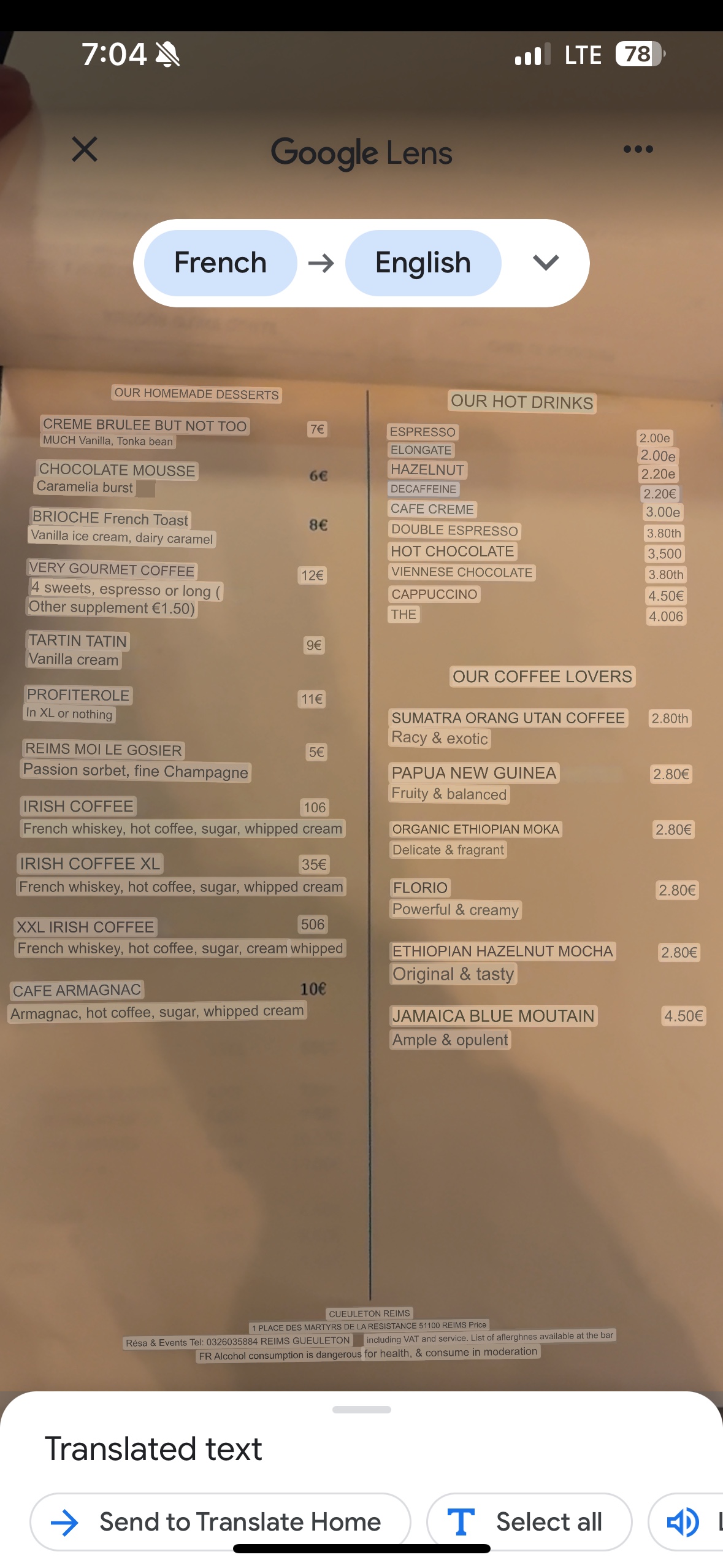 Bonjours on est parti manger pour un evg donc une équipe de 9 personnes, entrée super, plat super, dessert pas bon mais bon le reste rattrape le dessert, j’ai été dessus par rapport à l’addition plus de 1200e même pas il paye un café j’ai pas trouvé ça commerçant de leur par jamais vu ça…