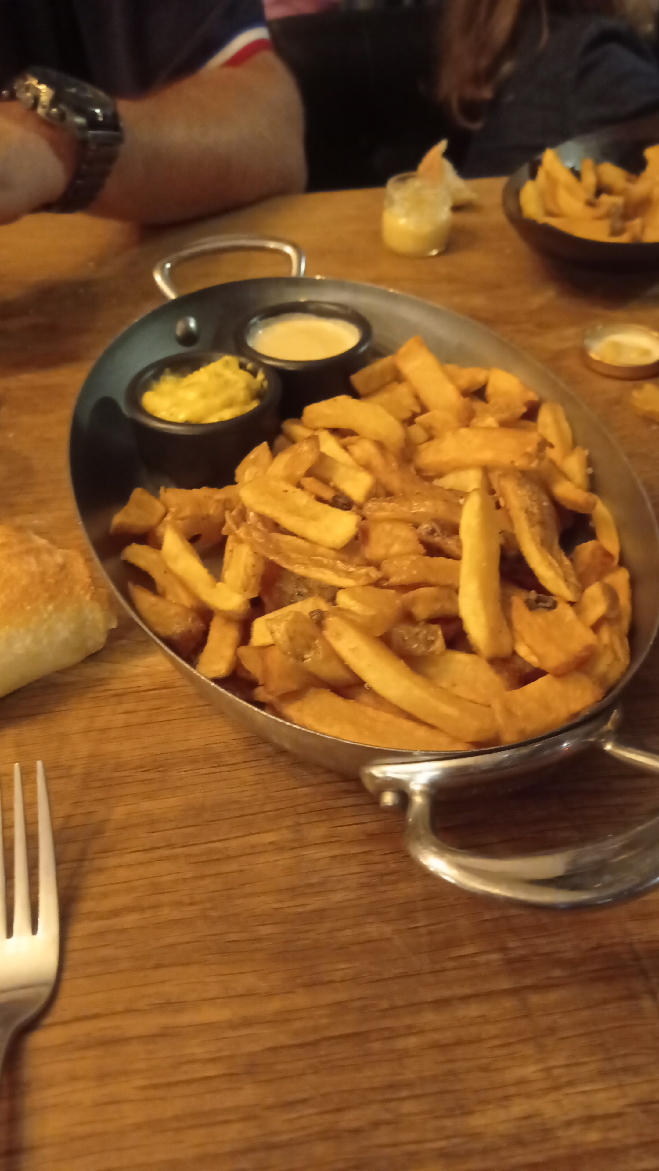 La pire expérience culinaire depuis longtemps. Après nous être assis, il a fallu un certain temps au personnel pour prendre nos commandes. Ils étaient trop occupés à habiller les tables vides. Nous avons commandé une assiette à partager et le plat principal. L'assiette de partage est arrivée dans un délai raisonnable et était correcte, mais le plat principal leur a pris plus d'une heure et 40 minutes pour se préparer. La viande n'a pas répondu aux attentes, aqueuse sans saveur. Les frites n'étaient pas croustillantes. Le personnel était inexpérimenté et certains étaient juste un peu désagréables. Si vous commandez un verre de vin rouge par exemple, en tant que serveur, vous revenez à cette table en quelques minutes pour prendre la commande de cette personne au lieu de laisser les gens assis et de devoir demander plusieurs fois. Au fait, le vin rouge avait un goût de vernis à ongles. En fin de compte, ils nous ont donné les boissons gratuites pour le temps d'attente ridiculement long. Je ne le recommanderais certainement à personne !