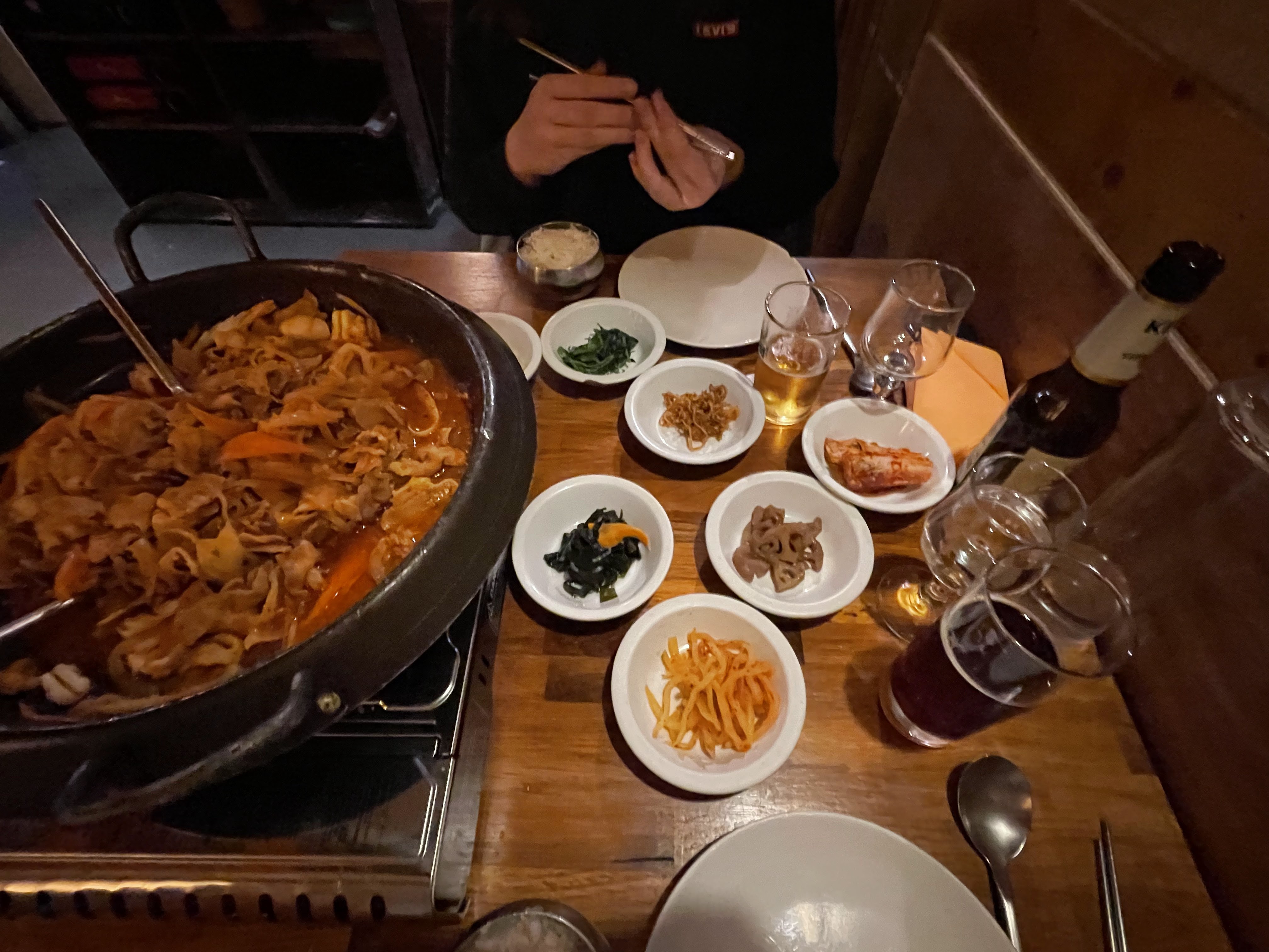 Plat pris : BBQ porc et boeuf avec 1 bouteille de soju. (47€) La clim a été apparemment volée, il faisait tellement chaud, courage le personnel ! Plats très bons et les accompagnements aussi. Les portions sont généreuses. Il y a de l'attente à l'extérieur du restaurant, (samedi soir vers 20h45 il faut attendre 1h).