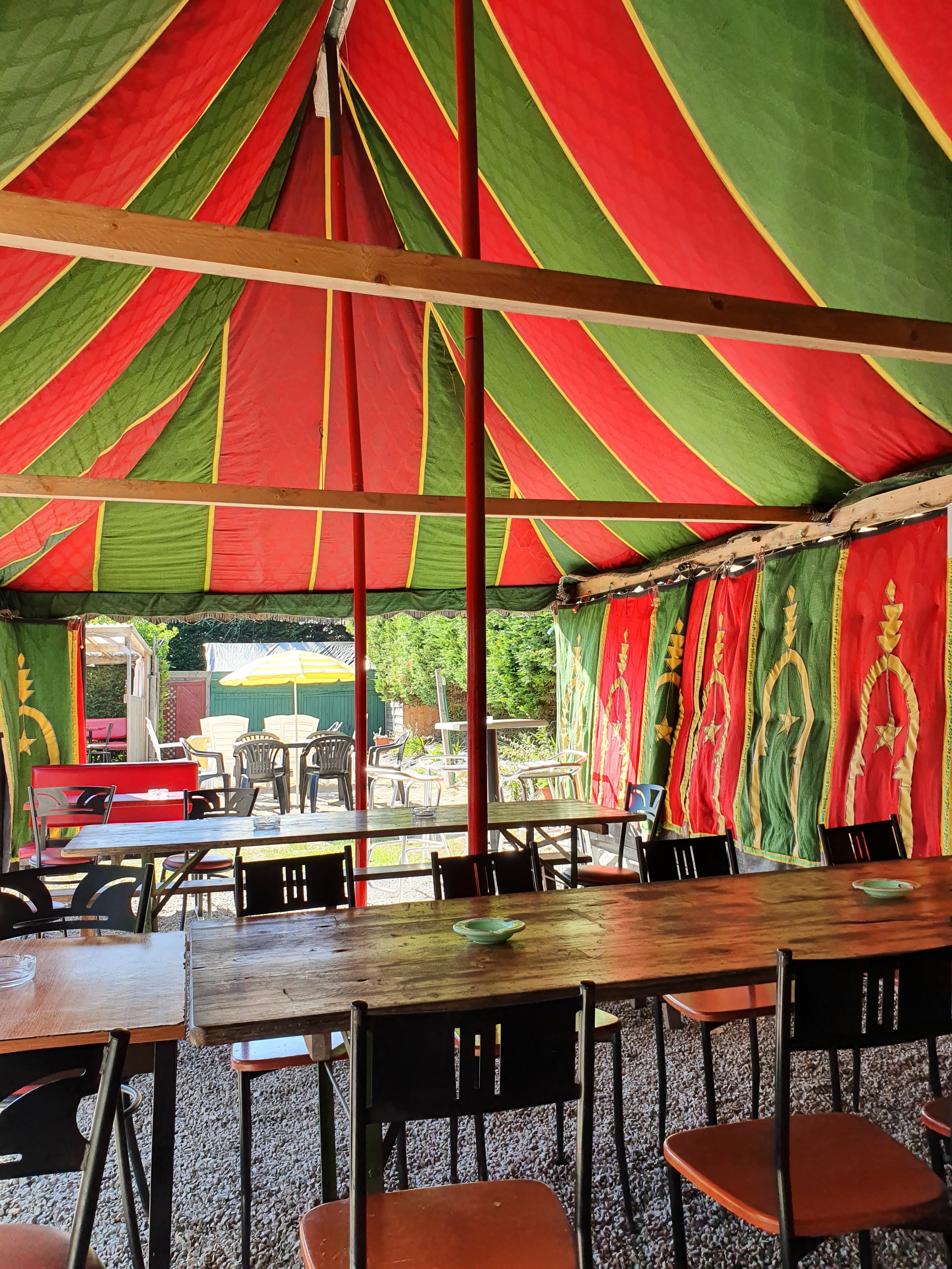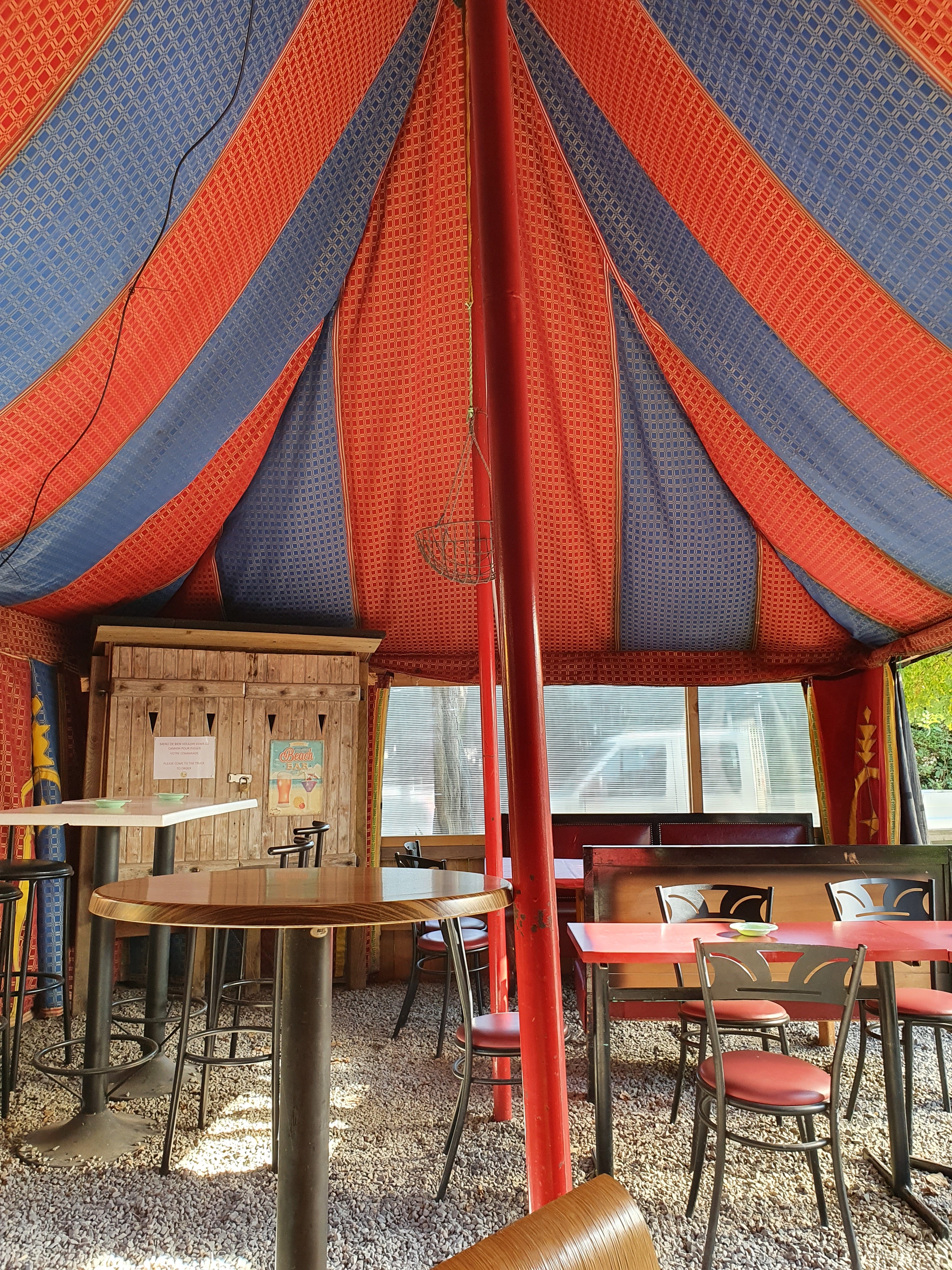 Un lieu coloré et cosy, un mélange de camping et de cirque. La nourriture était délicieuse (nous avions des hamburgers et des lasagnes) et le service était incroyablement sympathique et très serviable ! Encore ravissant.