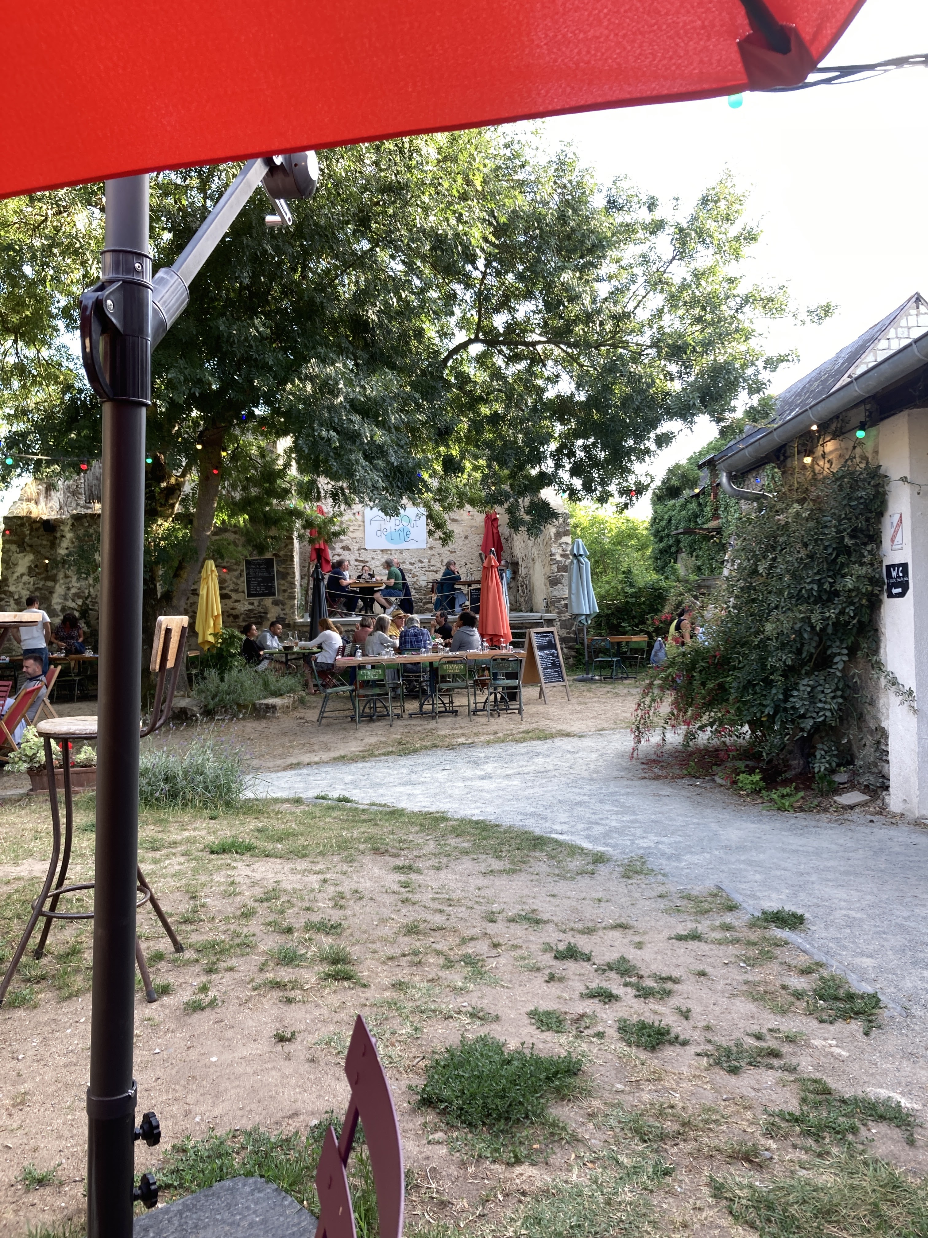 Un cadre superbe sous de grands arbres pour déguster une bonne salade d'ici à l'anguille fumée en toute convivialité et accompagnée d'une bonne bouteille de Savenière.