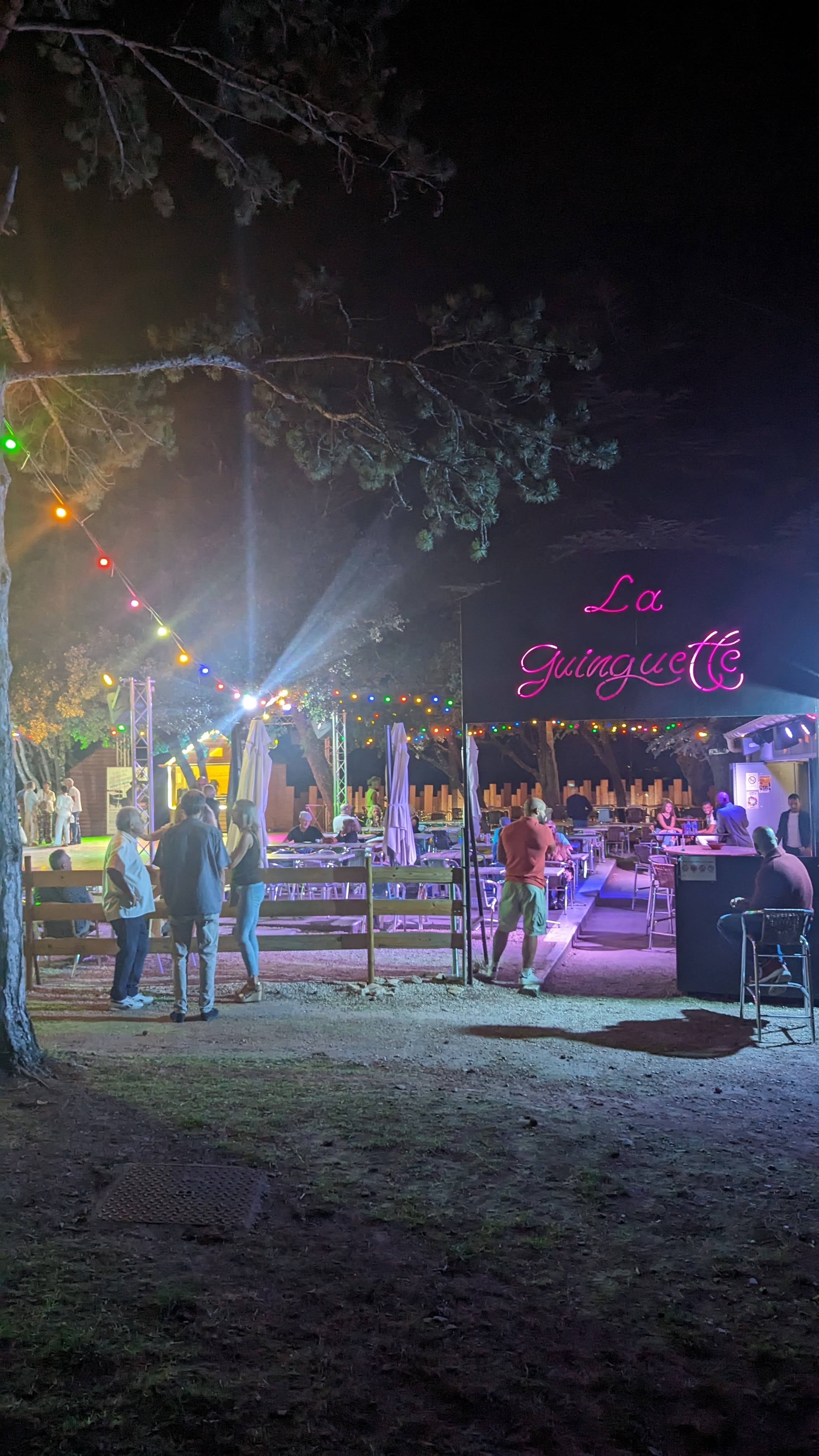 Endroit sous les arbres... En pleine nature.. Idéal pour les soirées d'été... Très festif avec ambiance assurée.... Selon les soirs les thèmes musicaux sont différents.... Le samedi soir c'est souvent disco... On peut y manger.... Mais il est conseillé de réserver... Ou juste prendre un verre.. Les tarifs sont corrects.. Par contre.. Un peu compliqué pour se garer car énormément de monde.. Y aller vers 21h30 est l'idéal....