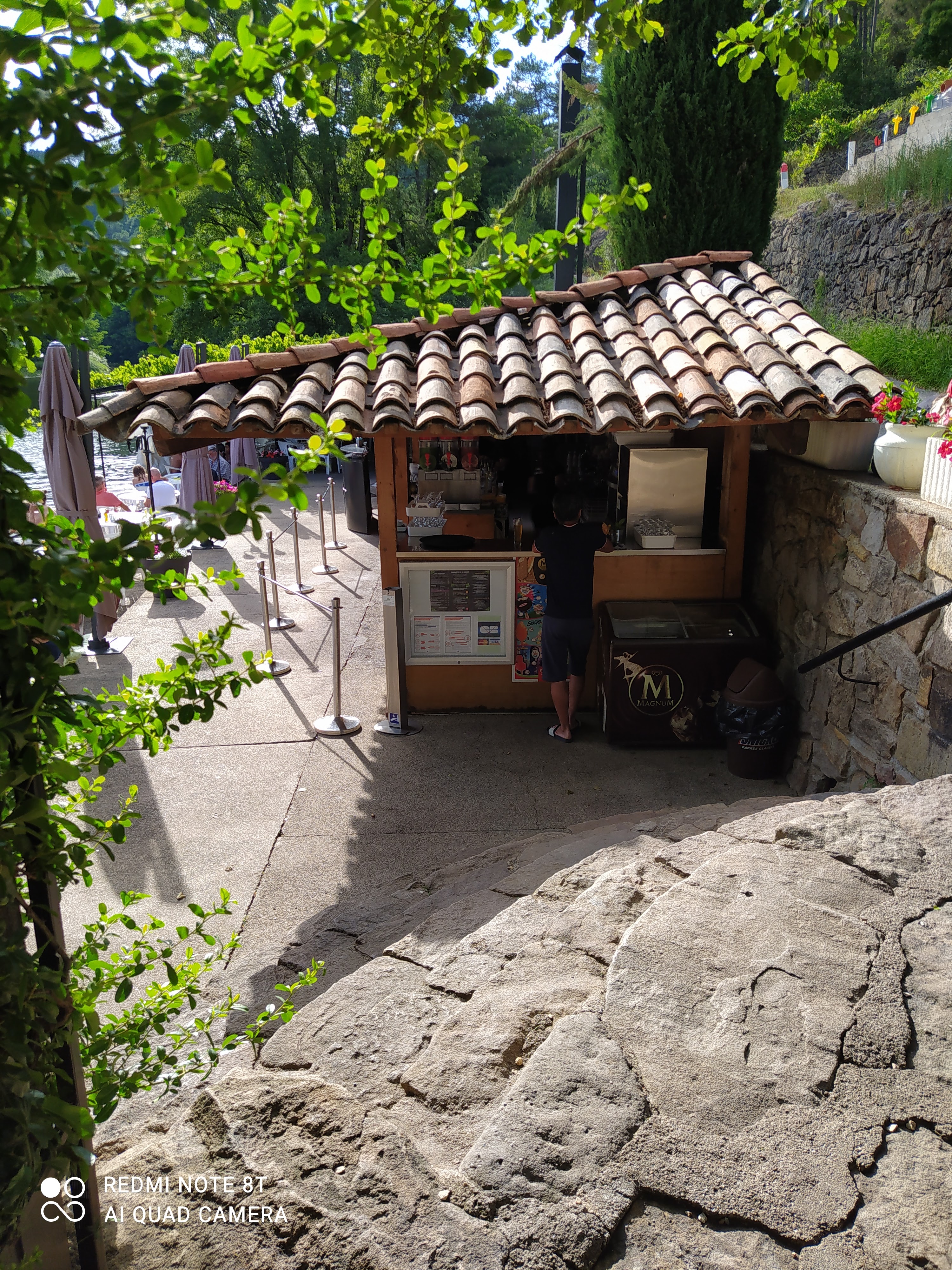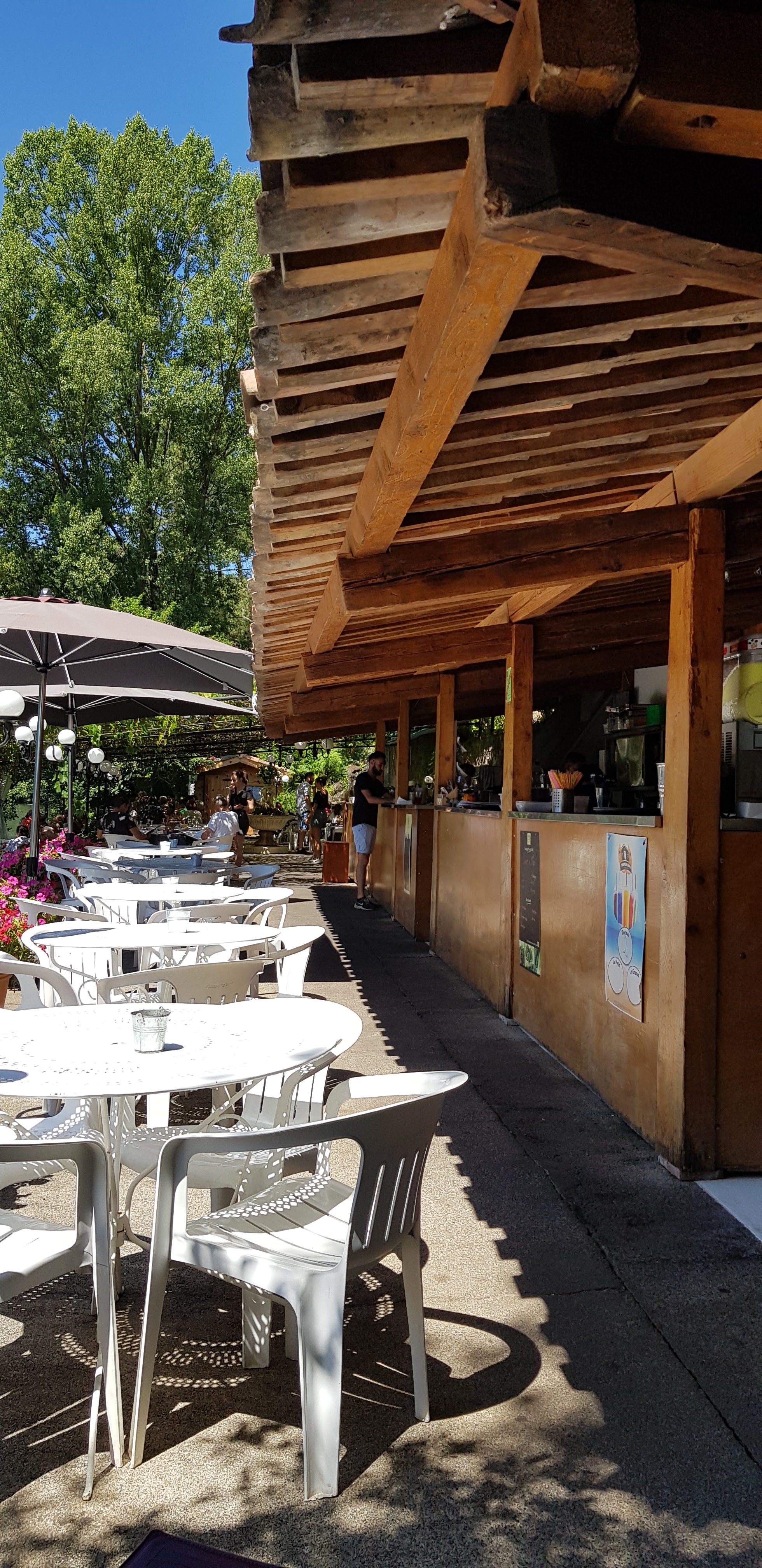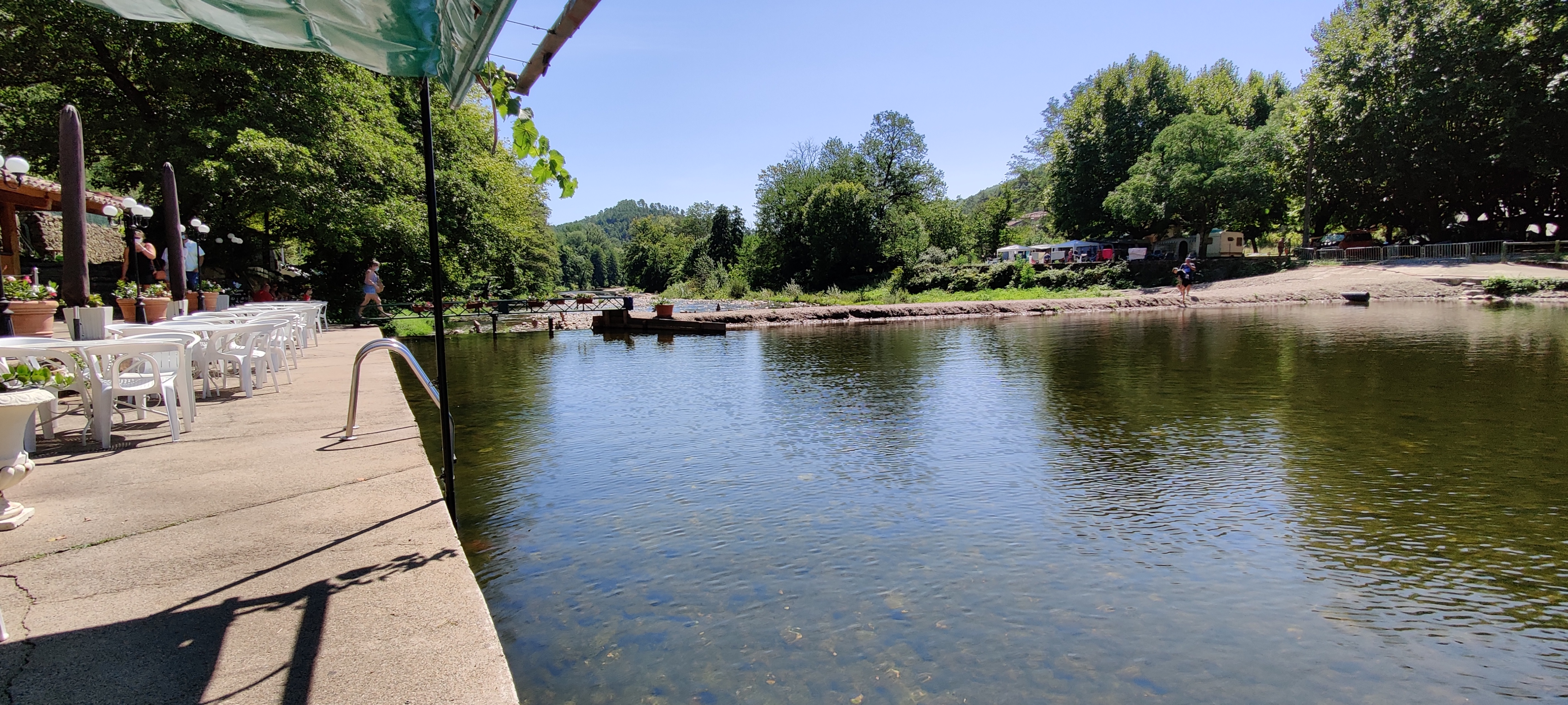 la Cèze donne de la fraîcheur sur toute la rive. Et à la guinguette. Service exclusivement féminin, rapide. Souriant. prix abordable. Et pour vous rafraîchir, un plongeon dans la Cèze. Une crèpe à la châtaigne (sans châtaigne) et froide. Pas cher mais ça vaut pas plus.