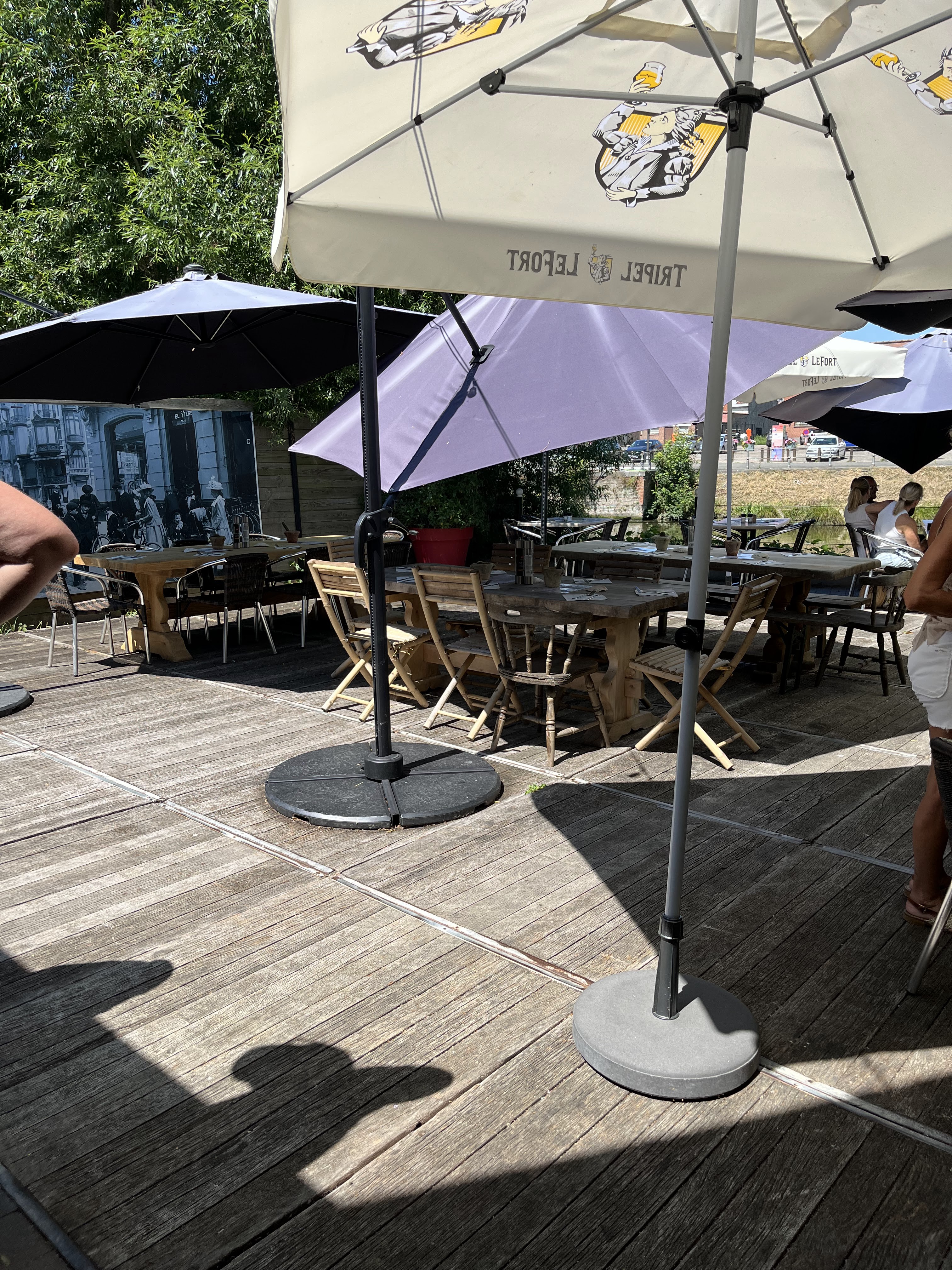 A eviter absolument ! Pourtant le cadre extérieur est sympa. Les serveurs sont dépassés, surtout le patron qui est fort désagréable. La table n a pas été nettoyée et un verre à été oublié. Aucune excuse, bien contraire, le patron m a balancé le vêtre sur la table. Je n irai plus, je préfère traverser le pont et aller boire un verre au musée de la bière. Ils sont très sympathiques