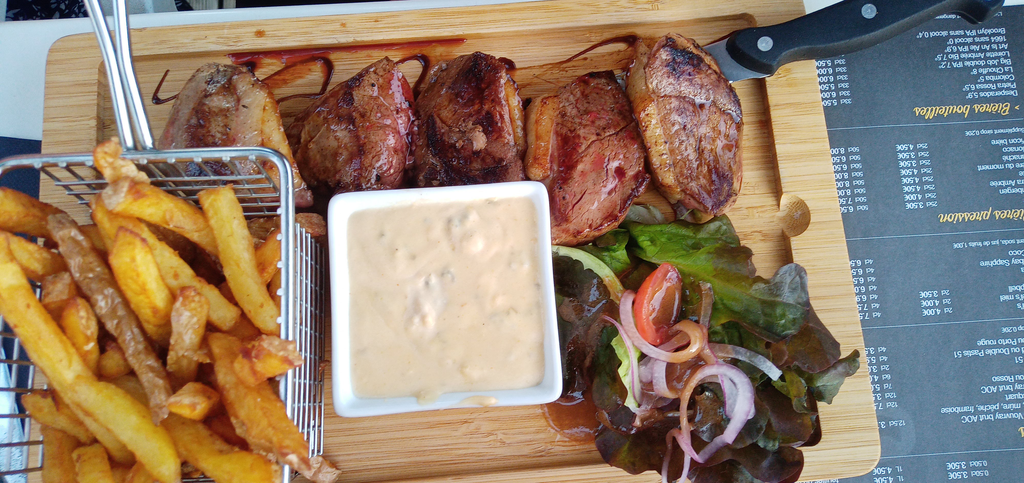 Tables et chaises en terrasse commencent à être usagés, pour la plancha où des frites il faut réclamer des serviettes en papier car c'est pas servi avec,le minimum quand on sert des frites avec des paniers métallique ajourés c'est de mettre une assiette en dessous !