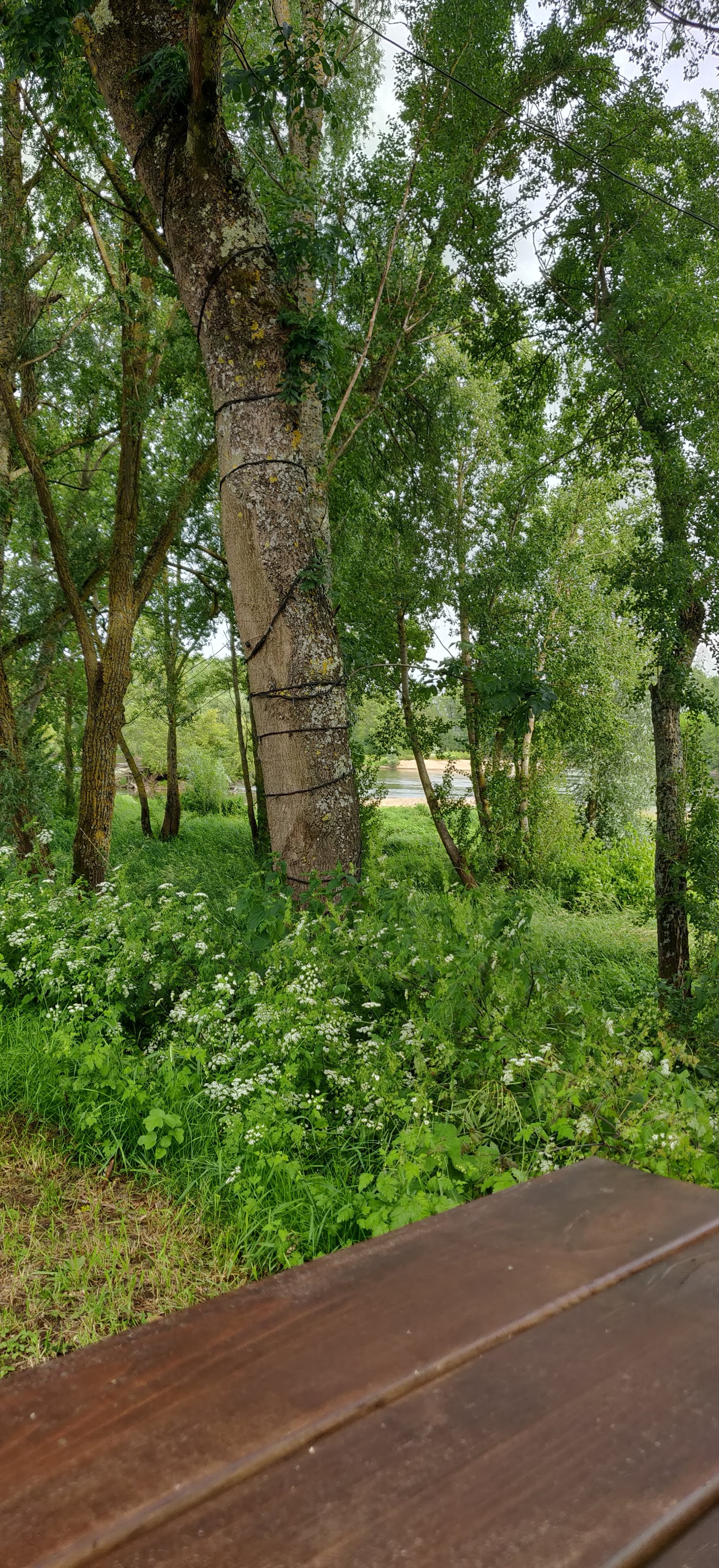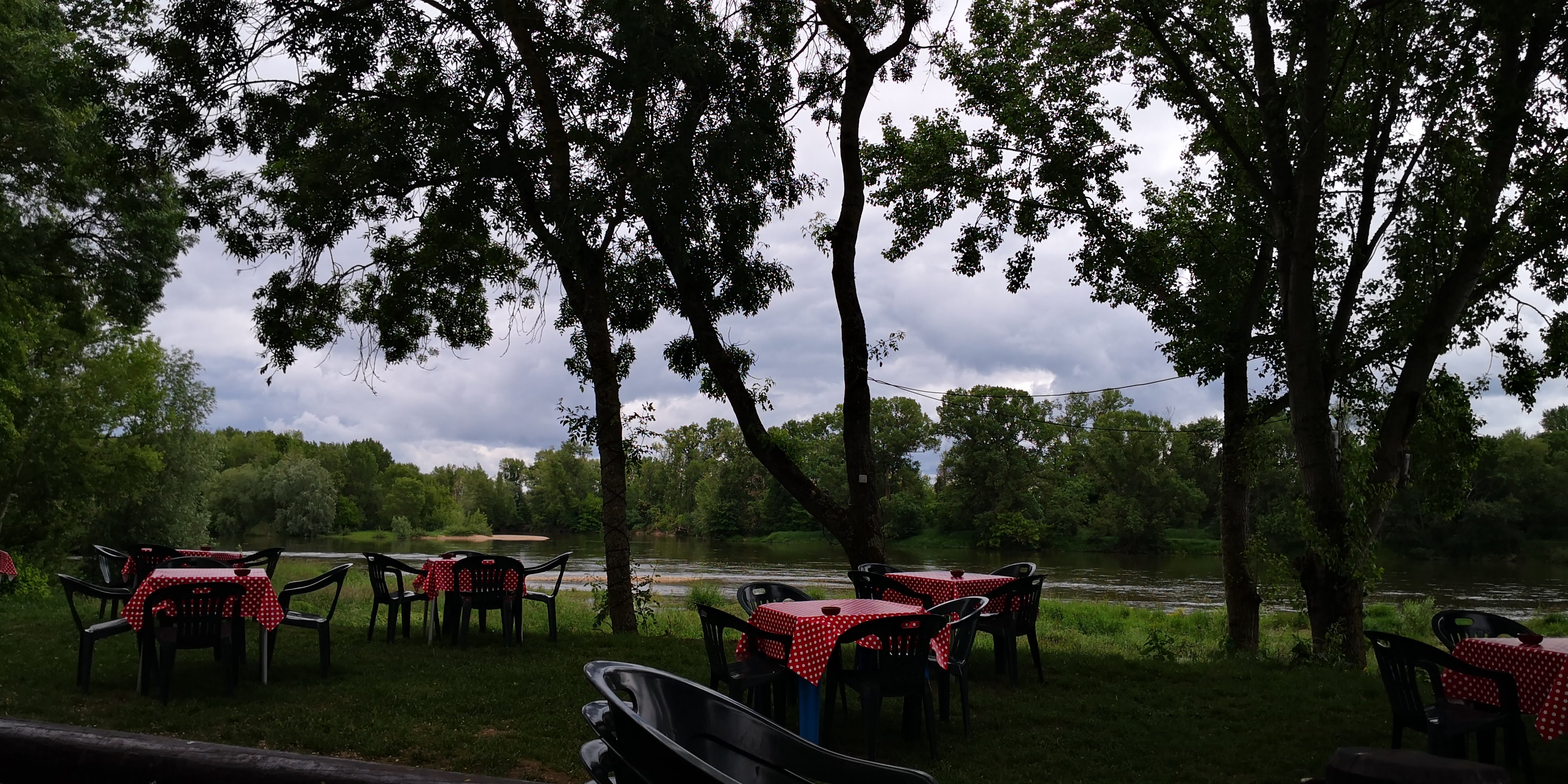 Grandes tables à l'ombre des arbres avec vue sur la Loire : idéal pour un repas de famille. Service souriant.