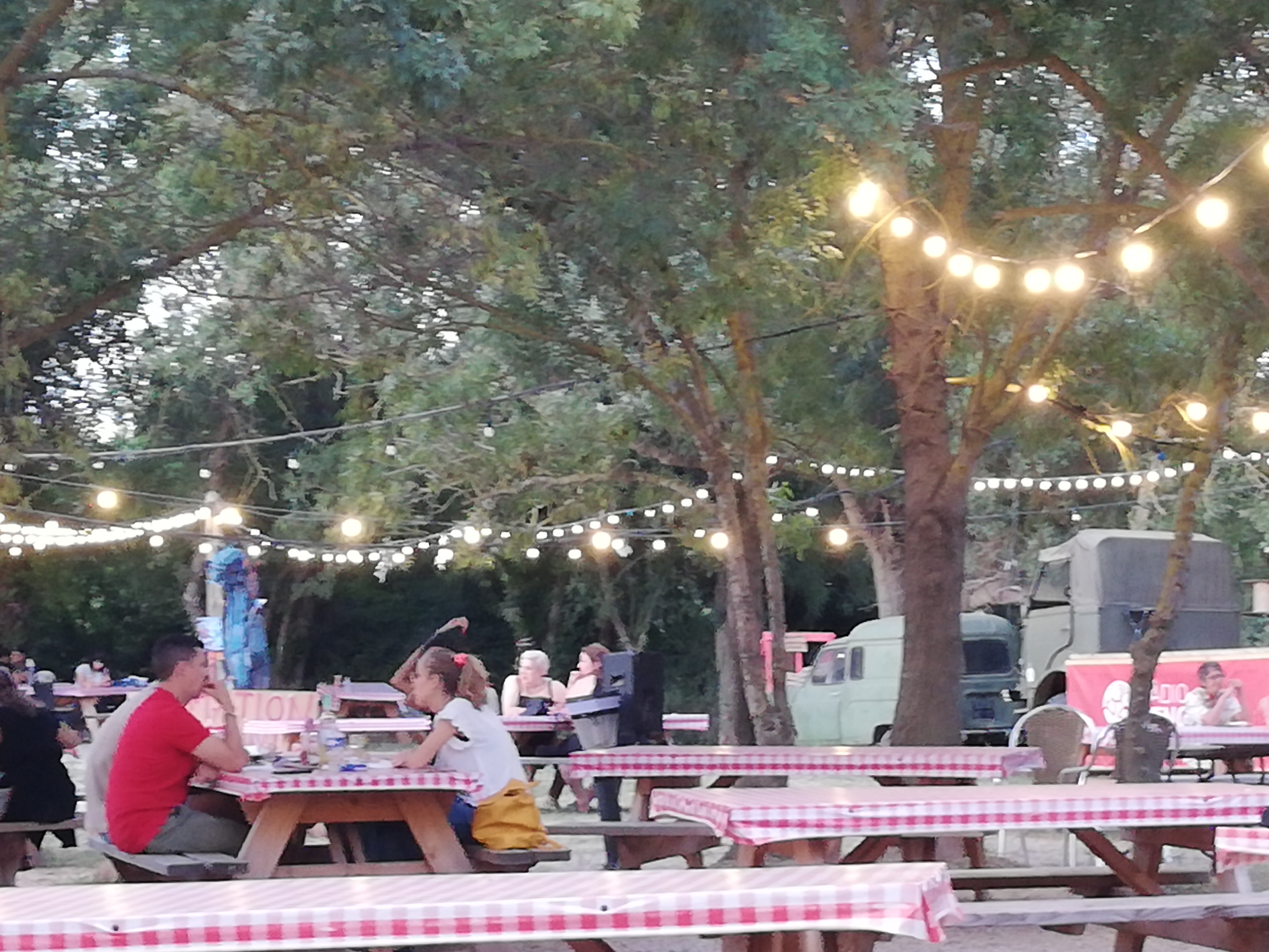 Un endroit très sympa pour boire un verre grignoter entre famille ou amis. Le lieu est improbable, j'ai bien cru que mon GPS avait complètement déraillé !!! Une guinguette très sympa avec des fois trucks qui permettent d'avoir un large choix pour boire et manger. Le personnel est très sympa. Pas d'animation musicale ce soir là mais ma fille a pu monter sur les planches pour un petit spectacle de bolas lumineuses. Un grand merci à l'organisatrice pour avoir permis cela. Ne pas hésiter à appeler pour tous renseignements. Le personnel est adorable. A recommander si vous passez dans le coin. Nous reviendrons c'est sûr.