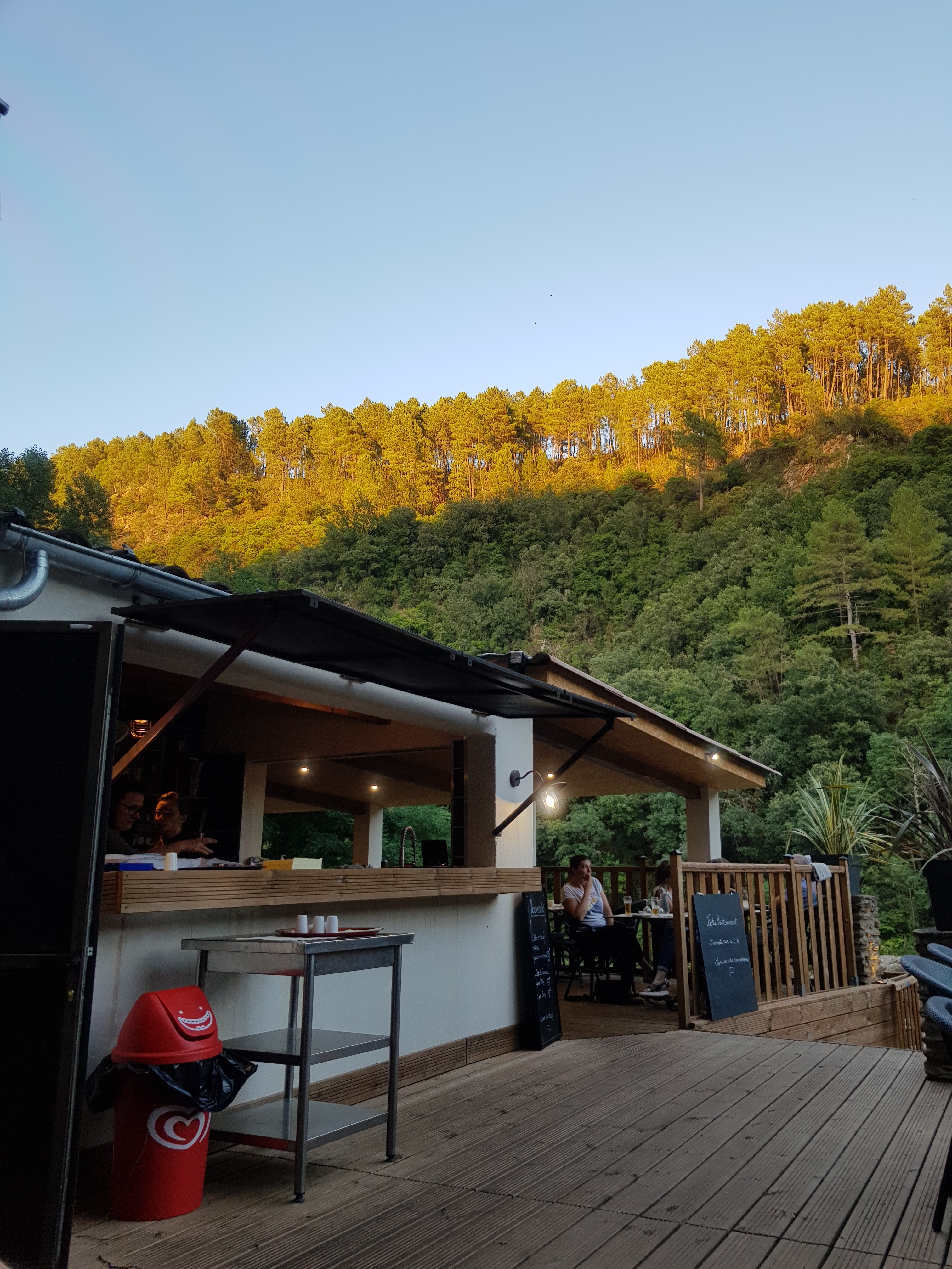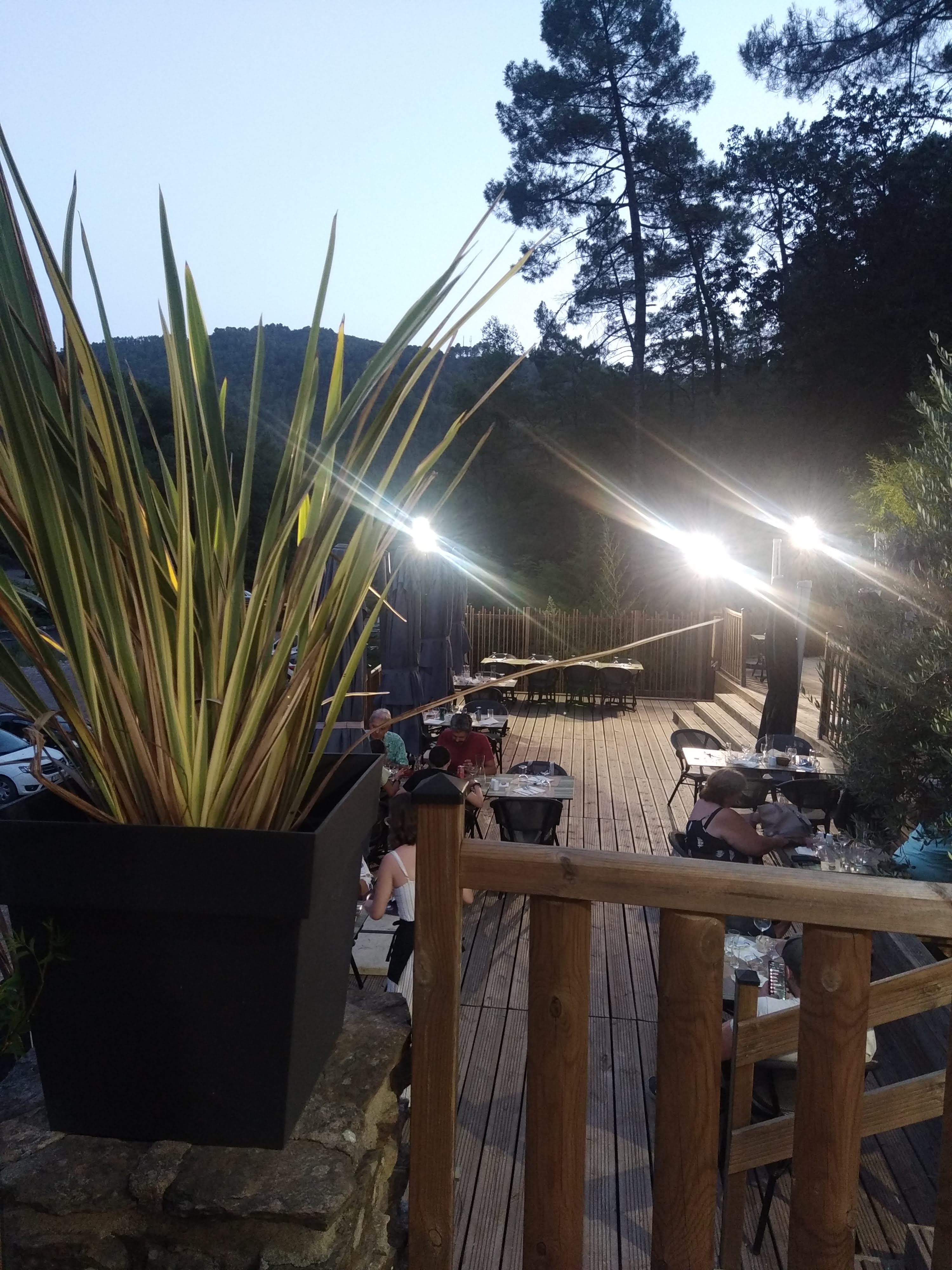 Bien pour prendre un pot après la baignade. Les toilettes sont propres et modernes. Le dîner, bof. Verrine de roquefort aux figues: mangeable et bizarre; le pâté, accompagné d'une poignée de salade sans assaisonnement: de blêmes et grasses rillettes de canard. L'entrecôte est cependant bonne et la cuisson comme demandée. Le personnel ignore que, même dans une guinguette, on n'apporte pas à table la bouteille de vin déjà débouchée. On nous a placés d'autorité sur la terrasse sous toit contre le mur de la cuisine (alors qu'il y avait plein de bonnes places qui n'ont finalement jamais été occupées) : côté paysage, nous avons seulement joui de la vue du plafond. Fin tristounette de nos vacances dans les Cévennes.