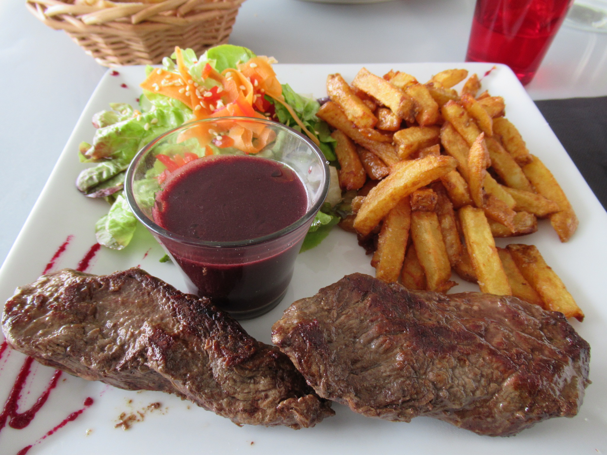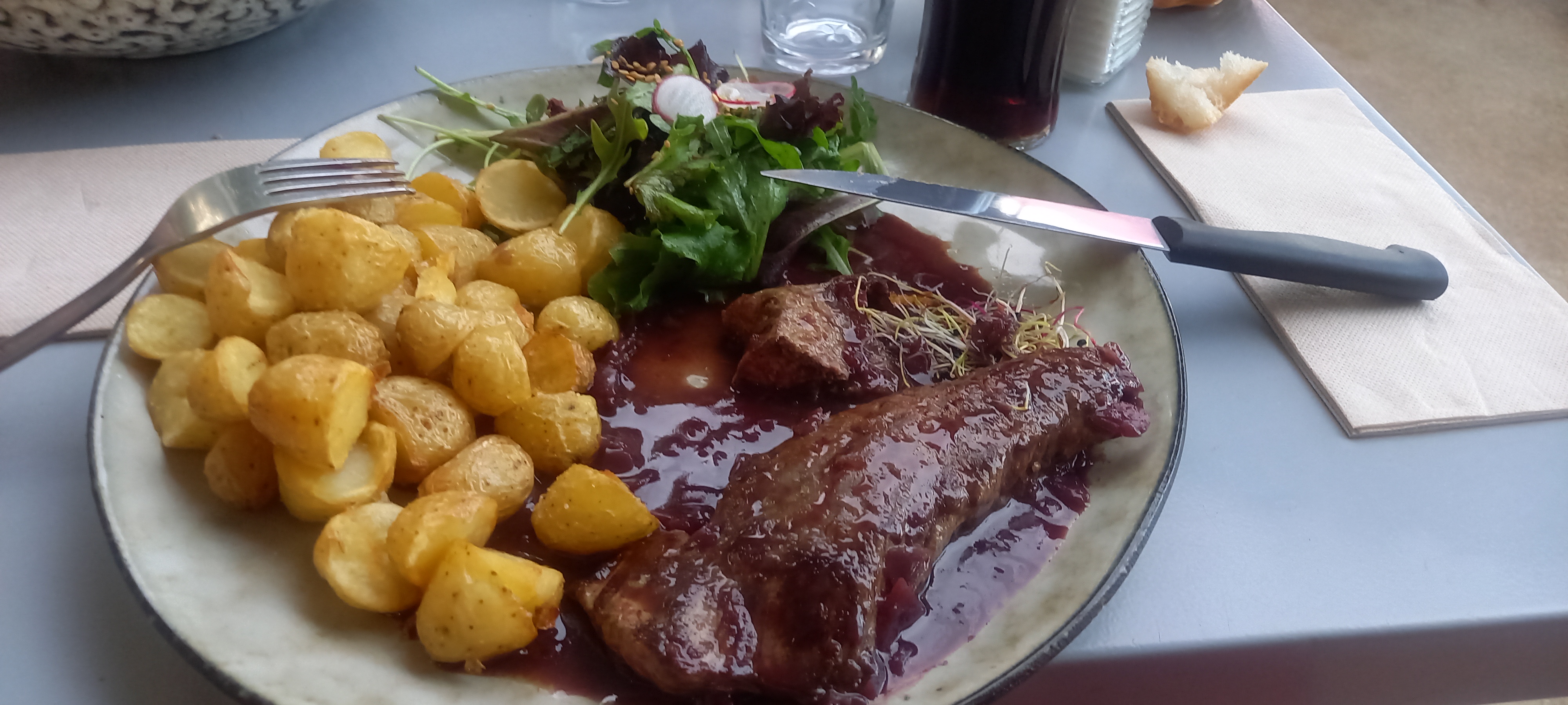 Très bonne pièce de boeuf accompagnée de petites pommes de terre et de salade. Vin blanc de Saumur recommandé par la gérante qui était bon. Rien à redire. Un bon moment au bord de l'eau avec la vue en prime sur le village en fin de journée. Prix correspondant à un restaurant normal.
