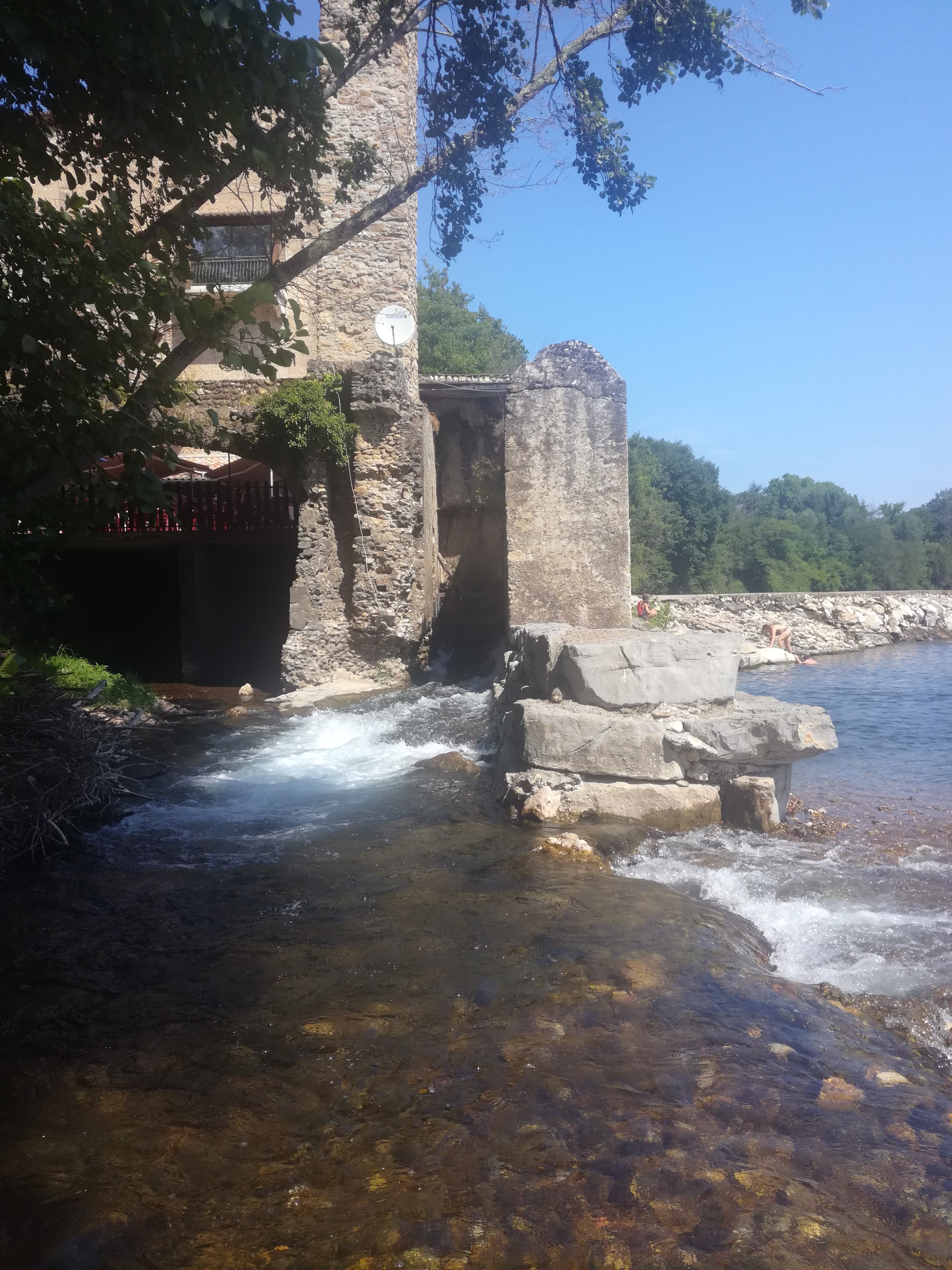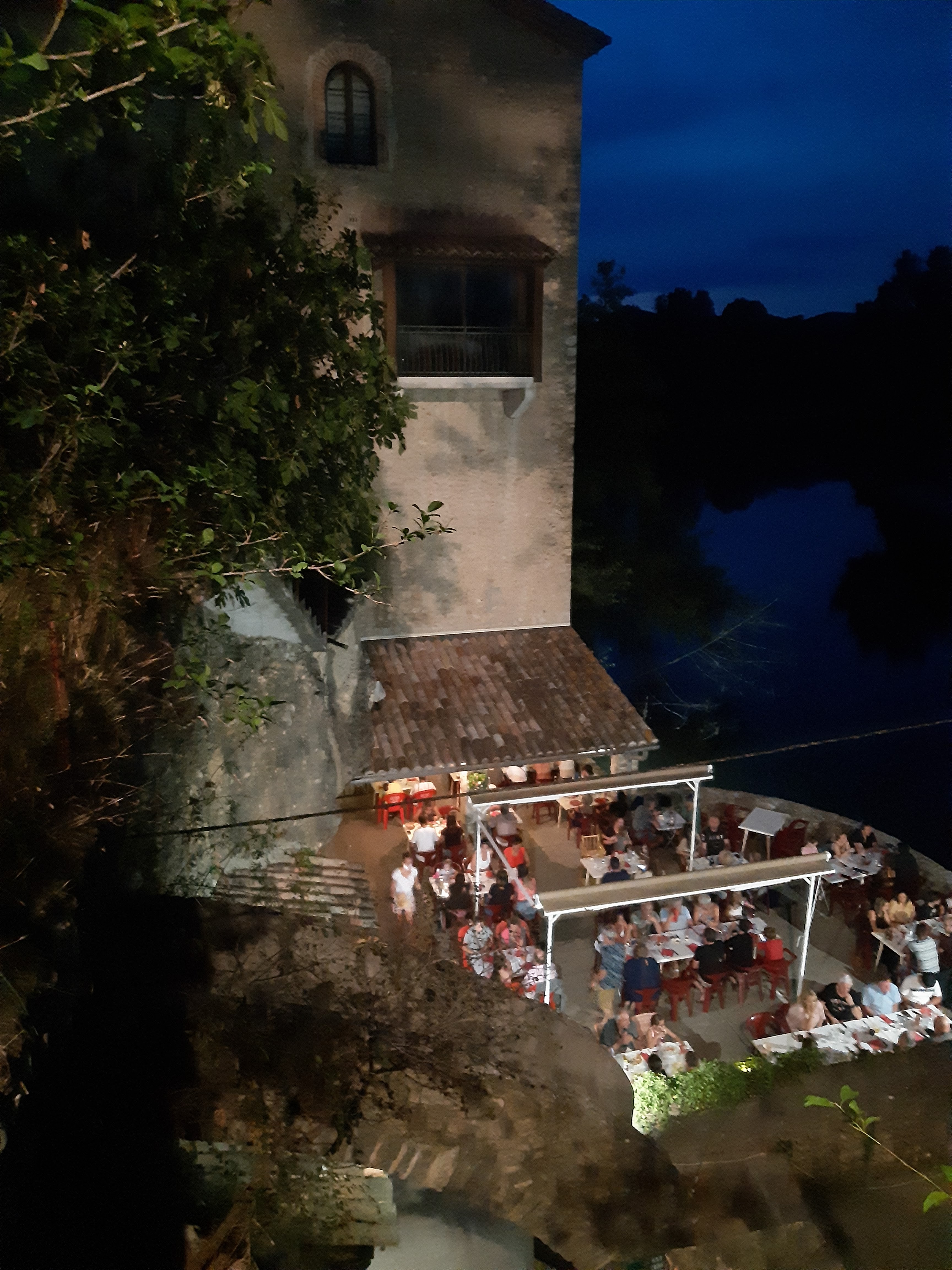 Endroit atypique, ancien moulin, la terrasse domine la Ceze et le soir c super.. pas de musique mais entendre l'eau qui coule, ça apaise...attention, pour y descendre il y a qques marches..mesdames pas de talon, la cuisine est simple mais gouteuse..