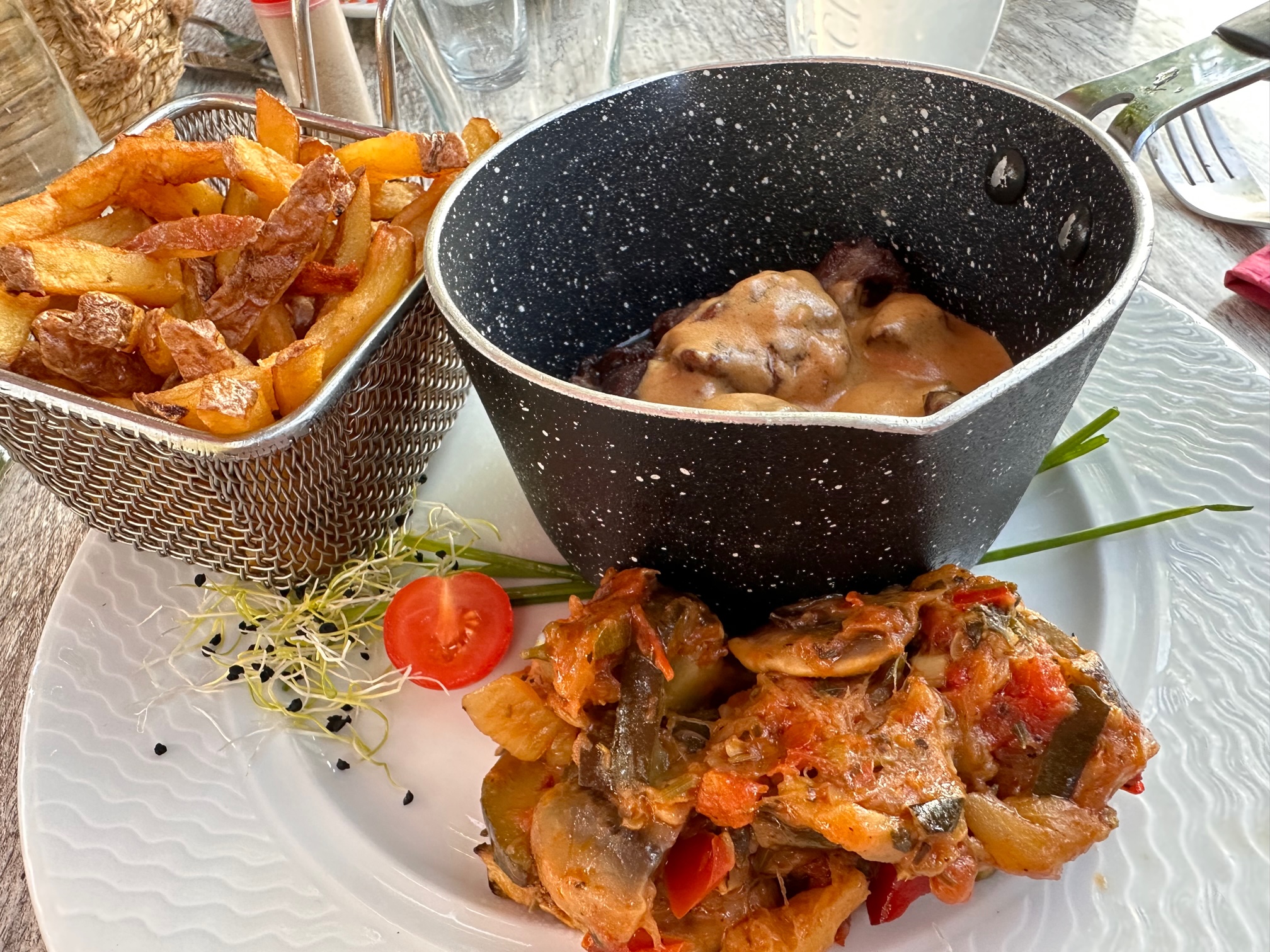 L’équipe est vraiment très agréable. L’endroit est bucolique. En revanche très déçu : au menu la pièce de boucher n’est pas une pièce de boucher mais de l’andouillette donc de la charcuterie ; A la carte c’est cher une petite assiette de crudités dite végétarienne avec surtout de la salade , 2 carottes cuites et quelques poivrons et courgettes à 9,50 pour une petite assiette….donc bizarre c’est crudités qui sont en partie cuites. Assez déçue du rapport qualité prix . Sinon le cadre plage est sympa