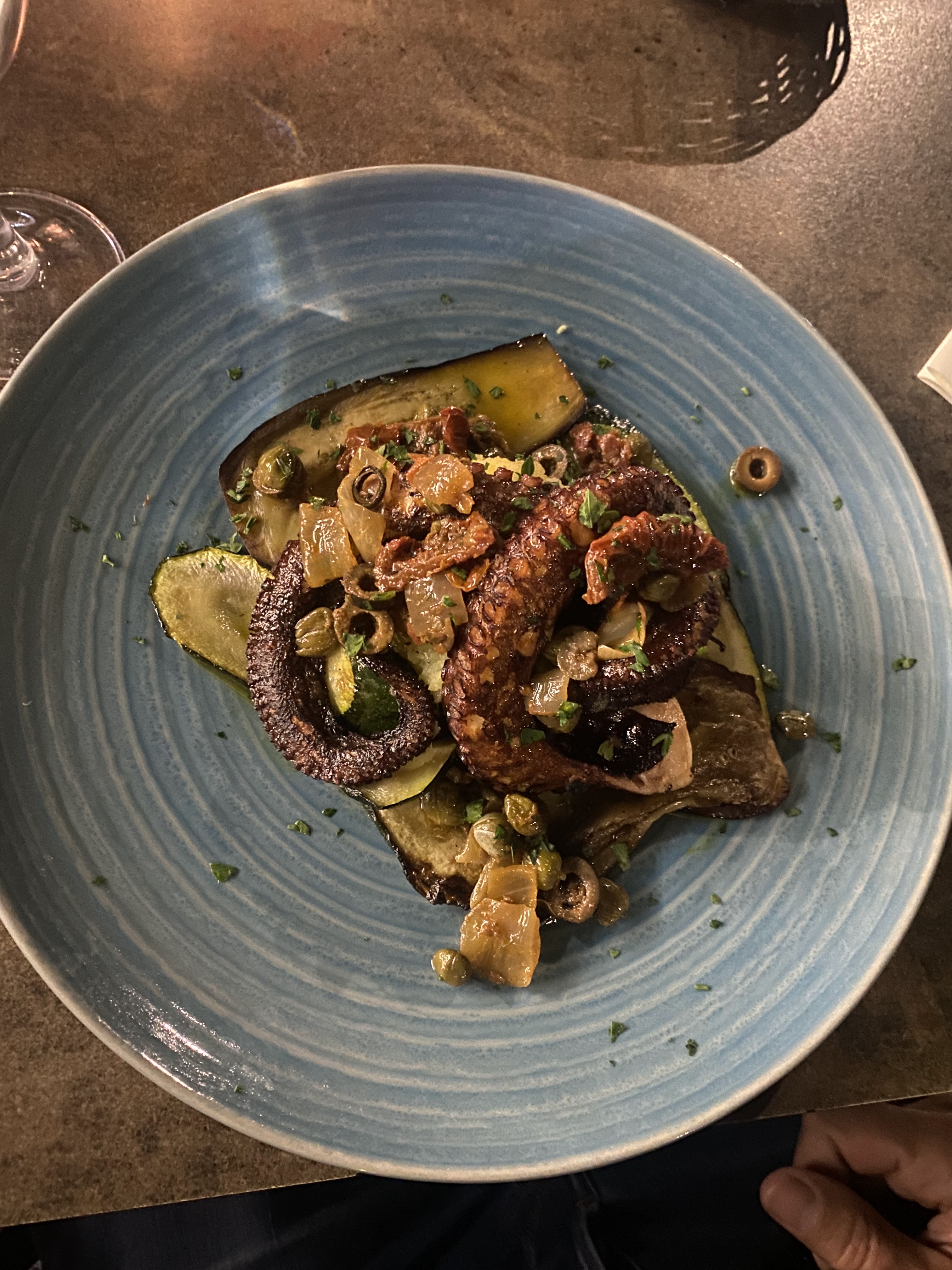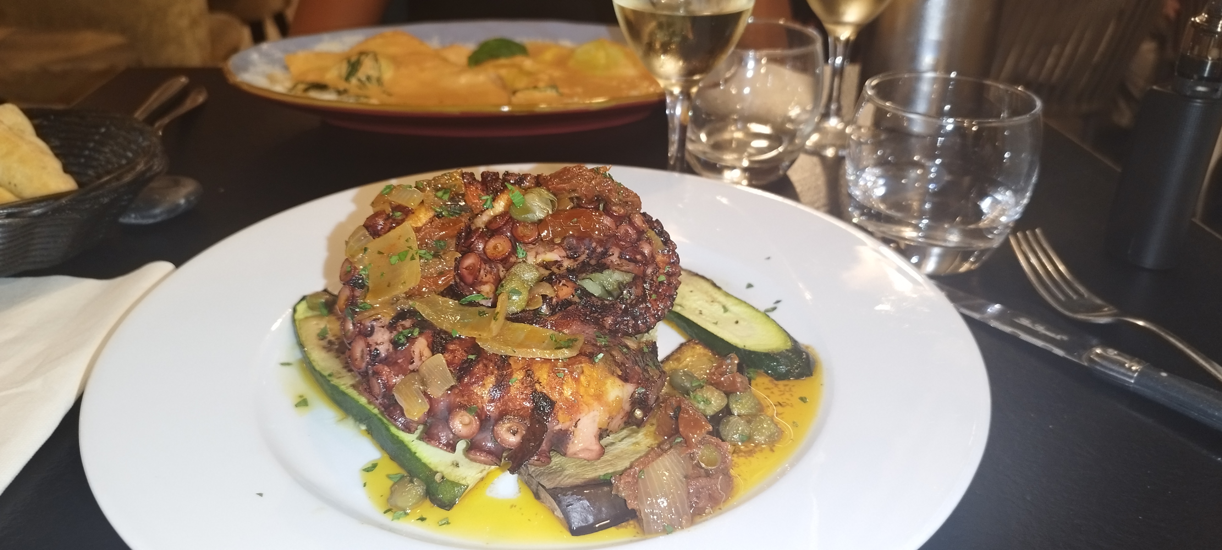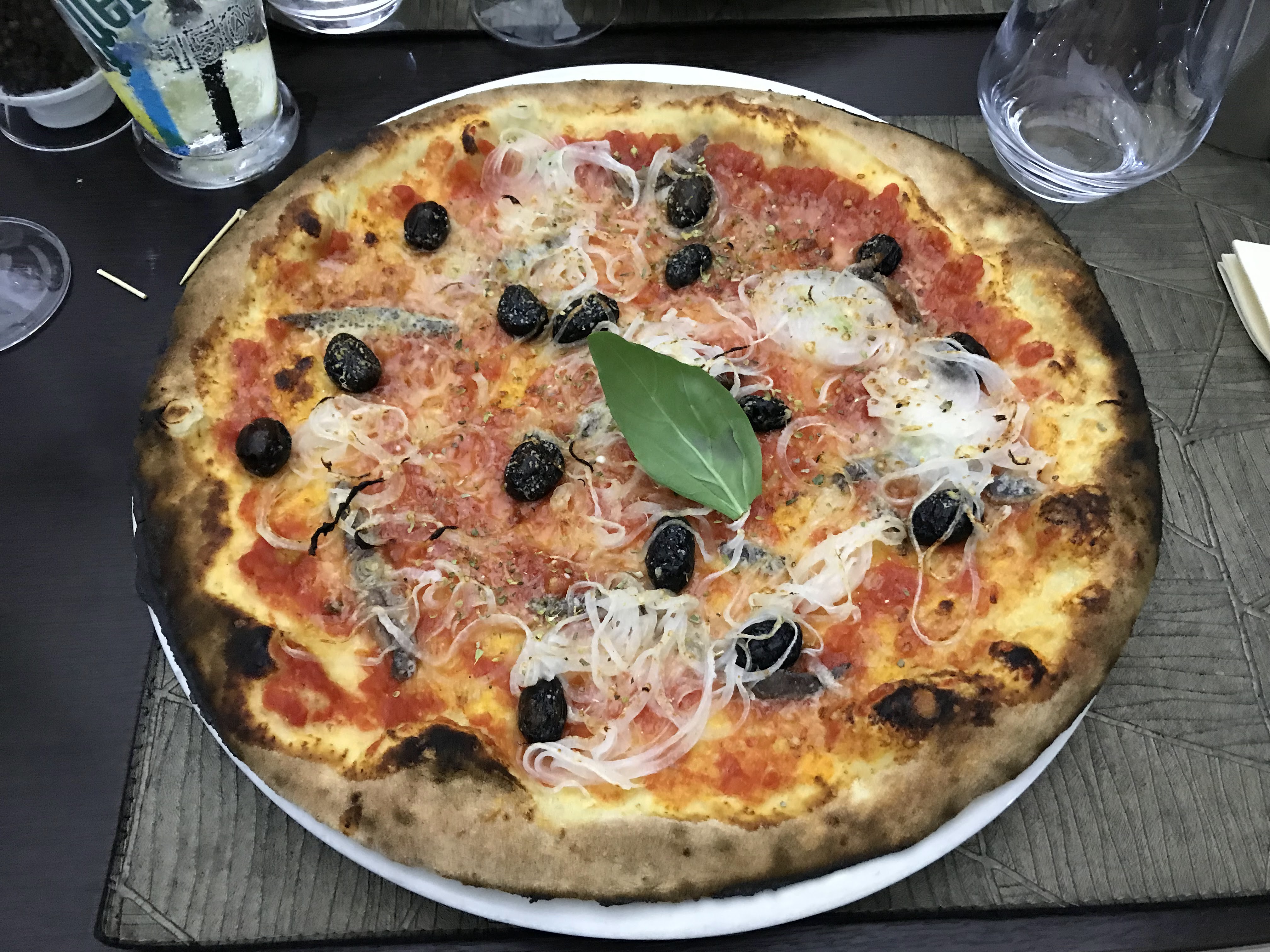 Commençons par du positif : bord de mer, cadre plaisant, accueil professionnel, vaisselle classique. La carte offre par ailleurs quelques originalités comme l'assaisonnement intéressant des deux tartares de poisson - thon et saumon - que je n'attendais pas dans un restaurant italien. Kiwi, lychee, poivre rose et citron vert pour le saumon que j'ai testé et particulièrement apprécié après l'avoir assaisonné de jus de citron, d'une pointe de sel et poivre du moulin. L'alliance aigre doux sied à merveille au saumon cru. Belle découverte. Le poulpe à la plancha quant à lui est très esthétique. Impressionnant même. Mais comme j'avais décidé d'opter pour un fritto misto et une pizza (végétarienne partagée) - deux grands grand classiques - je m'y suis tenu. J'avoue, point de déception, être resté ici sur ma faim: si la friture mixte était correcte, je m'attendais à bien mieux que cela avec la pizza dont la pâte n'était pas, à mon sens, ce jour là, à la hauteur de la gastronomie italienne et de son recent titre de patrimoine mondial de l'UNESCO. Fort heureusement la garniture est venue avantageusement rattraper ce manque, grâce notamment à la qualité du coulis de tomates - d'une couleur parfaite et sans la moindre acidité en bouche - des aubergines et des champignons frais. Avec la tarte tatin et la tarte citron, également décevantes, ce sont là des pistes d'améliorations que je suggérerais volontiers. A tel point que j'ai regretté de ne pas avoir testé le Tiramisu, aux dimensions pharaoniques, réellement impressionnant et magnifiquement présenté dans une verrine surdimensionnée qui avait l'air bien gourmand. Pour terminer sur une note très positive, les portions sont généreuses, la décoration des assiettes élaborée et très appétissante et, pour courroner le tout, quelques pieces de musée avec une trancheuse à jambon manuelle absolument magnifique pour décorer le tout.