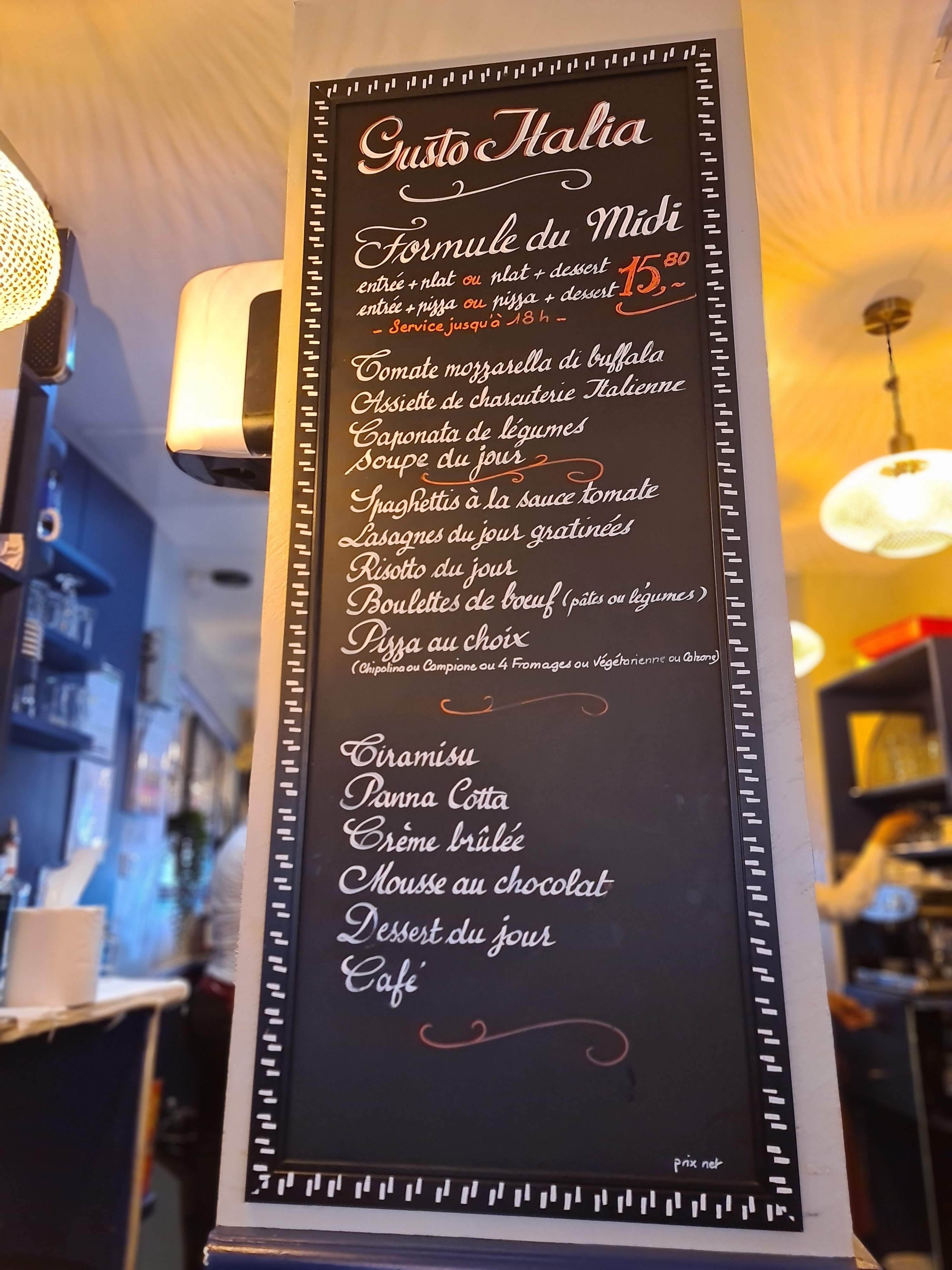 Très bon rapport qualité/prix. Repas copieux italien. Nous avons été étonné du prix qui est bas pour Paris. Je recommande fortement.