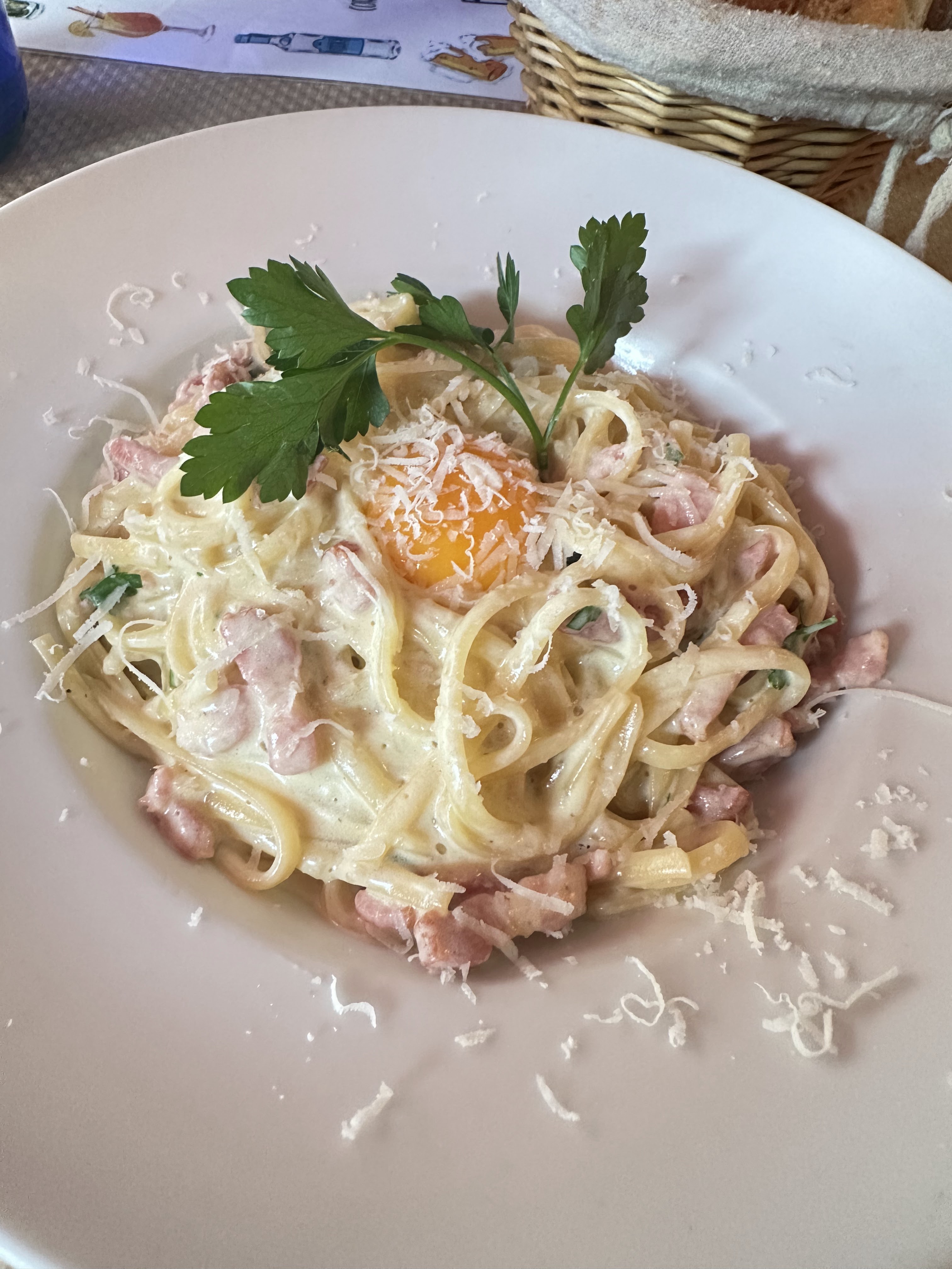 Les pâtes au bacon et à la crème au jaune d'œuf sont délicieuses. La quantité de crème sur le tiramisu est choquante. Le pain est moelleux et différent du pain français des autres restaurants.