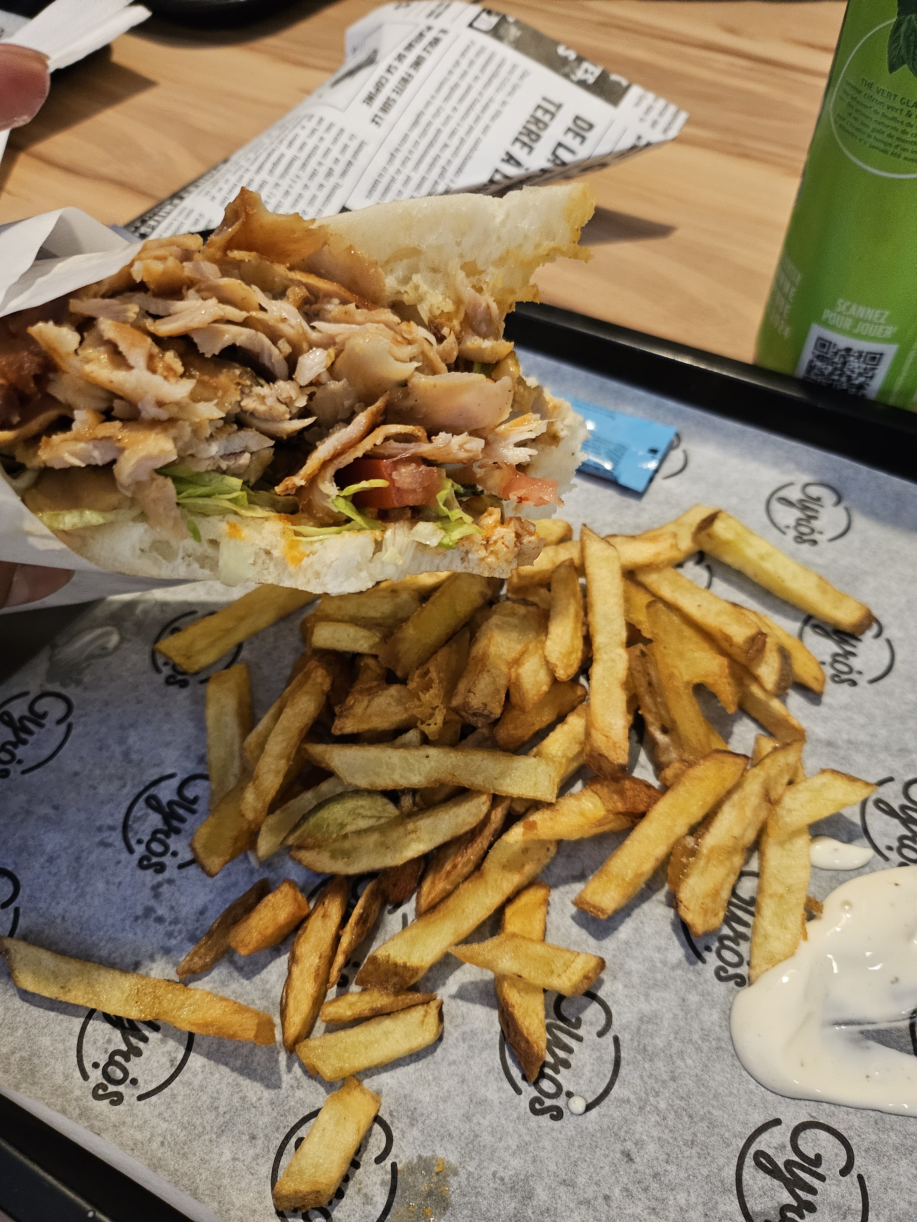 Je suis un habitué du Gyros C’est super bon Les frites sont un peu trop cuites mais à part ça c’est nickel