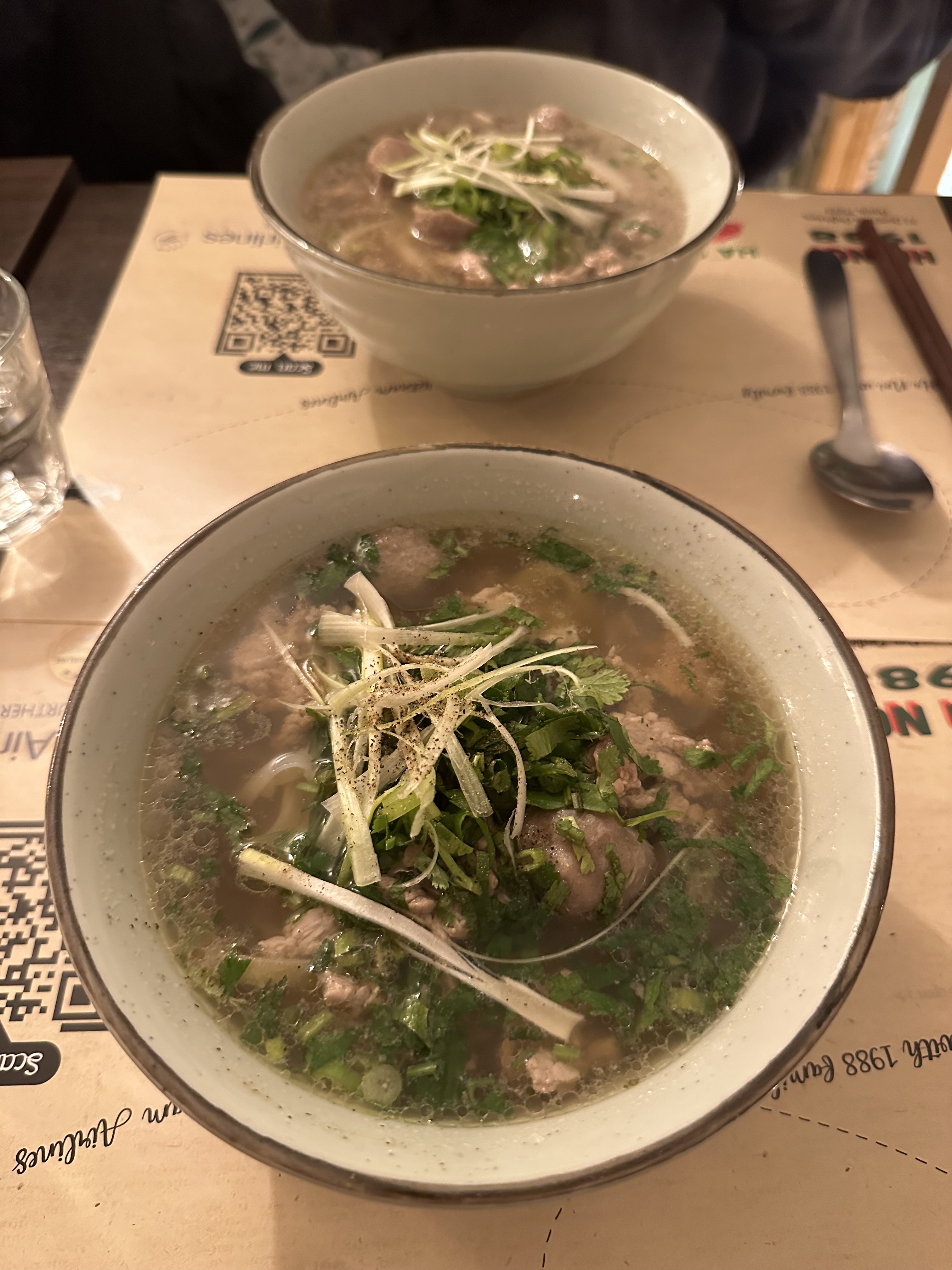 Nous sommes venus manger le midi et la salle est vraiment tout le temps remplie. L’espace à l’étage est vraiment pas possible à supporter. Il fait beaucoup trop fermé, il n’y a aucune entrée d’air (pas d’oxygène) et chaud alors qu’il fait froid dehors… il y a une Clime allumée mais elle est cassée visiblement car on sent le vent frais uniquement quand on est juste devant. On a du attendre pour avoir une table en bas et on doit réclamer les couverts et le verre nous même… Après la cuisine est rapide et bonne (beignet à l’huile et le pho) cependant pour les nems qui sont consistants mais il n’y a que des vermicelles dedans, le boeuf est inexistant au niveau du goût et physiquement. La quantité du pho est trop minim… on a que 100g de vermicelle et c’est bien mon premier pho où le boeuf est haché. Le prix est bien trop élevé pour la quantité mais bon je pense que c’est le lieu qui joue beaucoup plus sur ce prix. Dans l’ensemble c’était correct mais c’est loin d’être le meilleur pho de Paris comme les rumeurs cours à Paris…