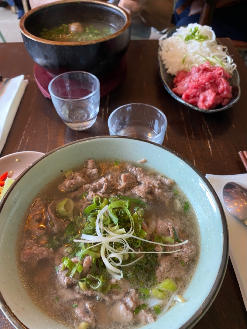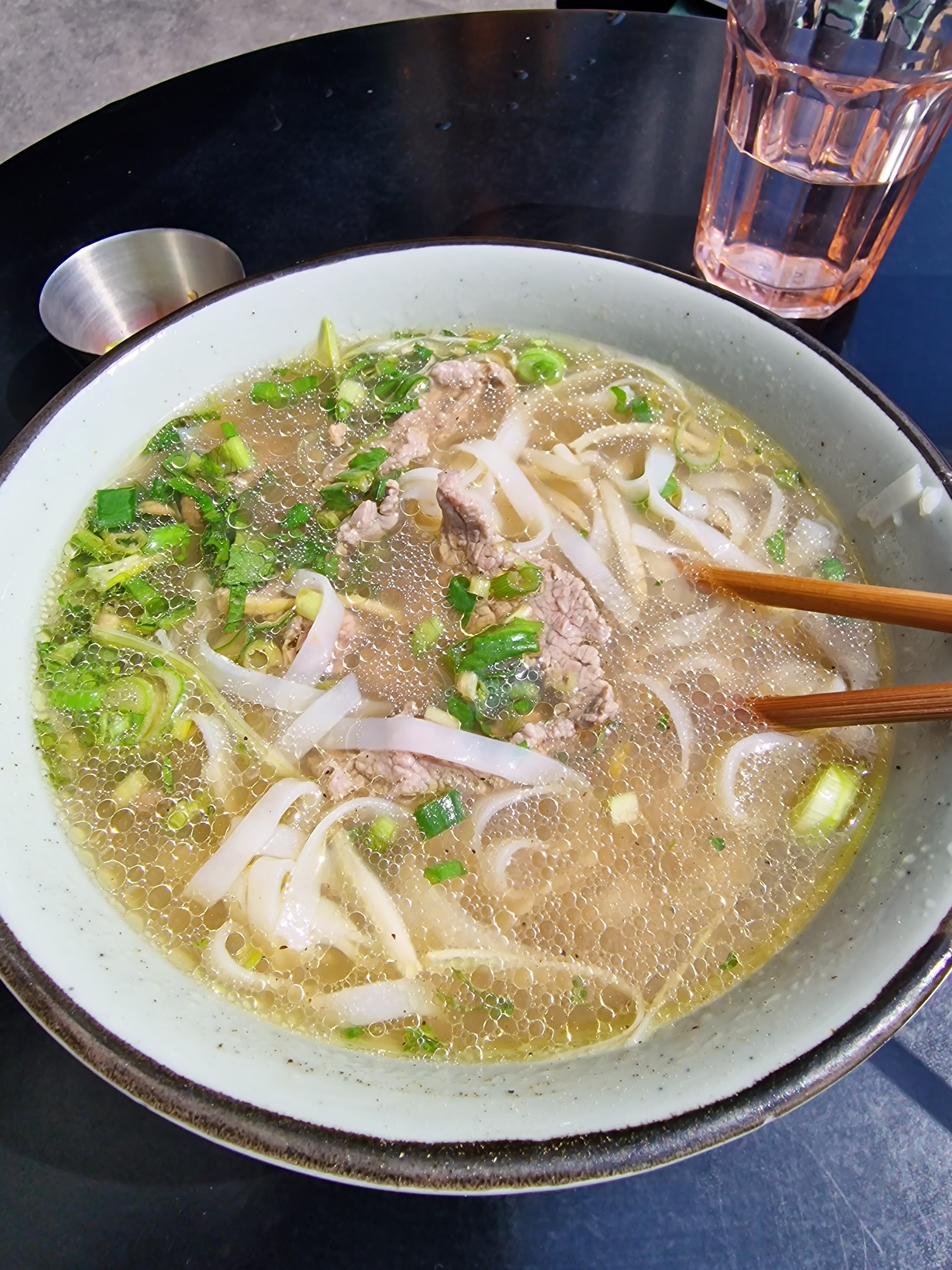 Pho tai tres bon. Le bouillon est excellent. J’ai trouvé que les nouilles étaient trop cuites. Les beignets frits sont bons, pareil pour la café dalgona. Je vous recommande les nems qui sont très bons Point négatif : les toilettes, la porte ne se ferme pas