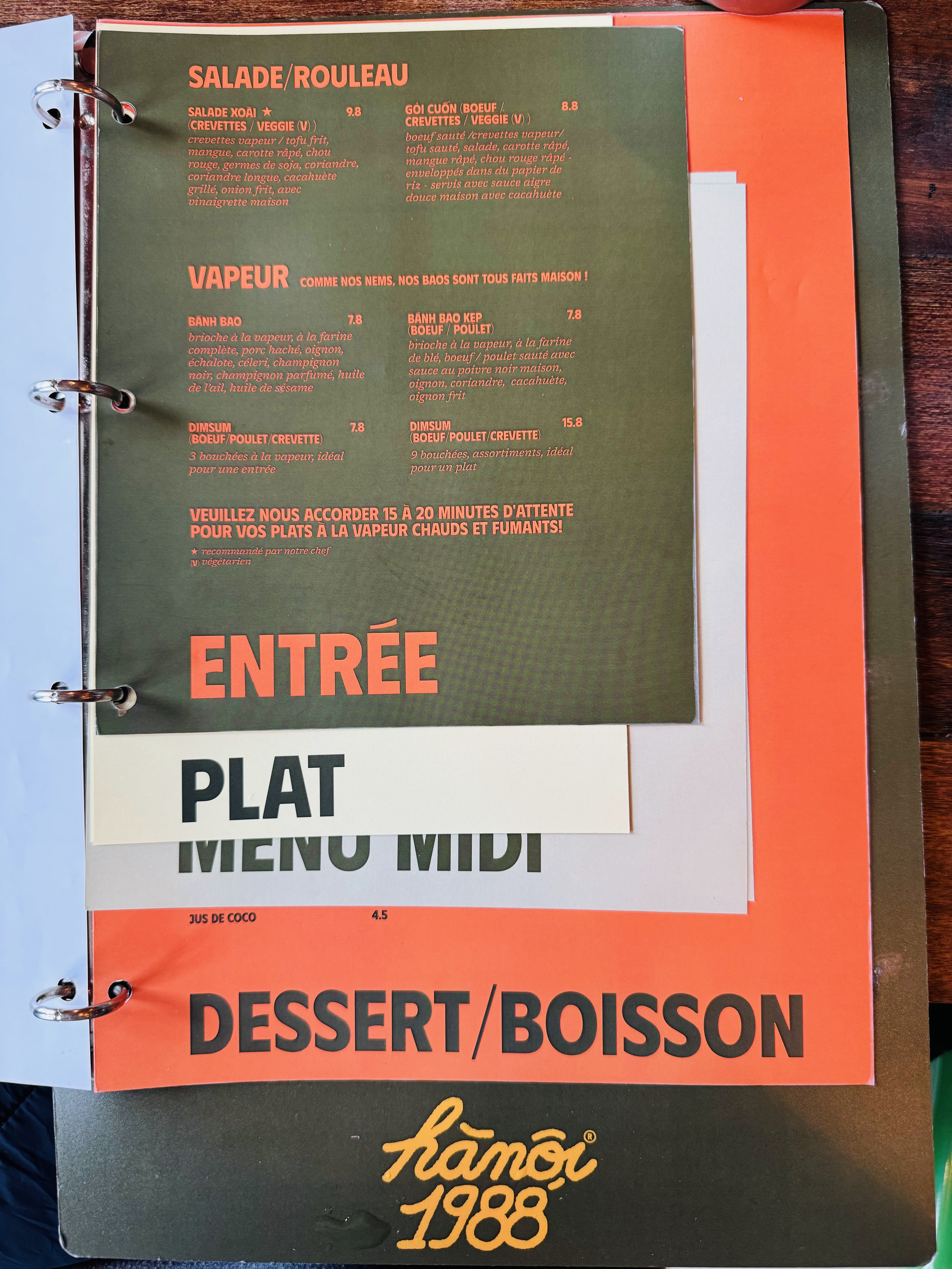 Nous avons attendus 1h20 devant le restaurant. Après plusieurs sollicitations le serveur nous fait comprendre à demi mot qu’il ne trouvera pas de tables pour nous. Bref une soirée en famille gâchée. Les plats que nous avons vus passe devant nous pendant 1h20 avaient l’air excellent il n’y a aucun doute là dessus. Mais le service et le professionnalisme des serveurs était pitoyable. Beaucoup de restaurants sont excellents à Paris, la différence se joue dans les détails, chose que Hanoï 1988 n’a pas encore compris. Je déconseille.