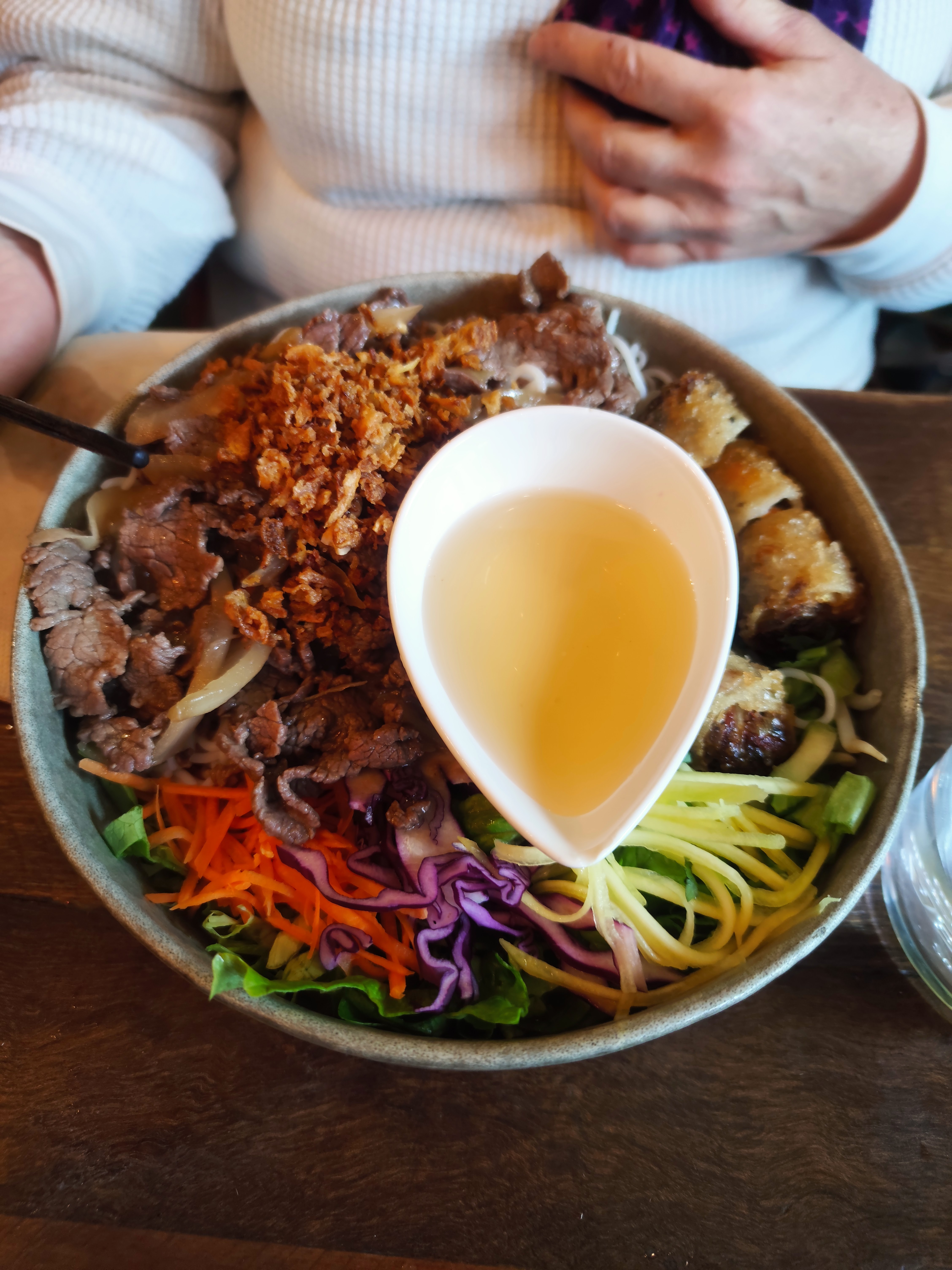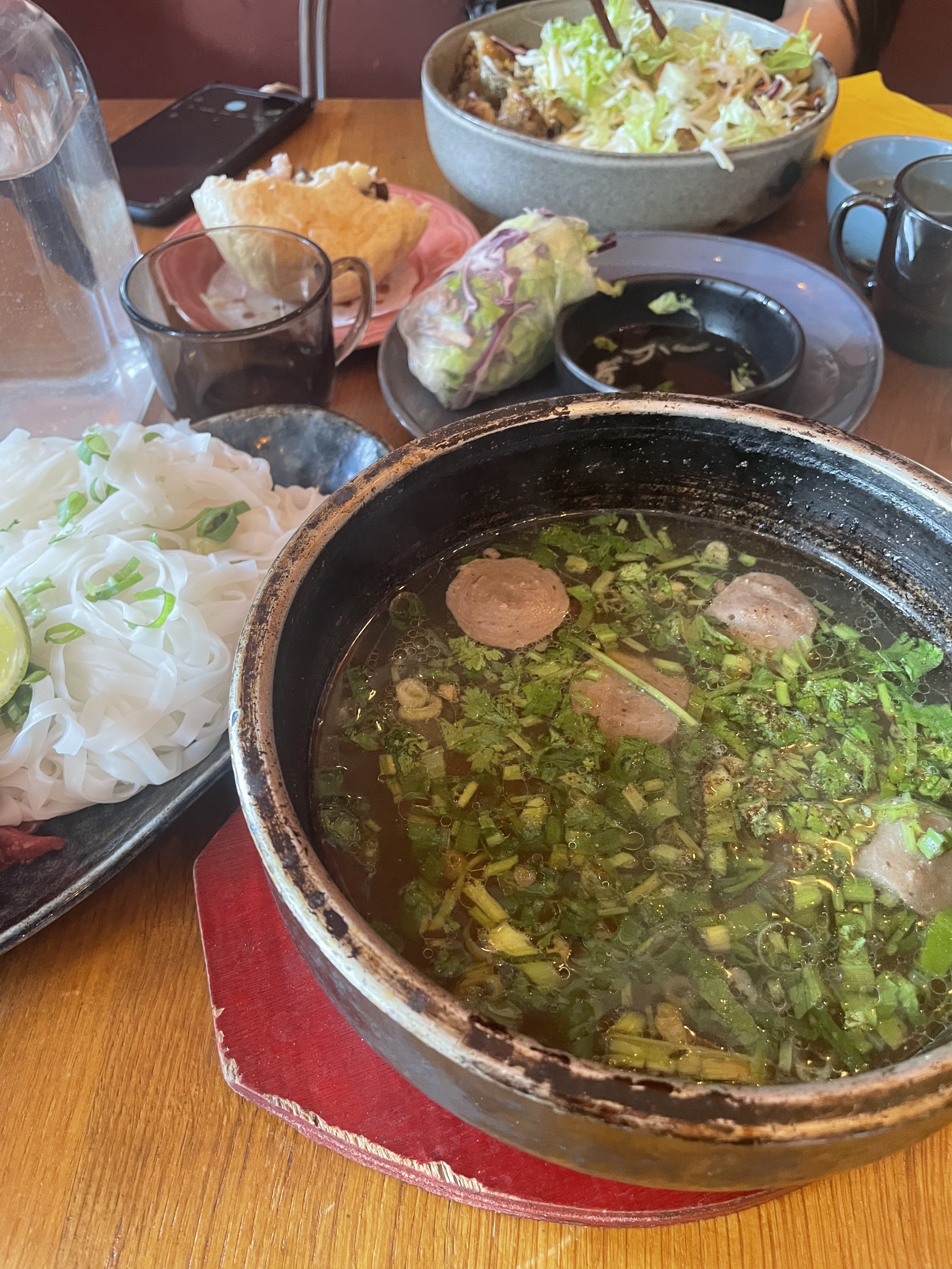 Il y a pas mal d'attente à prévoir mais la qualité est au rendez-vous 😊 les nems étaient juste délicieux, on sent que c'est fait maison et le bobun était également très généreux en quantité. Pour le café cot dua, ceux qui ont plutôt un palais sucré vont se régaler 🥥 Pour le pho, le bouillon est très parfumé, ça peut être déstabilisant par rapport à ce qu'on trouve d'habitude parce que le bouillon est plus gras et on est moins habitué vu qu'on consomme généralement des bouillons plus clairs mais il était très bon 😋 seul petit bémol le pho ainsi que les 2 cafés je trouve qu'on manque un peu de quantité, surtout le café sua dua rempli à 2/3 du verre avec 3 glaçons on est un peu juste ☕ mais dans l'ensemble c'était excellent, donc si vous êtes dans les environs vous pouvez y faire un tour 👌