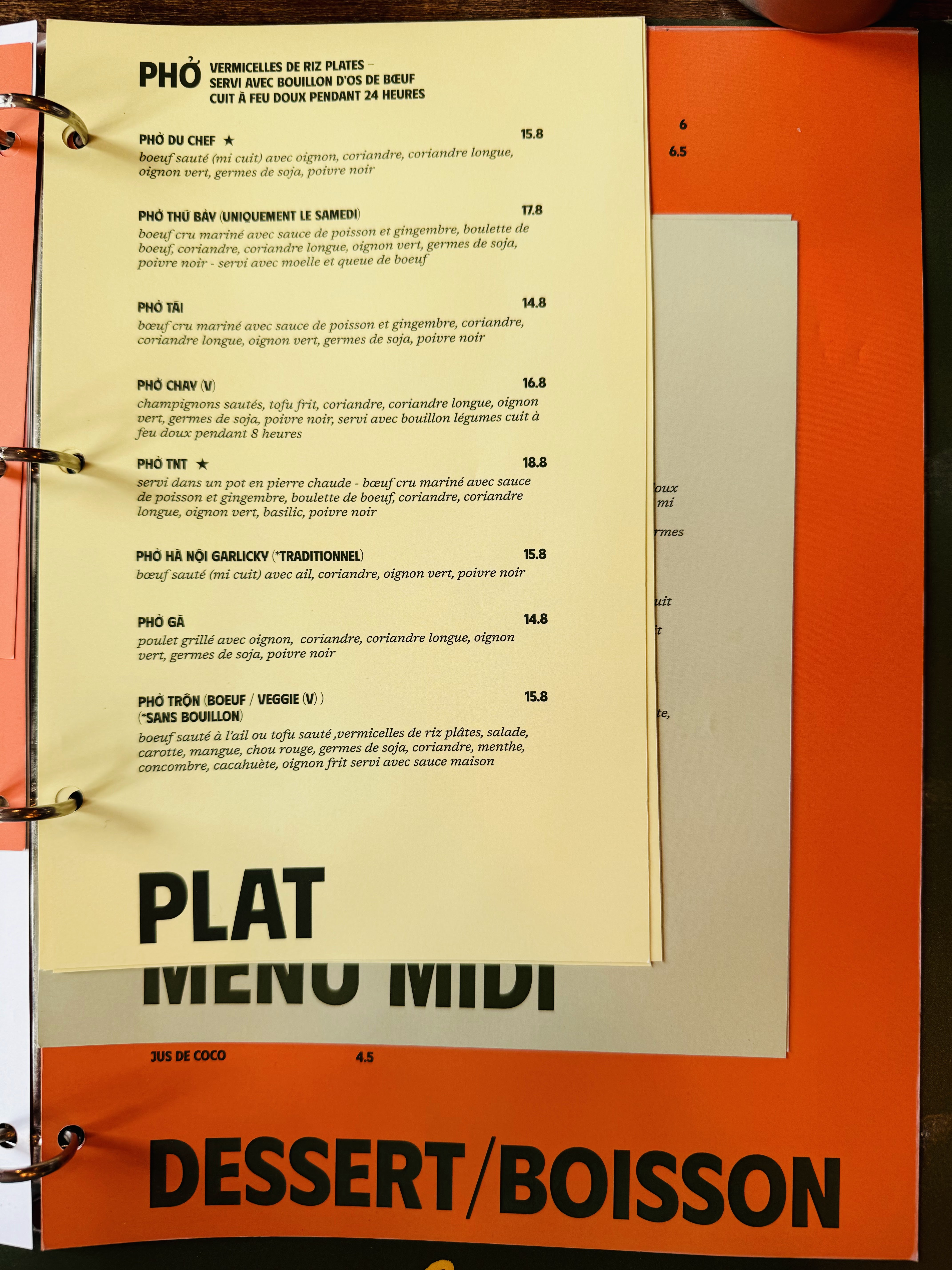 Malheureusement déçue par mon expérience. Pas de file d'attente à l'arrivée, mais une prise de commande un peu longue. Service un peu froid, on a du mal à se sentir la bienvenue dans ce restaurant.. Le Pho Thu Bay est le seul Pho à ne pas être servi en semaine.. (information indiquée nul part) À 13h, il n'y avait plus de Bahn Bao. Nous nous rabattons sur des Bahn Bao Kep et des Pho Tai. Malgré le prix un peu élevé pour un seul Bahn Bao Kep (comptez 6e pour 1 seule pièce) il était tout de même délicieux et bien fourni. Le pho n'était pas transcendant. Passez votre chemin sur le supplément boulettes à 3€... j'en ai eu 3 qui étaient ridiculeusement minuscules. Pour un Pho à quasiment 20€, je m'attendais à mieux en terme de quantité et de goût.