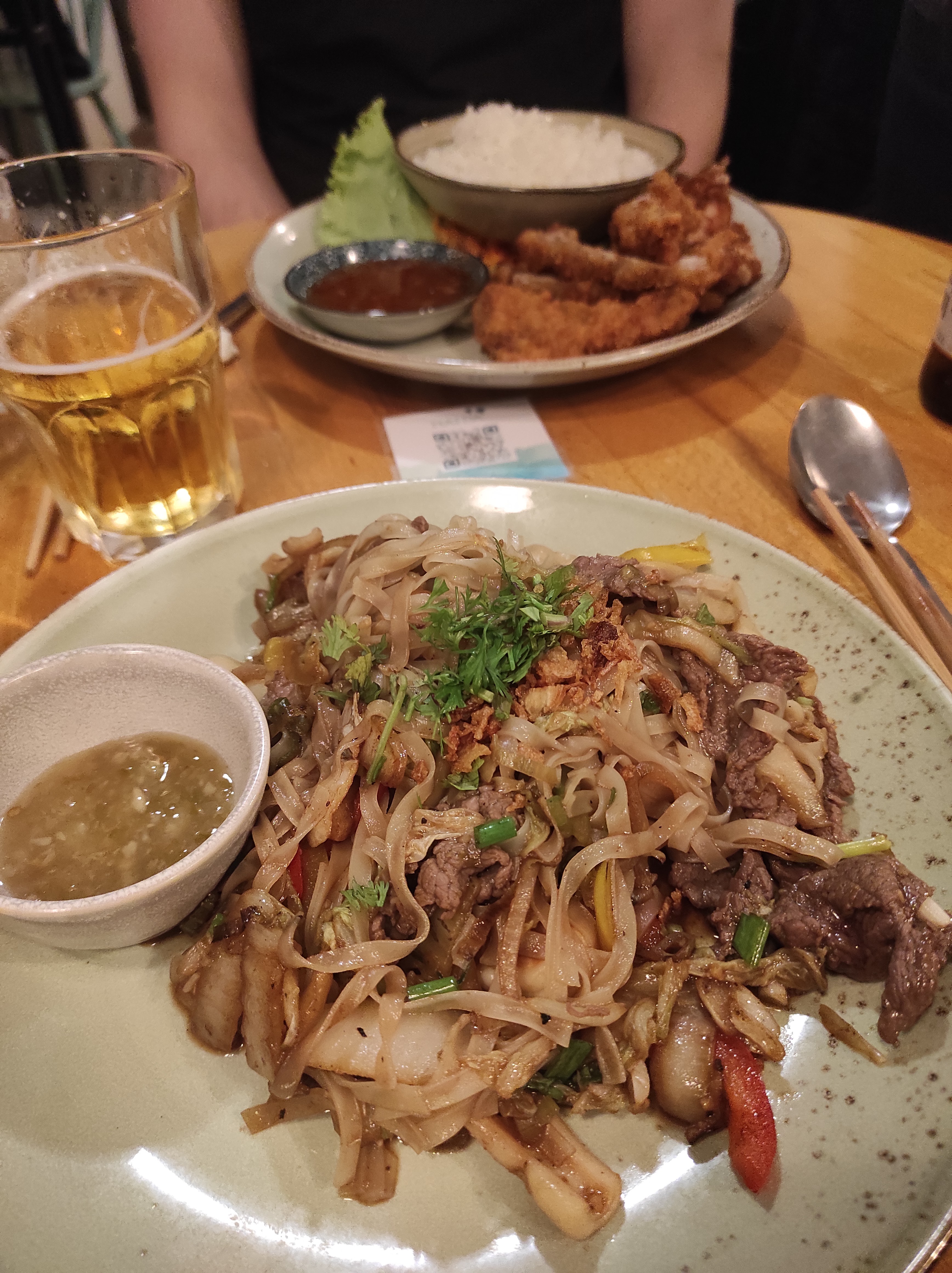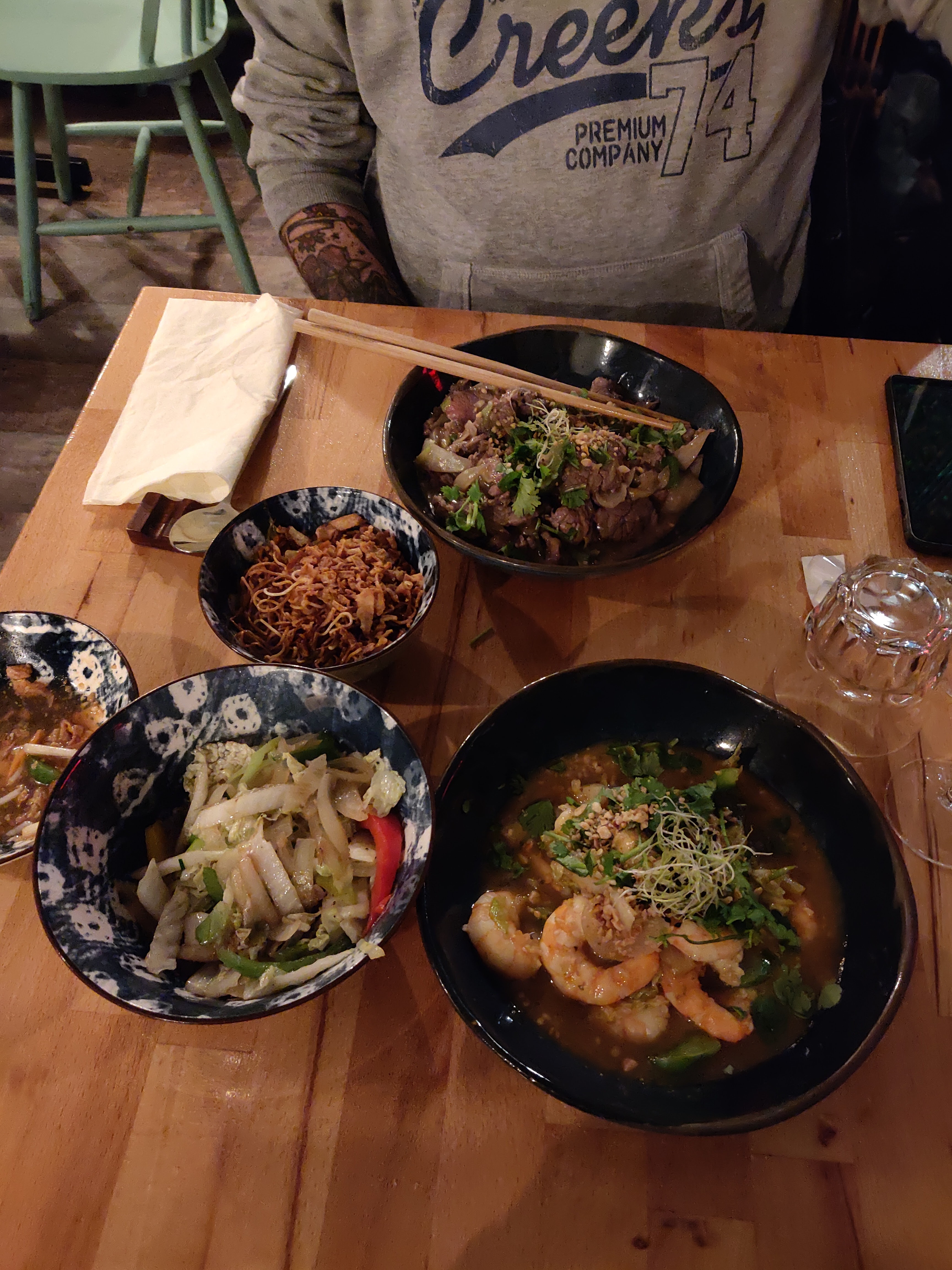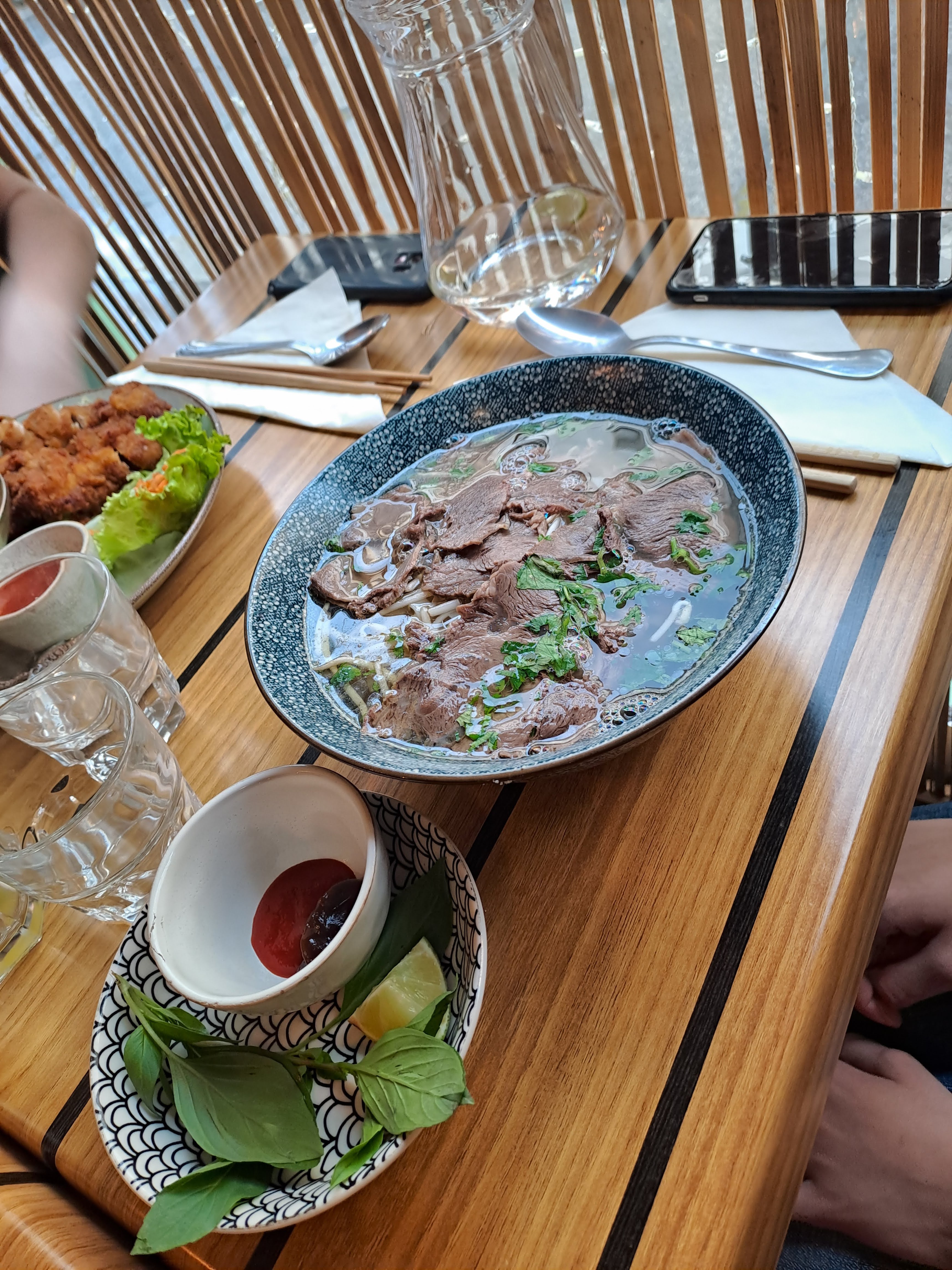 Nourriture très médiocre. Le pho était si fade qu'il a fallu les deux pots de sauce sur la table pour le rendre plus savoureux qu'un seau d'eau de pluie. La soupe elle-même, qui devrait être presque bouillante, était à peine au-dessus de la température ambiante. Le bœuf était très cuit et dur au point d'être à peine comestible. Le wok de bœuf était un gros bol de bœuf fade qui n'était même pas accompagné de riz (dont un petit bol coûte 4,5, le meilleur plat de la place d'ailleurs). Le dessert était la première fois que j'étais vraiment dégoûté par un dessert. C'était un vilain mélange de yaourt et de haricots rouges qui avait le goût de houmous sucré... Non merci. Les serveurs étaient également incapables de prendre des commandes simples. Nous avons commandé 2 entrées et 2 plats principaux, les deux entrées étant complètement oubliées, puis après en avoir pris note, une seule a eu la chance de rester dans les mémoires. Peut-être que, vu l’état du reste du repas, c’est pour le mieux. Le repas était à 45 euros pour deux plats principaux, deux bières, une entrée et un dessert. Assez cher pour un repas de si mauvaise qualité.