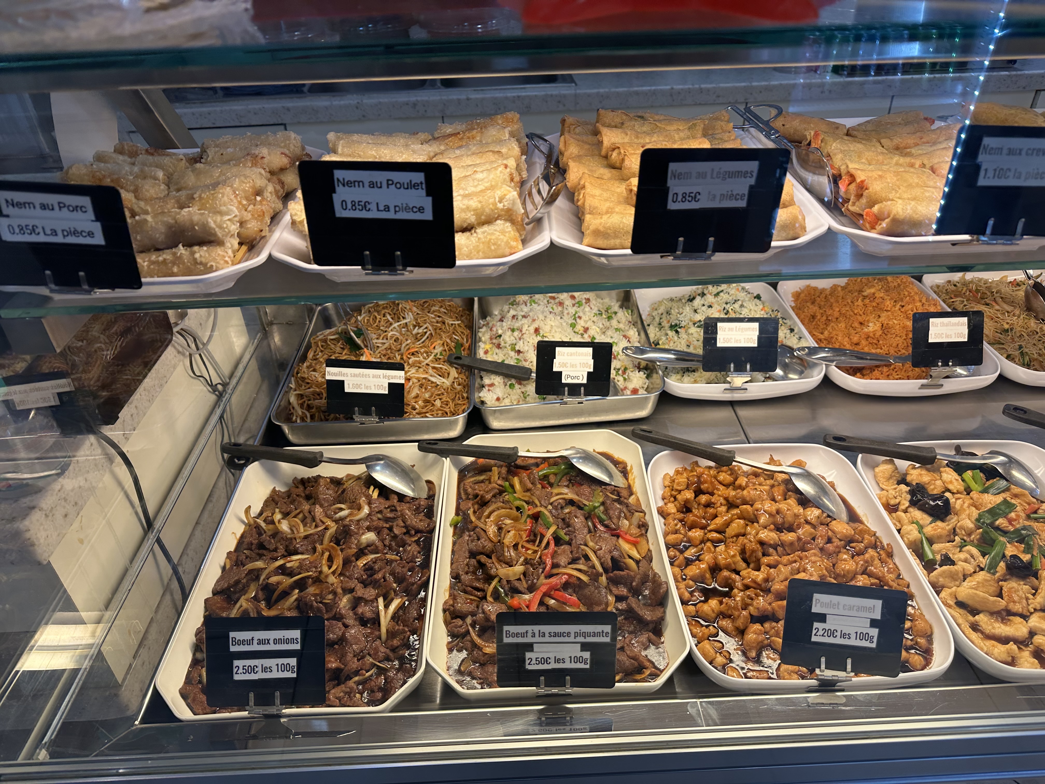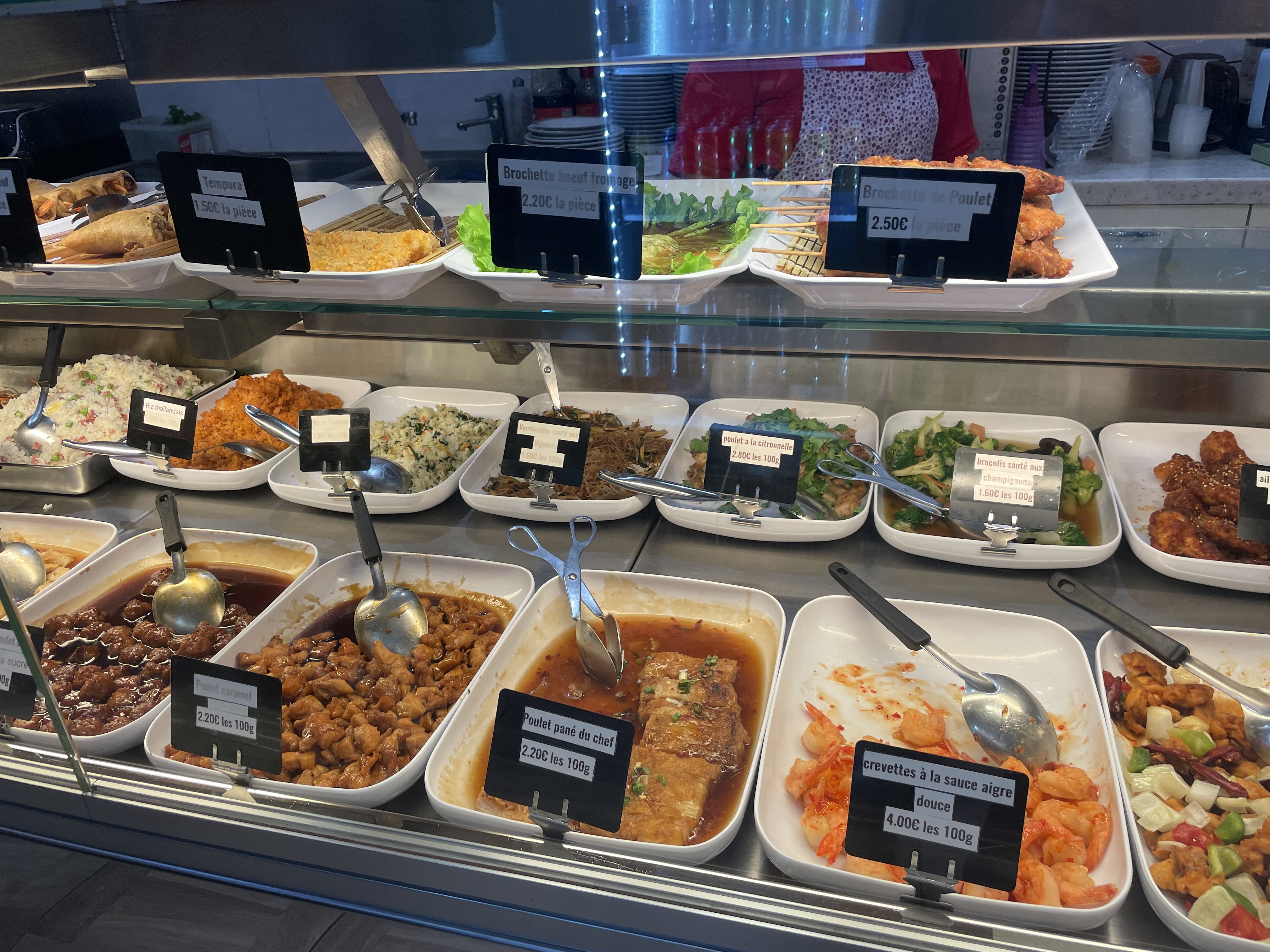 Nous avons été très impressionnés par la qualité et le choix de ce petit restaurant asiatique. Chaque plat peut être acheté à la pièce ou au poids, et peut être consommé en toute tranquillité sur les tables du restaurant. Les prix sont normaux, clairement les plats de poisson sont plus chers (les crevettes sur la photo à 5,50 € les 100g). Les brochettes de poulet étaient excellentes, mais en général toute la nourriture que nous avons consommée était très fraîche et vraiment bonne. Certes un choix inhabituel pour beaucoup lorsqu'il s'agit de Paris, mais on repart rassasié et satisfait sans avoir trop allégé ses poches. Extrêmement recommandé !