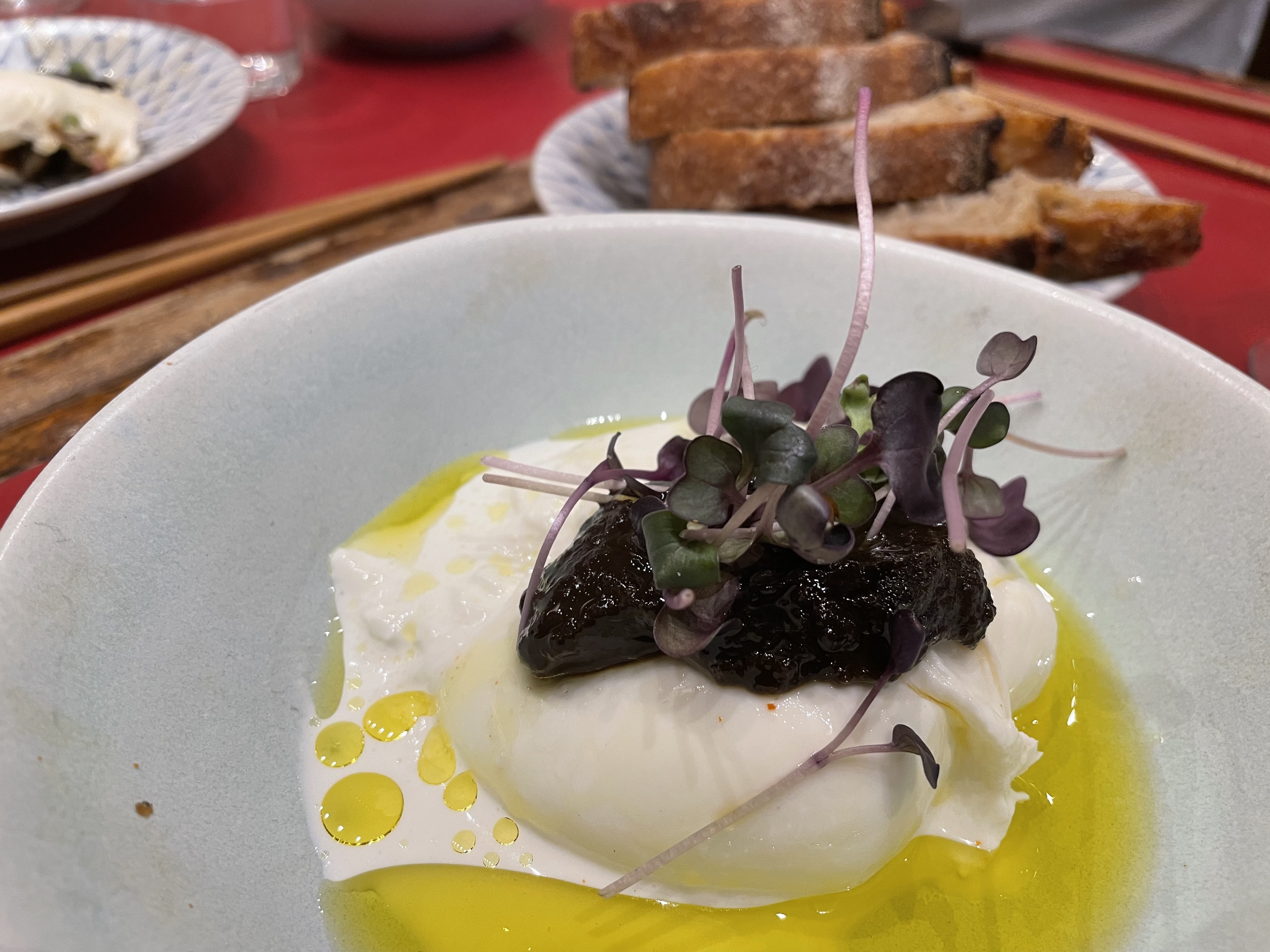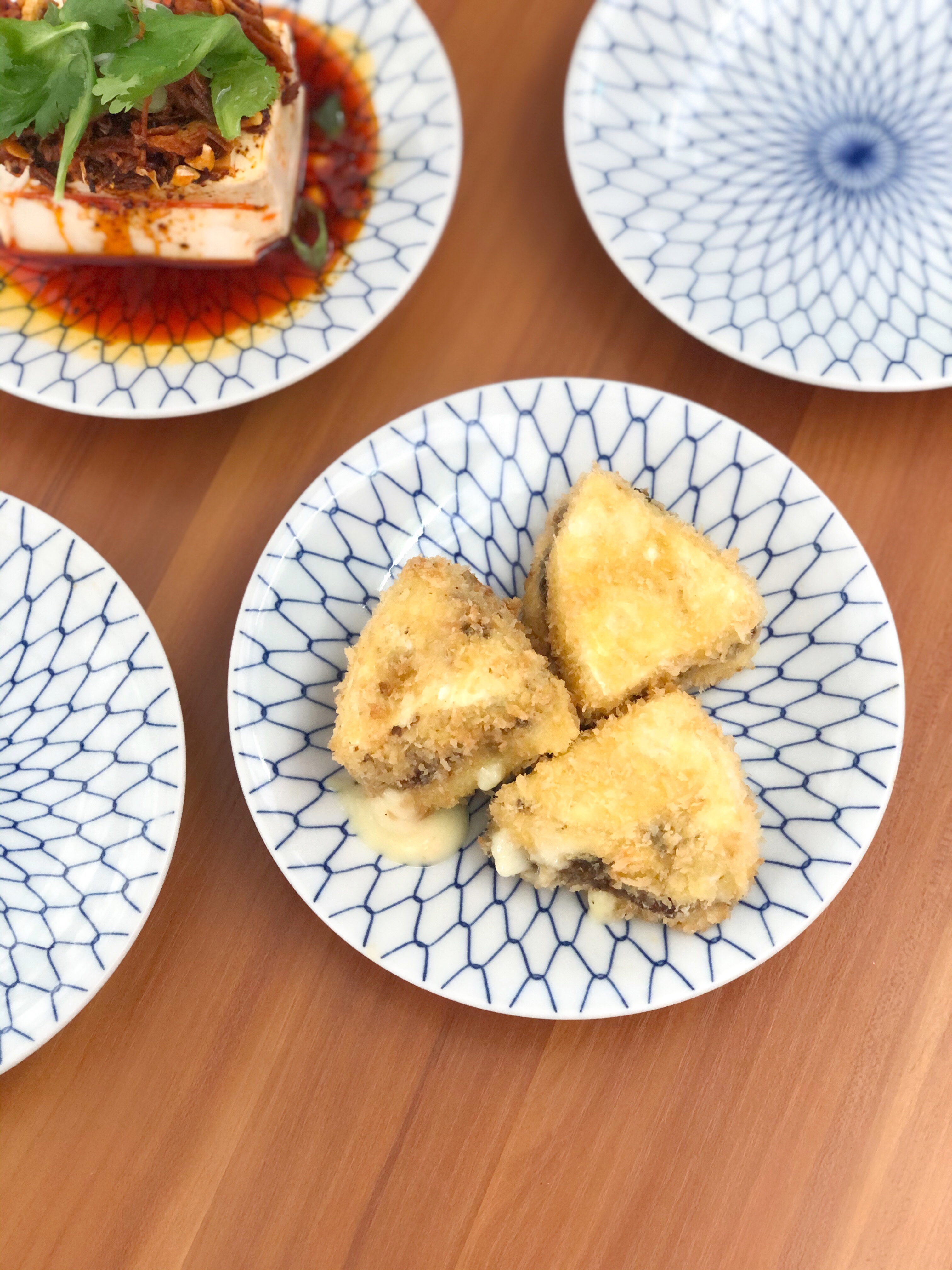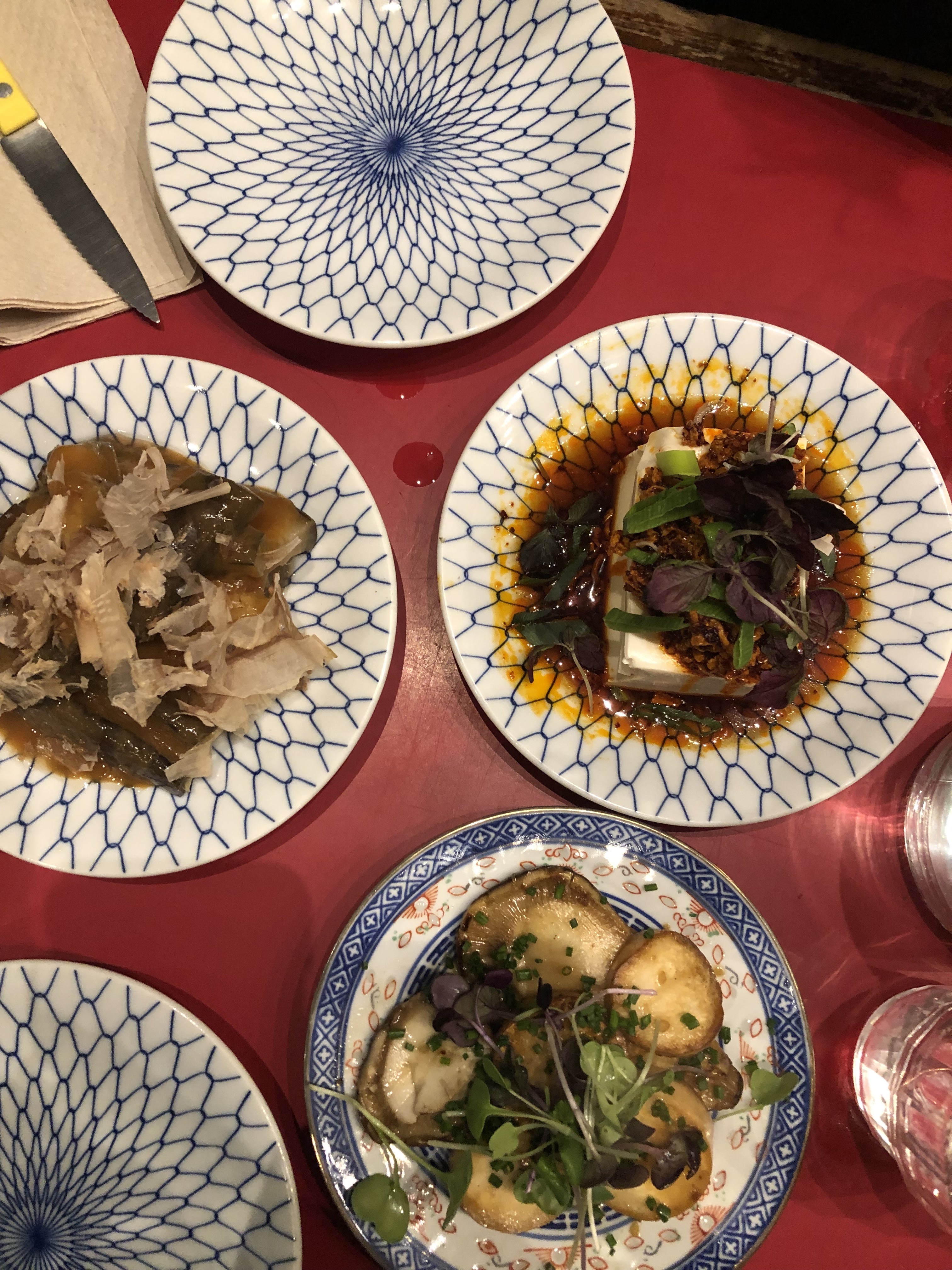 Délicieux tapas à partager : tofu crispy chili oil, Camembert croustillant à l’ail noir, maquereau à la plancha sauce ponzu et kaarage sauce mayonnaise maison et soja