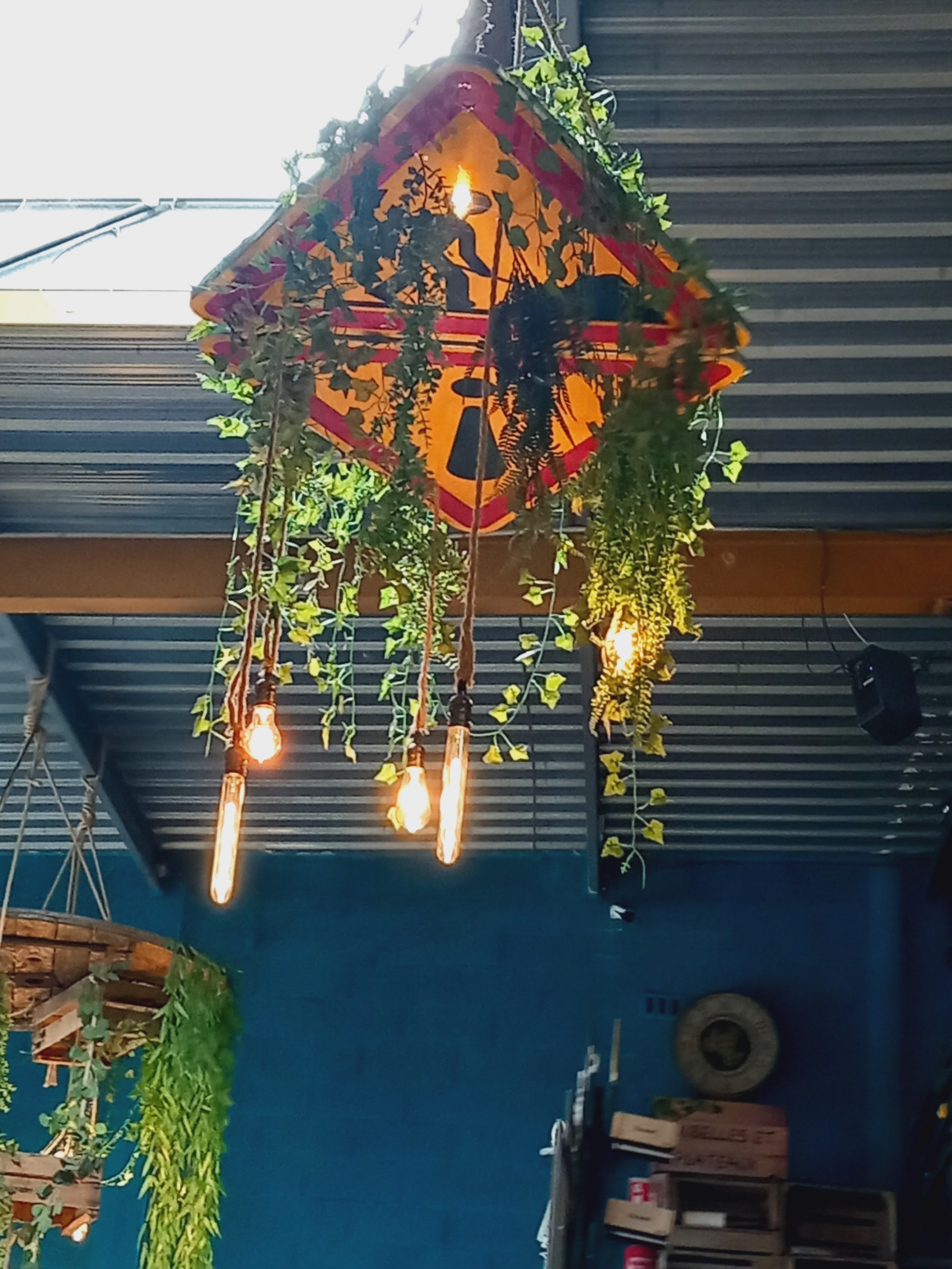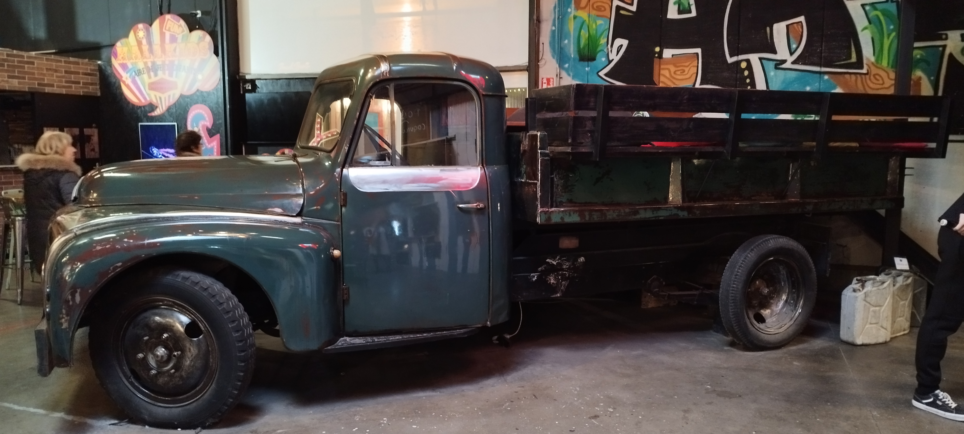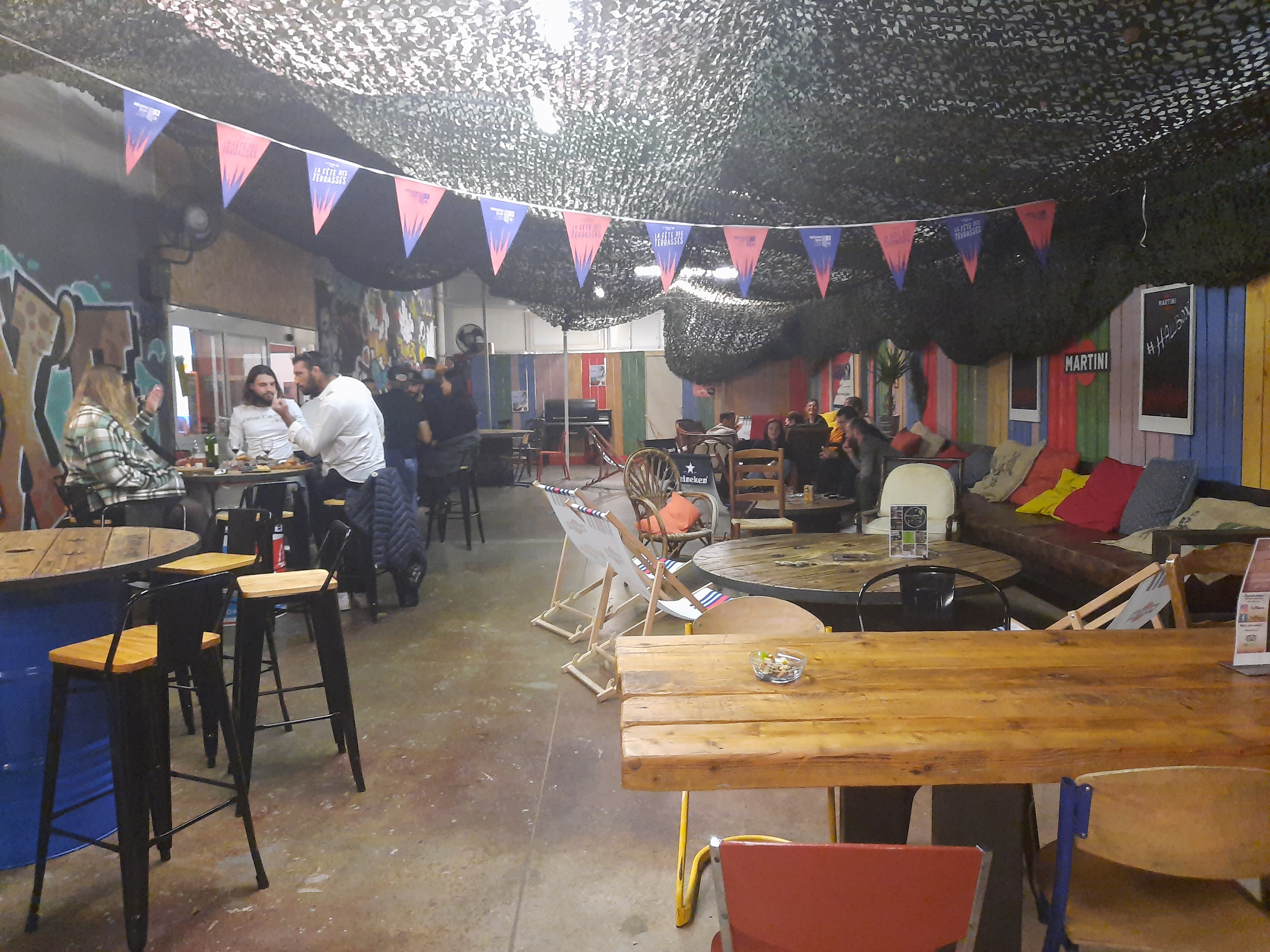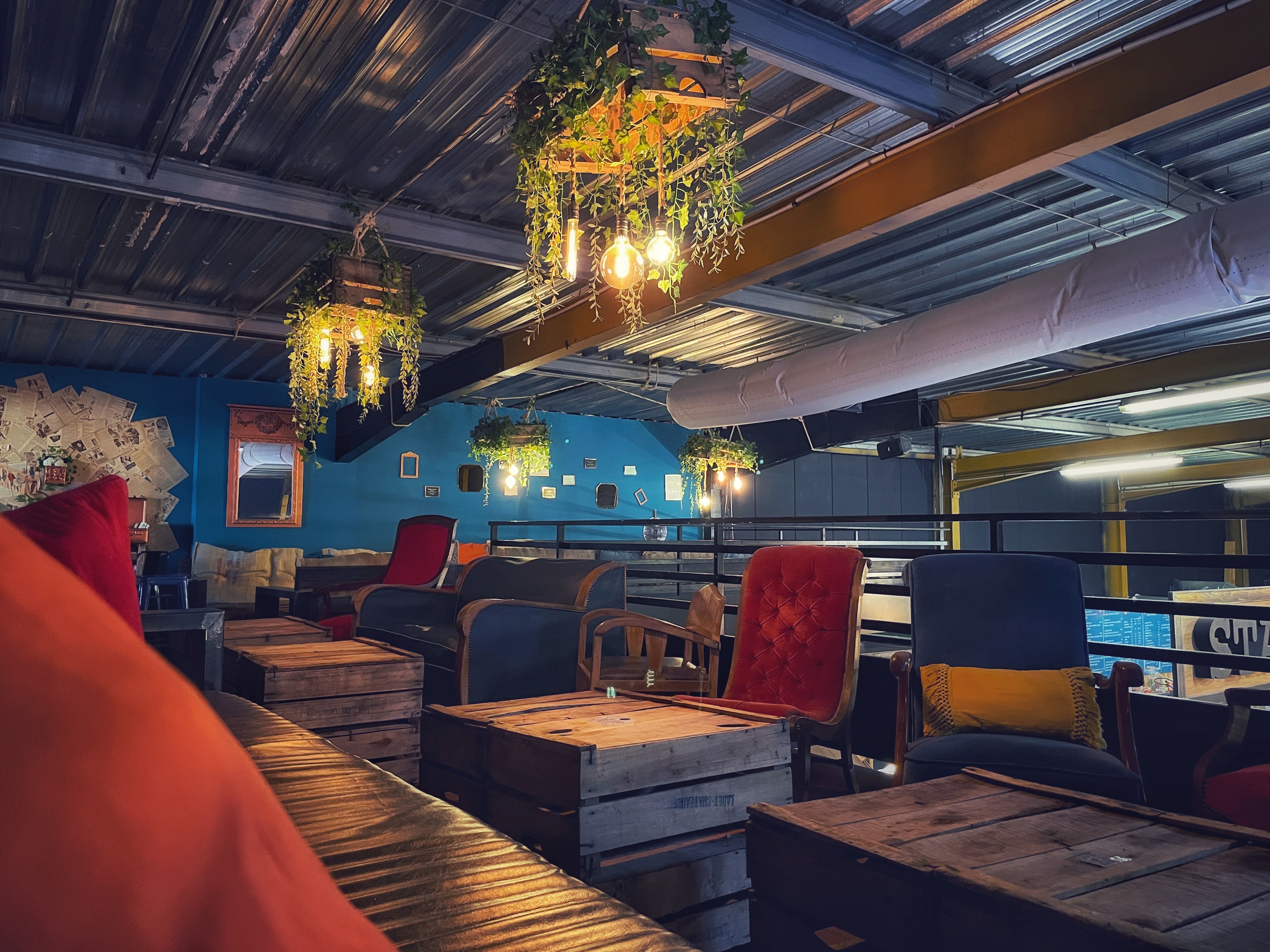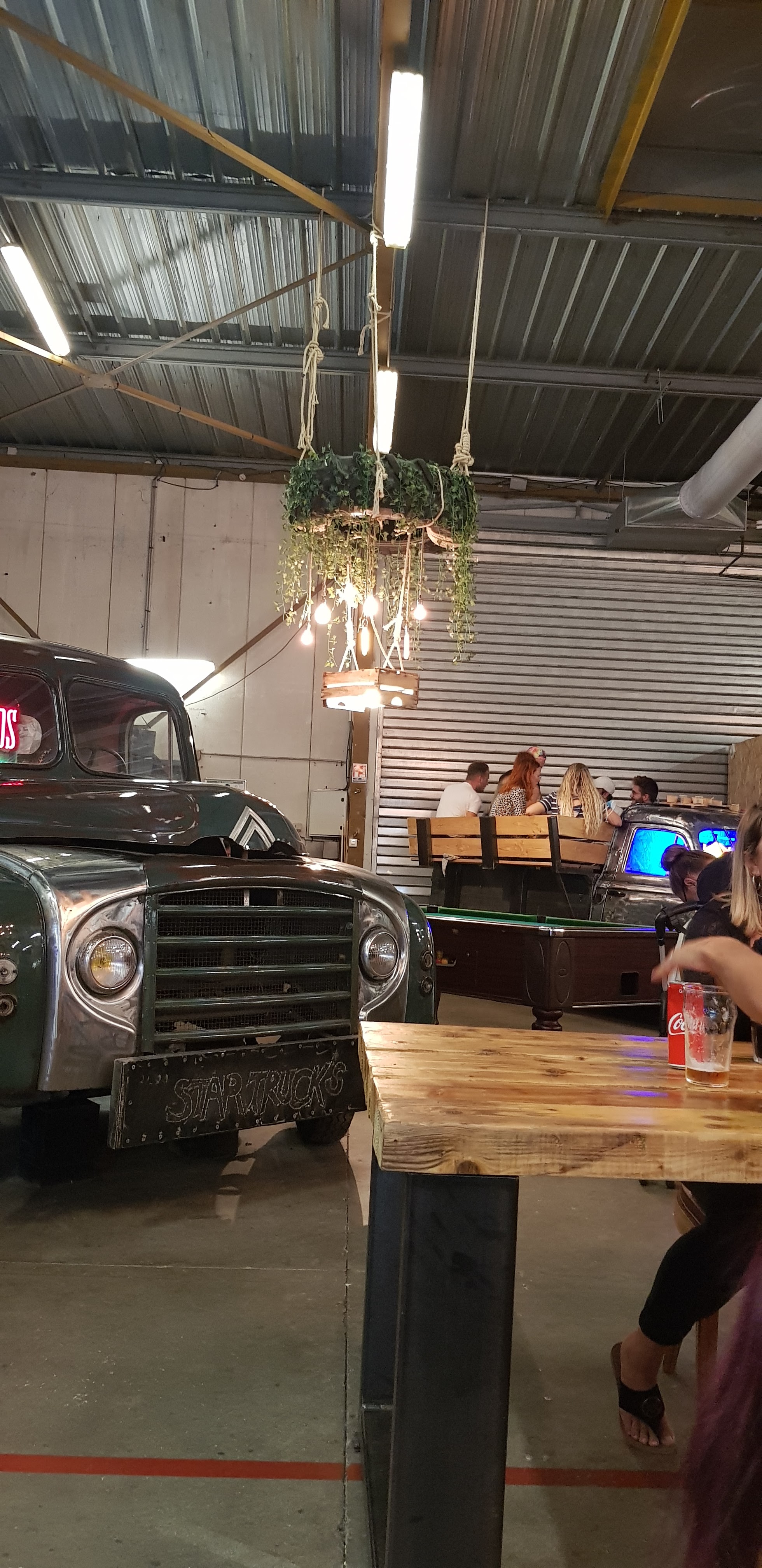 J ai vraiment beaucoup aimé ce lieu où se cottoye divers genre de cuisine .et une ambiance super sympa... Situé dans un énorme hangar décoré avec goût façon vintage : voitures anciennes ...tables en planches pour la partie restauration et non-fumeur. Puis une porte vous mènera dans un espace un peu plus aéré pour les fumeurs .avec fauteuils, canapés, transats...tres cosy . Ou vous pourrez siroter votre verre en toute quiétude. Le concept est simple:vous arrivé, vous vous installez,vous choisissez parmi tous les snack (tapas,sandwitch,salade,grillade,viande,assiette de charcuterie,assiette de fromage,pizza,pâtes...le choix est vaste)ce que vous voulez manger.vous passer au bar vous commandez à boire et vous dégustez le tout a votre table . La Qualité prix ,l'ambiance et décor valent le détour. Je recommande vivement.