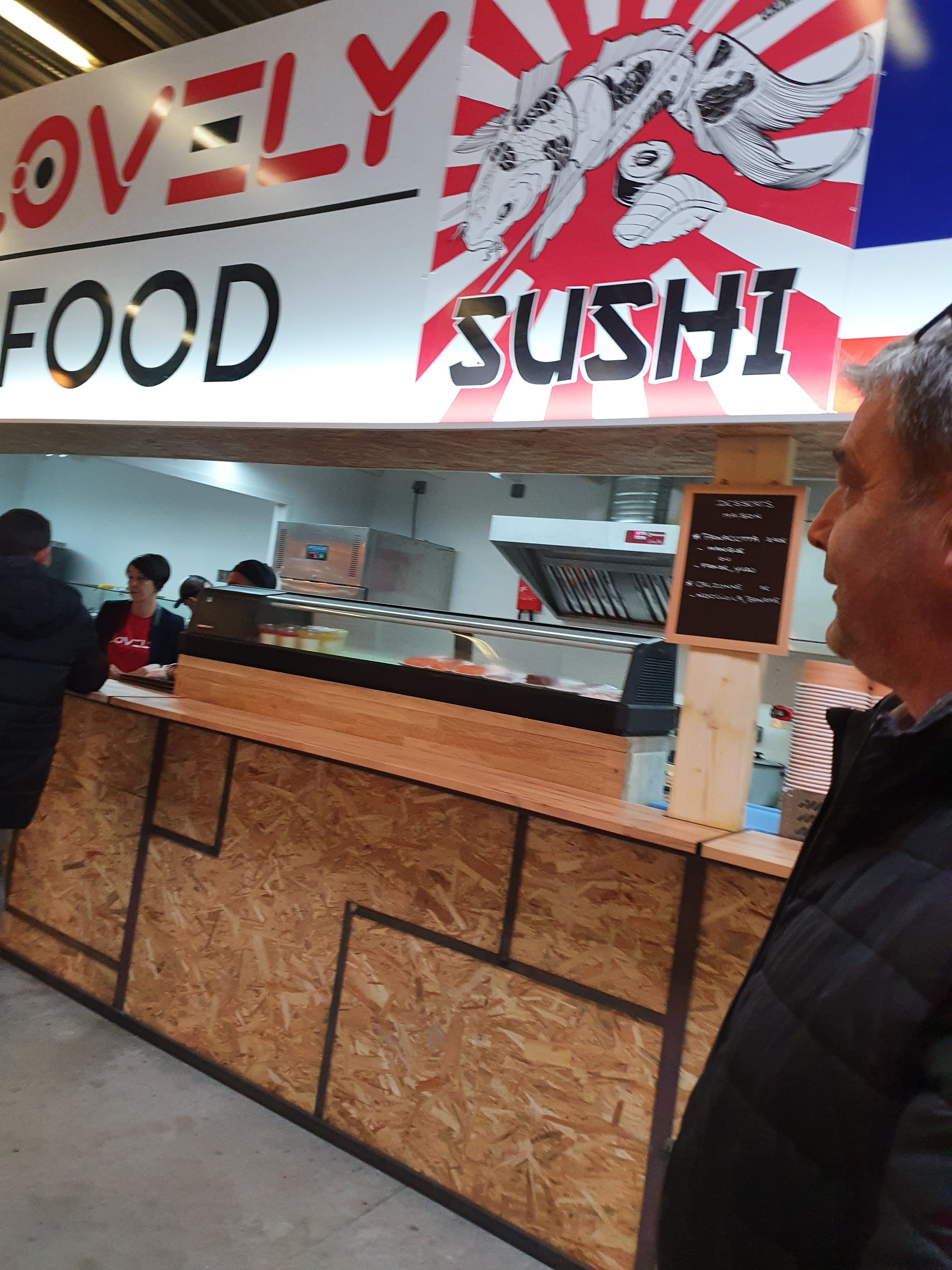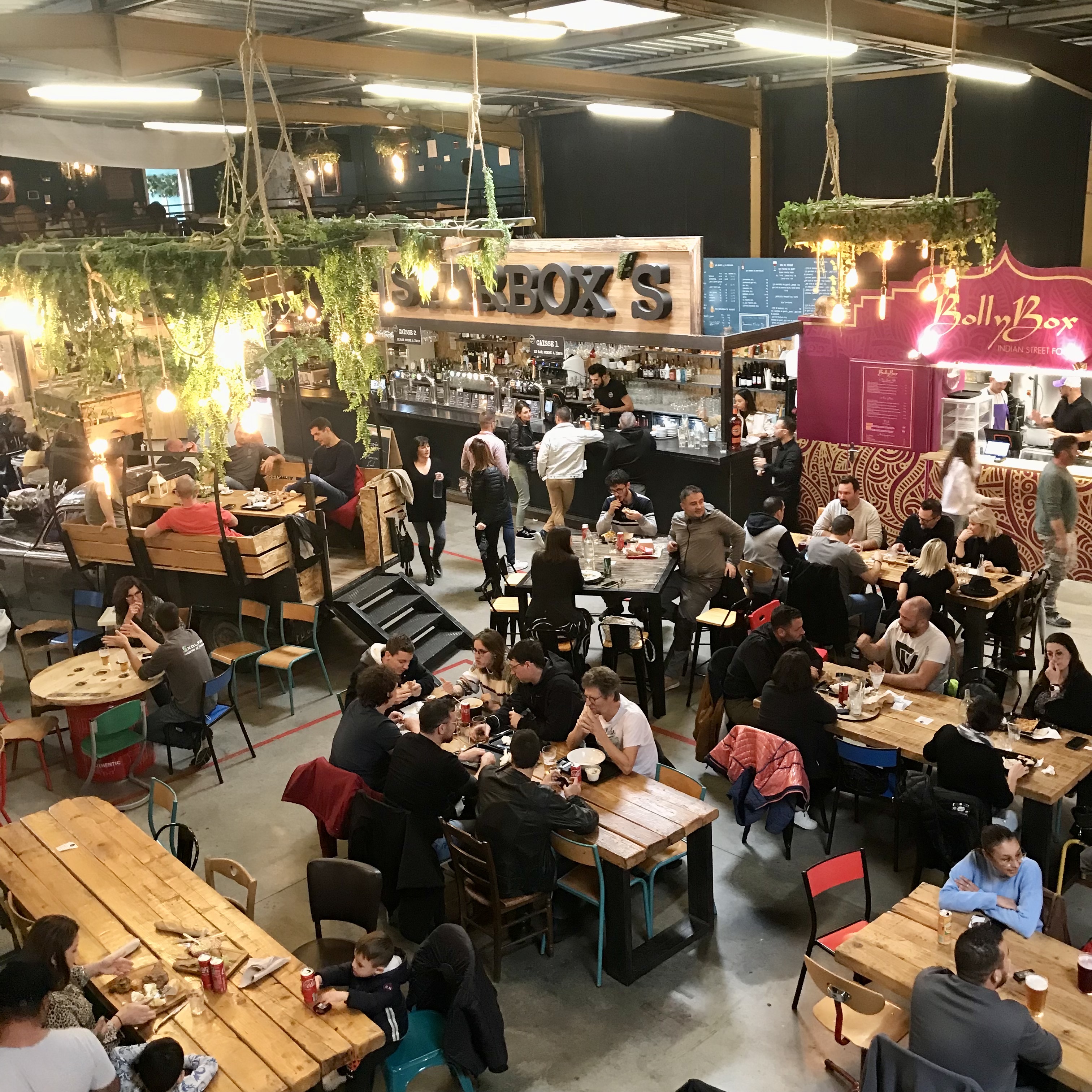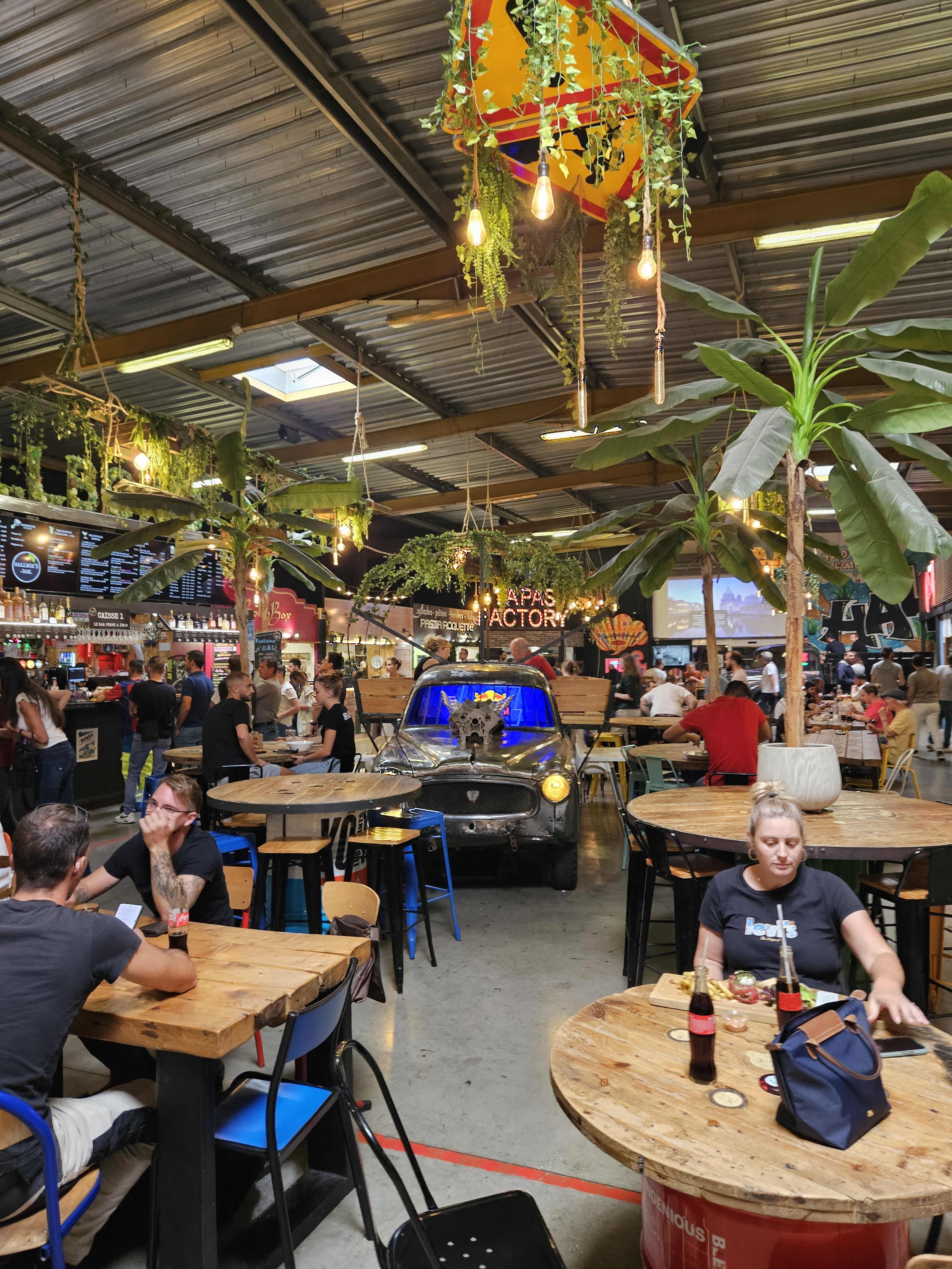 Très bon concept!!il fallait y penser à rassembler plusieurs cuisines au mm endroit et à l abri dans un grand hangar très joliment décoré !!un joli petit endroit pour enfant !!tapas, pâtes ,pizzas, thaï ,sushis,tacos,bbq bar avec cocktails le top !je recommande