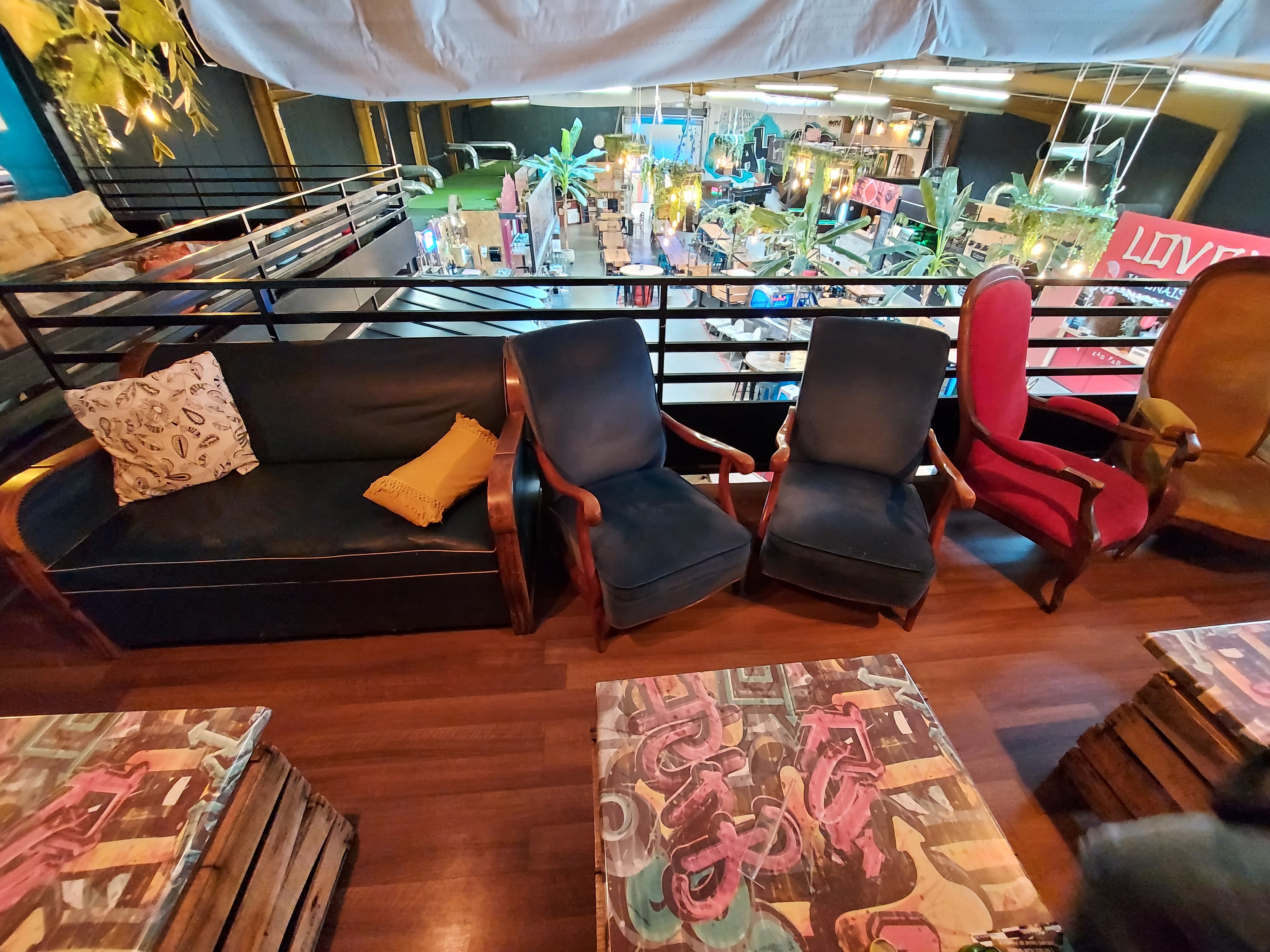 Super concept, très sympa, tout le monde y trouve ce qui lui plaît, et il y a même un espace jeux pour enfants ! Juste trop bruyant pour moi qui ai du mal à le supporter (j'ai mis des bouchons d'oreilles). Prévoir un coin plus calme en retirant un haut-parleur dehors? 🙏