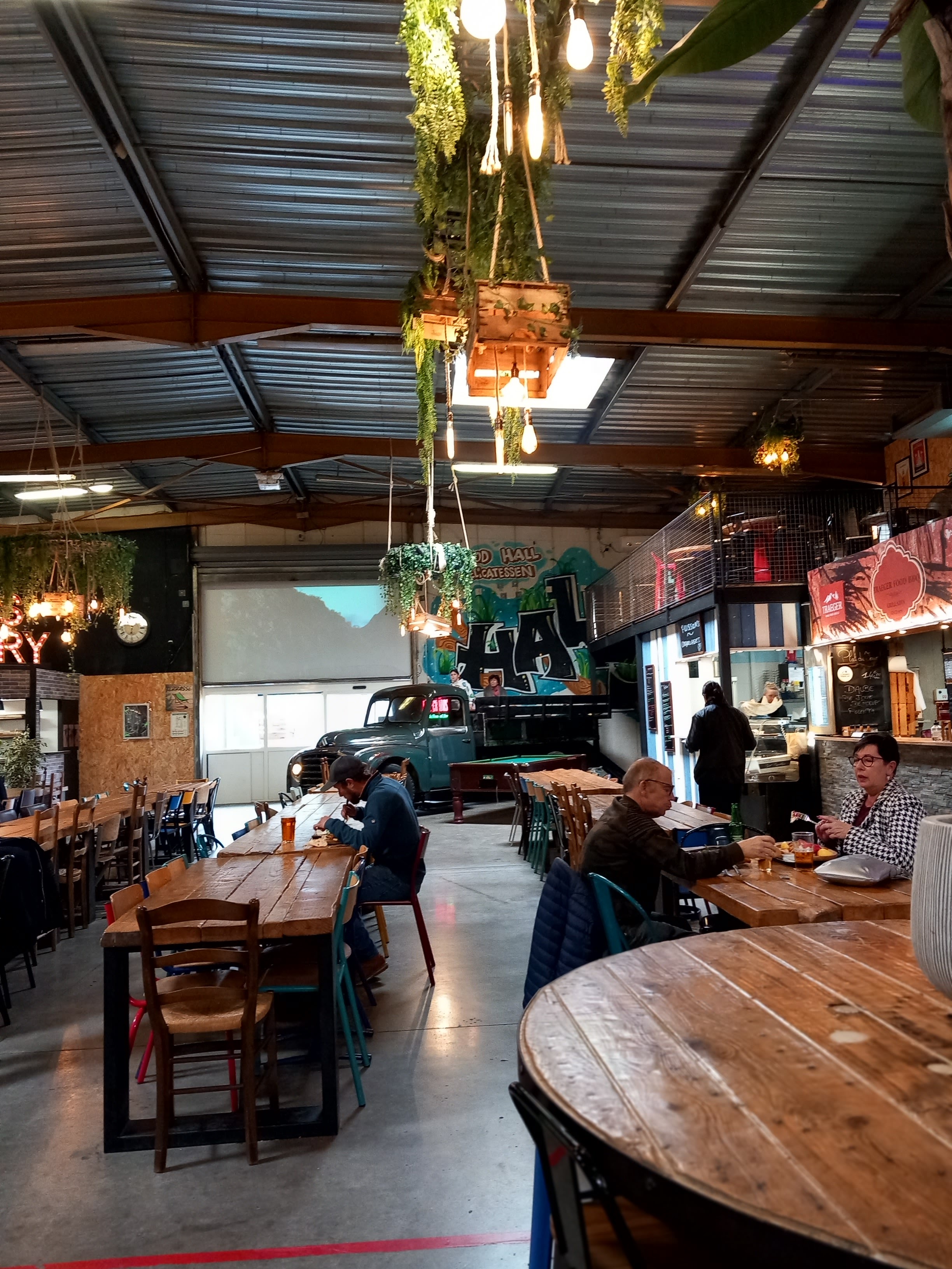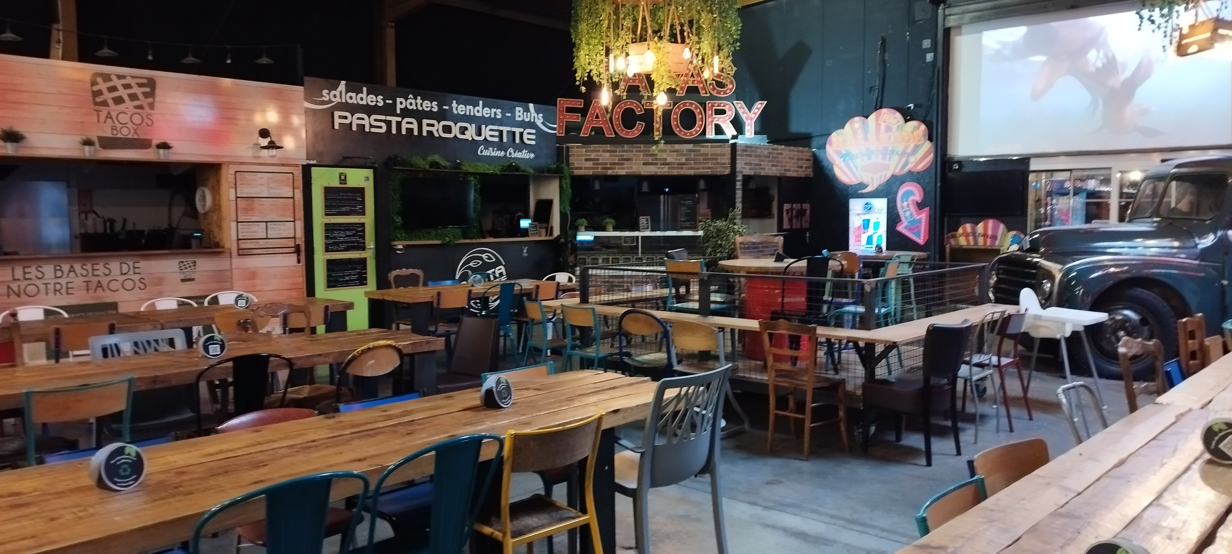 Aire de restauration simple installée dans un ancien entrepôt à la décoration rétro vintage et servant burgers, tacos et pâtes. Très sympathique 👍