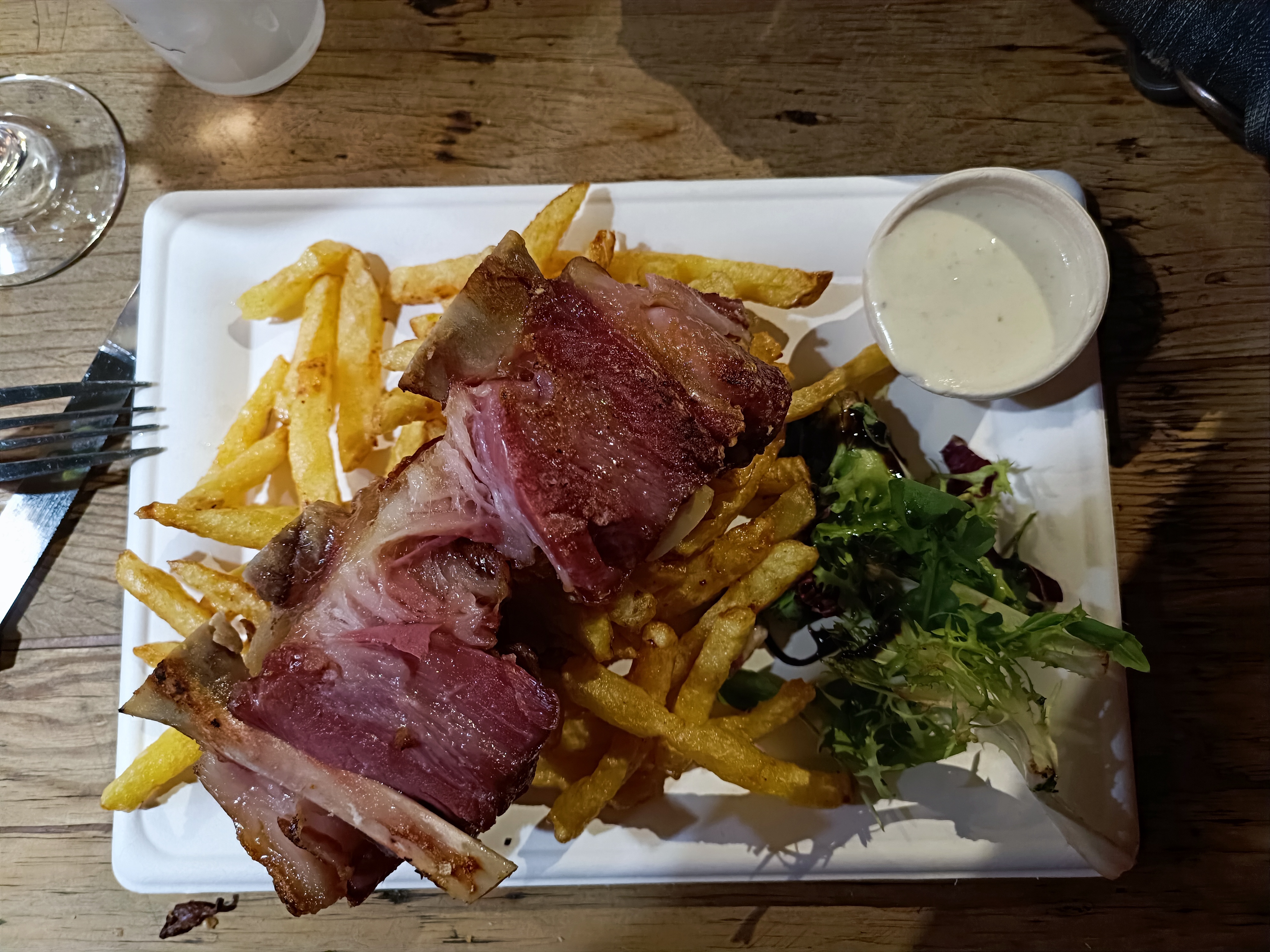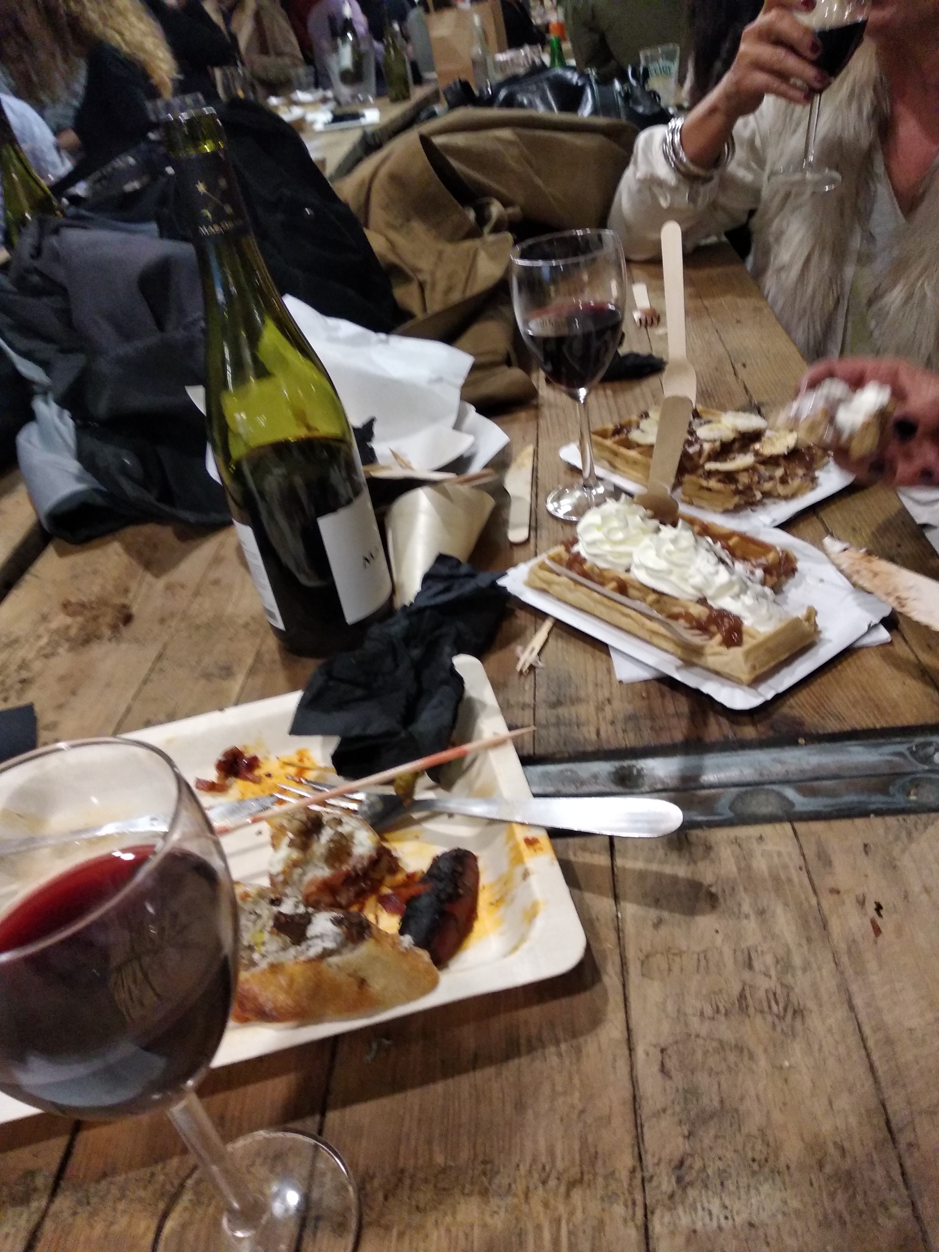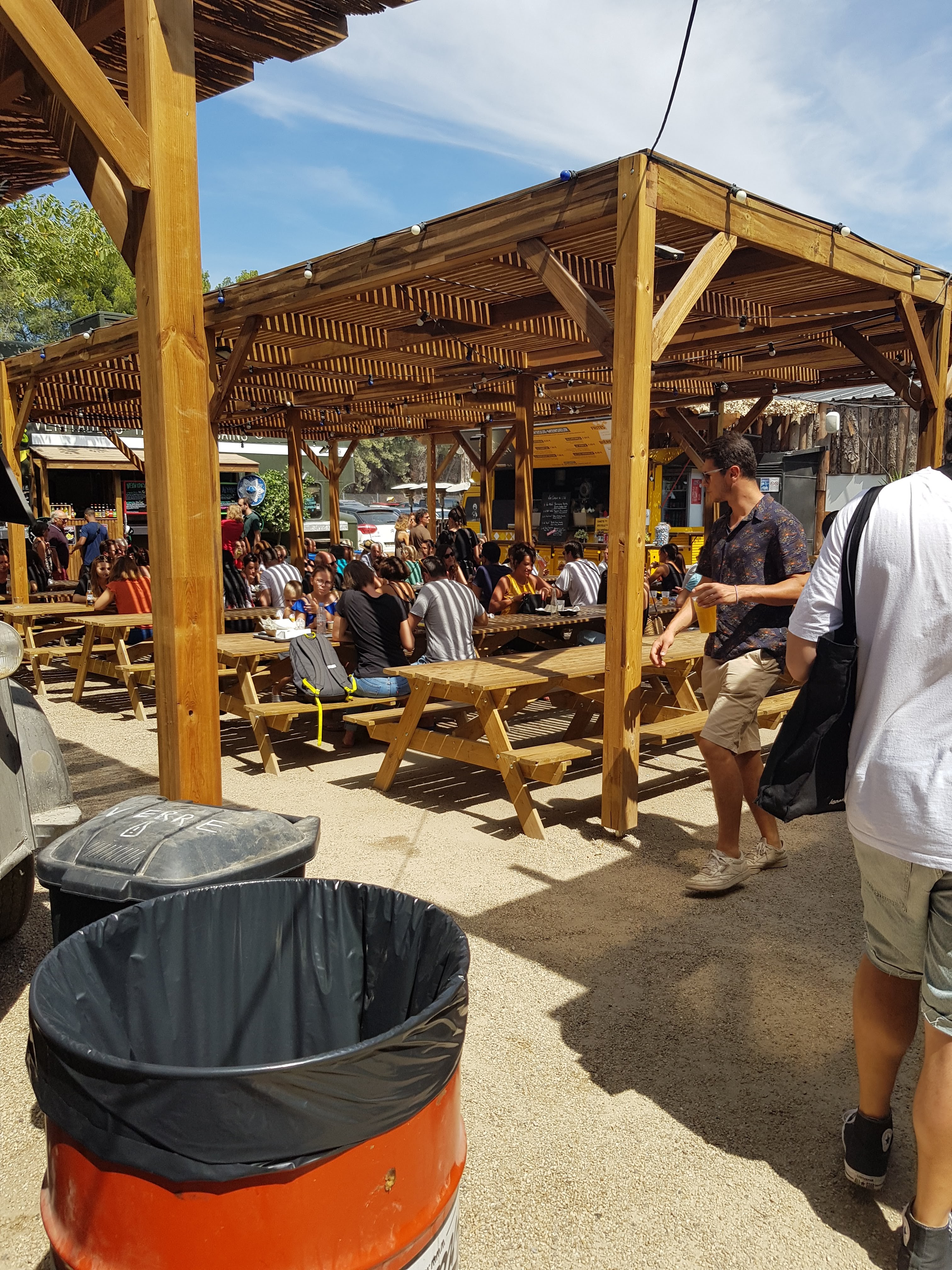 Je suis un peu sévère là, je l'avoue. Je m'explique. Le plus, l'ambiance, le monde, la foule. Les moins, la difficulté à trouver une table, le niveau sonore extrêmement haut, rendant la conversation très malaisée, les verres dont il faut acquitter la consigne, et ramener pour la récupérer, le prix des plats équivalents au restaurant, les tables non desservies, les couverts, jetables, inefficaces, l'absence d'assiette, les serviettes papier qu'il faut mendier... Bref, c'est bondé de gens qui galèrent volontairement.