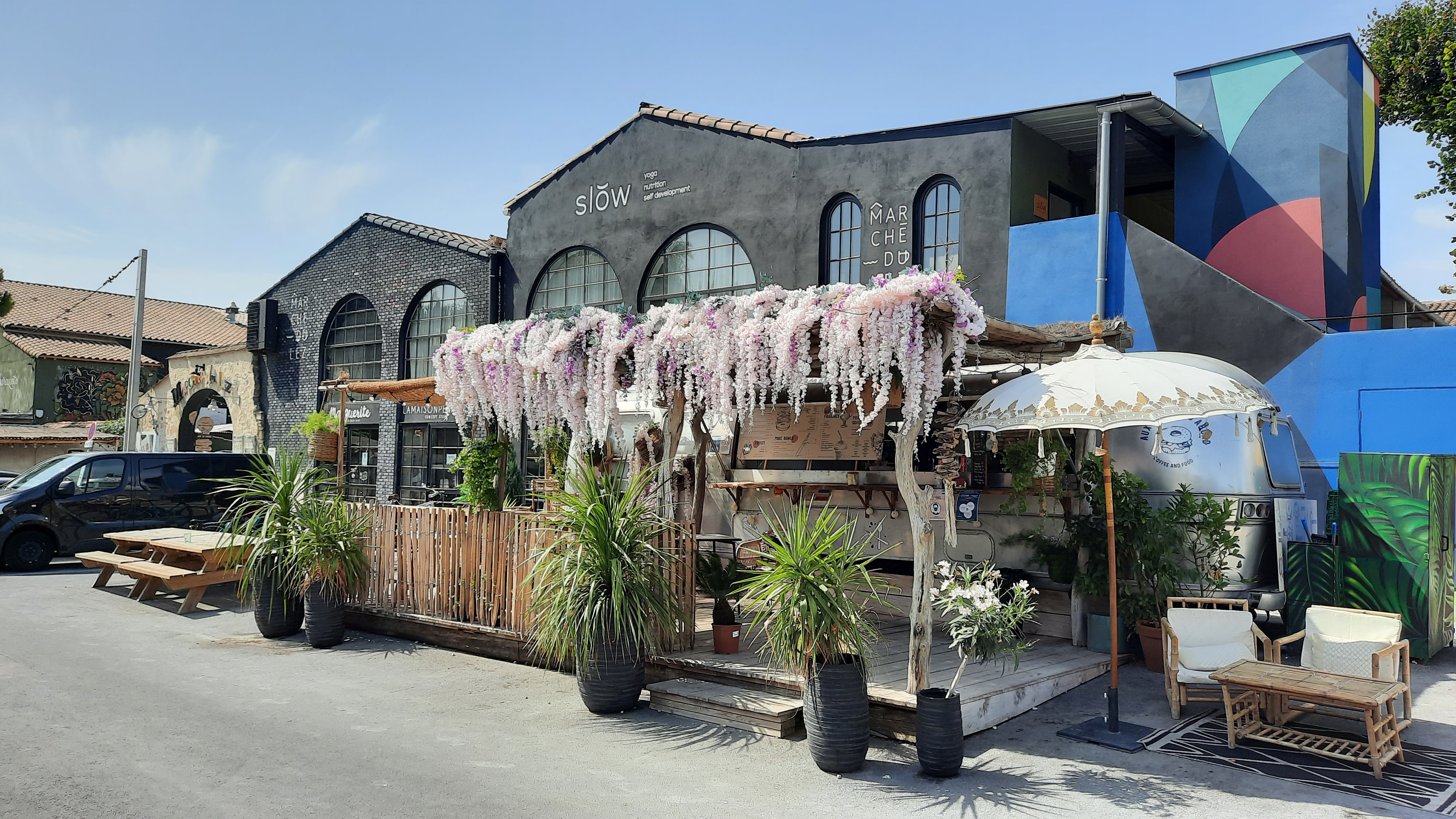 La grande tendance pour qui veut manger plus ou moins vite et avoir une grande variété de propositions culinaires de tous horizons, c’est le food court. Vous prenez de la cuisine de tous les pays vous réunissez les différentes échoppes qui les proposent dans un espace immense, soignez les prix et la déco (dans l’air du temps si possible) et attendez, vous ne tarderez pas à faire le plein d’une clientèle plutôt jeune. C’est ce que réussi parfaitement Les Halles du Lez à Montpellier. C’est une sorte de petit village avec food court intérieur et extérieur non loin d’une voie rapide (le seul gros point noir) mais quasiment piétonnier. Ici tous les styles de nourritures sont accessibles pour des tarifs relativement abordables et (bonne) surprise, c’est très bon. Aux côtés des restos et autres buvettes, des boutiques entre déco et brocantes qui invitent à flâner très agréablement. On y reste toute la journée c’est prévu pour, voire jusqu’au soir car Les Halles sont dotées d’un rooftop ou la fête bat son plein dès la nuit tombée. A essayer sans tarder