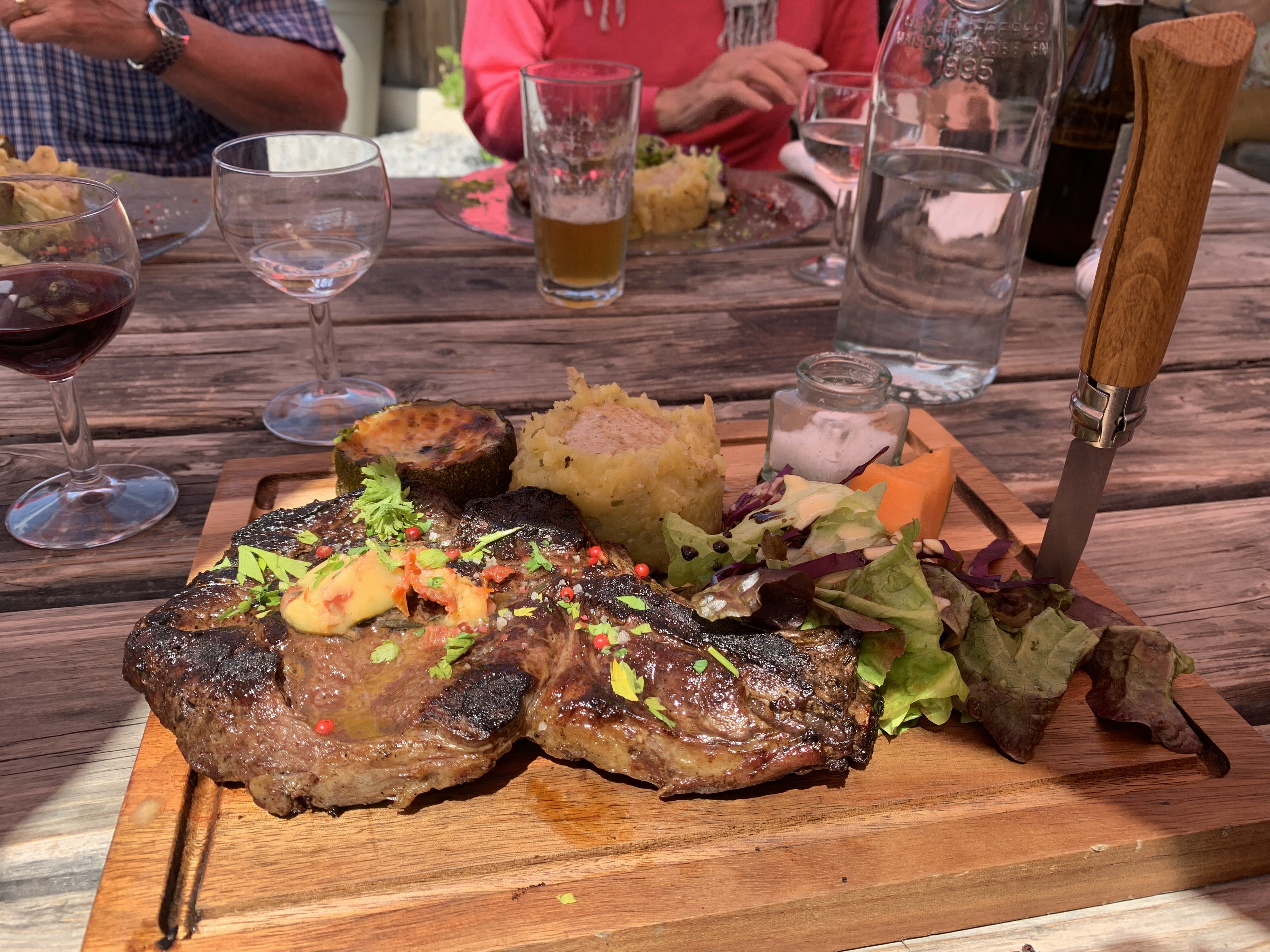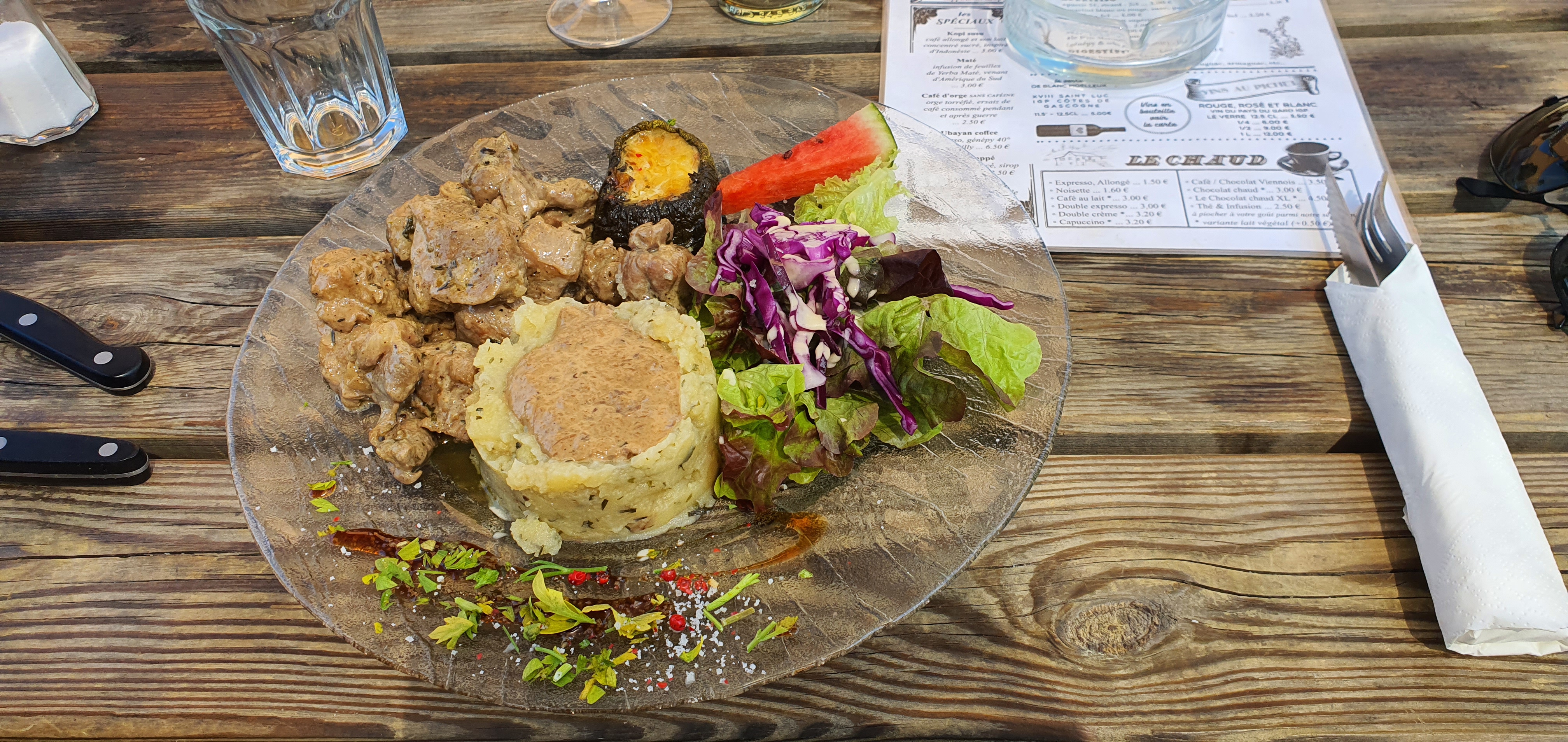 Sur la route des grandes Alpes, belle étape pour reprendre des forces. Une terrasse donnant sur un très beau paysage. Des hôtes disponibles et souriant. Nous avons choisi le magret de canard, servi avec pommes de terre et aïoli,courgettes farcies et salades : un régal.