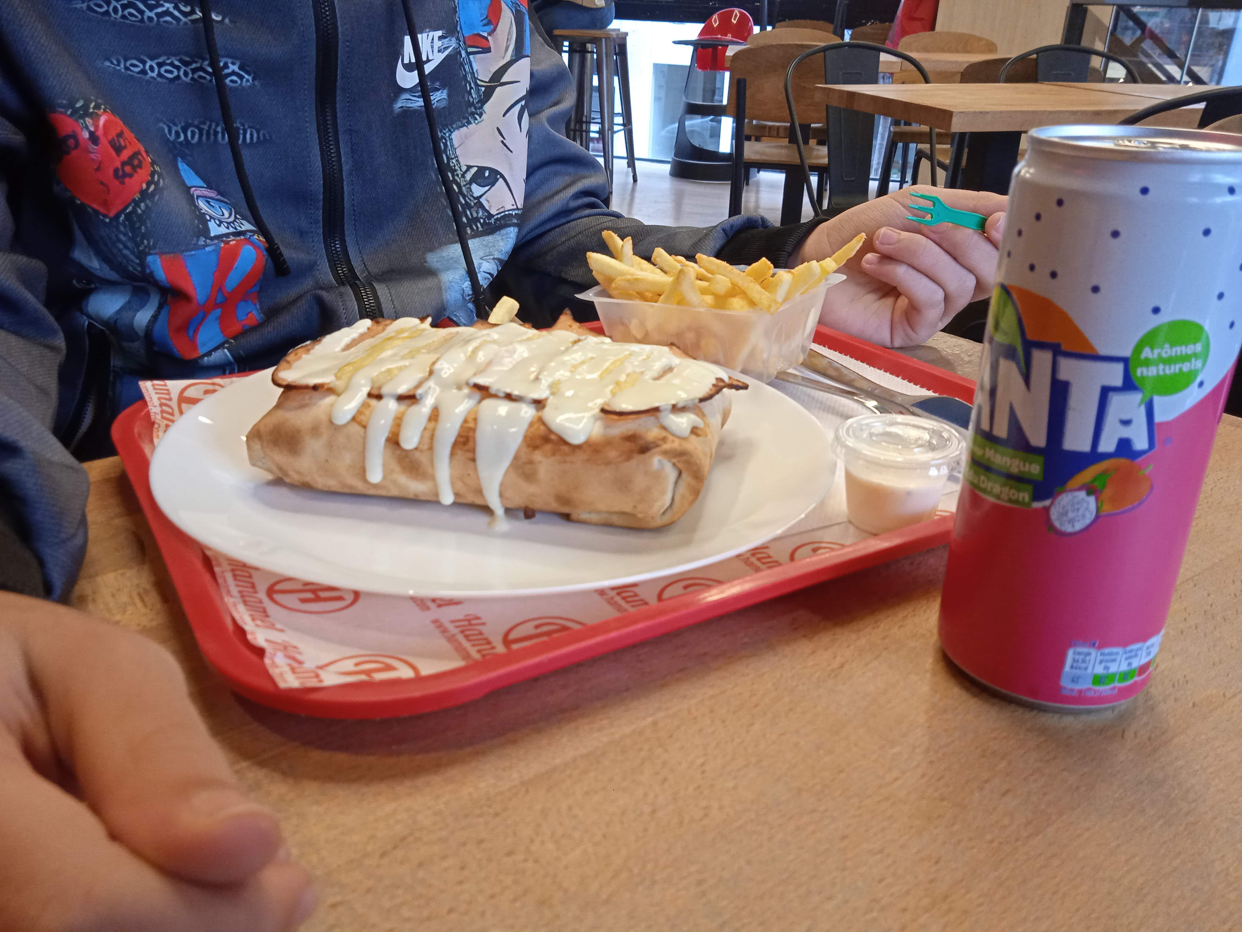 J'ai pris un menu, c'est un tacos et une barquette de frites ainsi qu'une boisson (pour 2.50 euros de plus). Mais mon tacos est rempli de pommes de terre et il y en a bien plus que de viande. Sans compter la sauce! Si vous êtes un inconditionnel de la malbouffe ce snack pourra vous convenir. La terrasse est aérée et sympathique. Pour ma part je reste sur ma faim et je ne reviendrai pas.