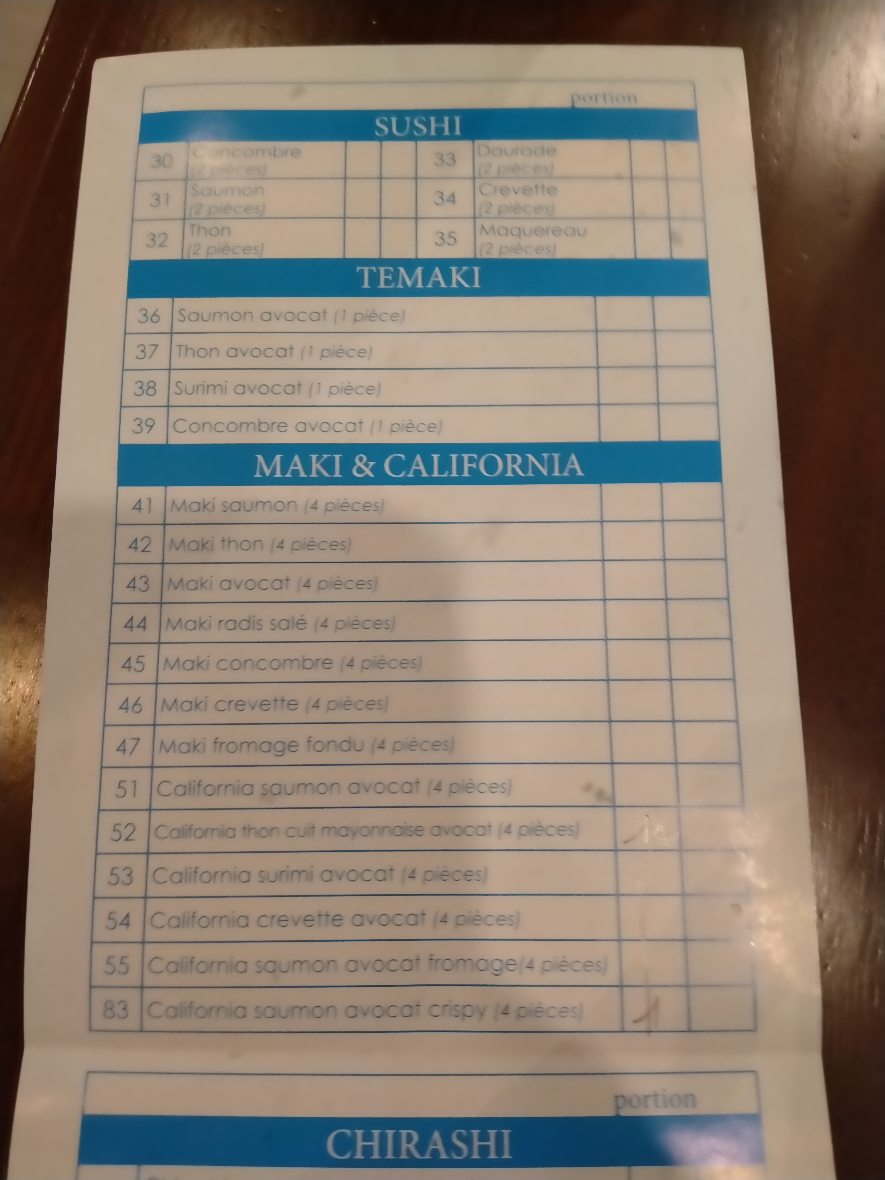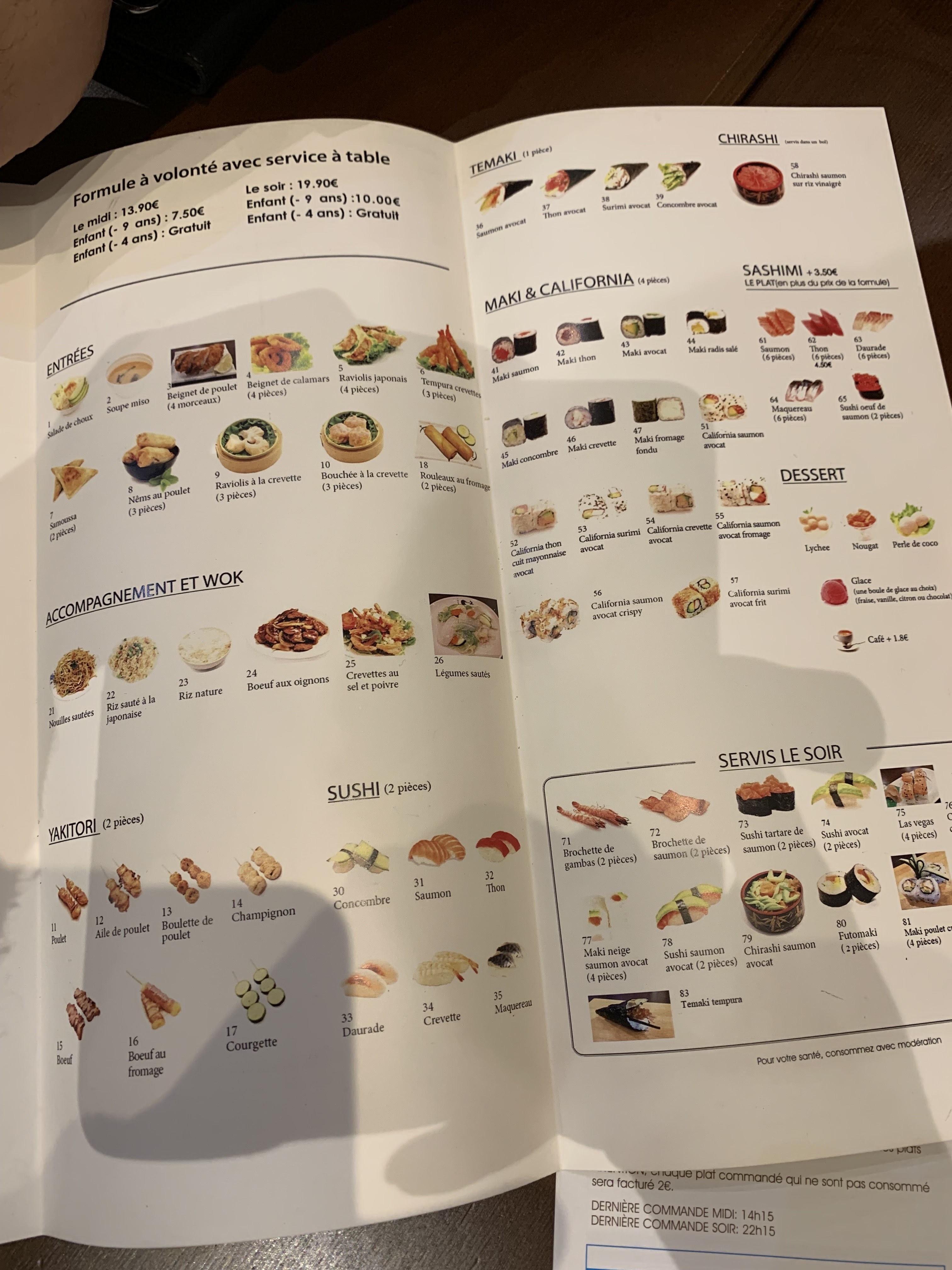à fuir. étant déjà venue plusieurs fois et n’ayant pas voulu porter un jugement trop hâtif, je ne reviendrai officiellement plus. 0 accueil, on attends x temps à l’entrée, même à la CAF c’est moins long. on est tous entassés les uns sur les autres, bruyant, service hyper long. entre le moment où on vient récupérer le papier de commande (si ils ont pas oublié de vous le donner), et le moment où vous êtes servi, prévoyez le temps de durée du film Titanic ou emmener un jeu de cartes pour passer le temps. niveau nourriture, poissons pas frais (prévoyez le smecta pour le lendemain), sushi/maki etc à température ambiante, viandes qui laissent à désirer également, substitut de fromage (je pense les fonds de frigo mélangés), même l’eau tient pas la route, à moins que vous aimiez la javel. si par contre, la sauce soja est passable :)