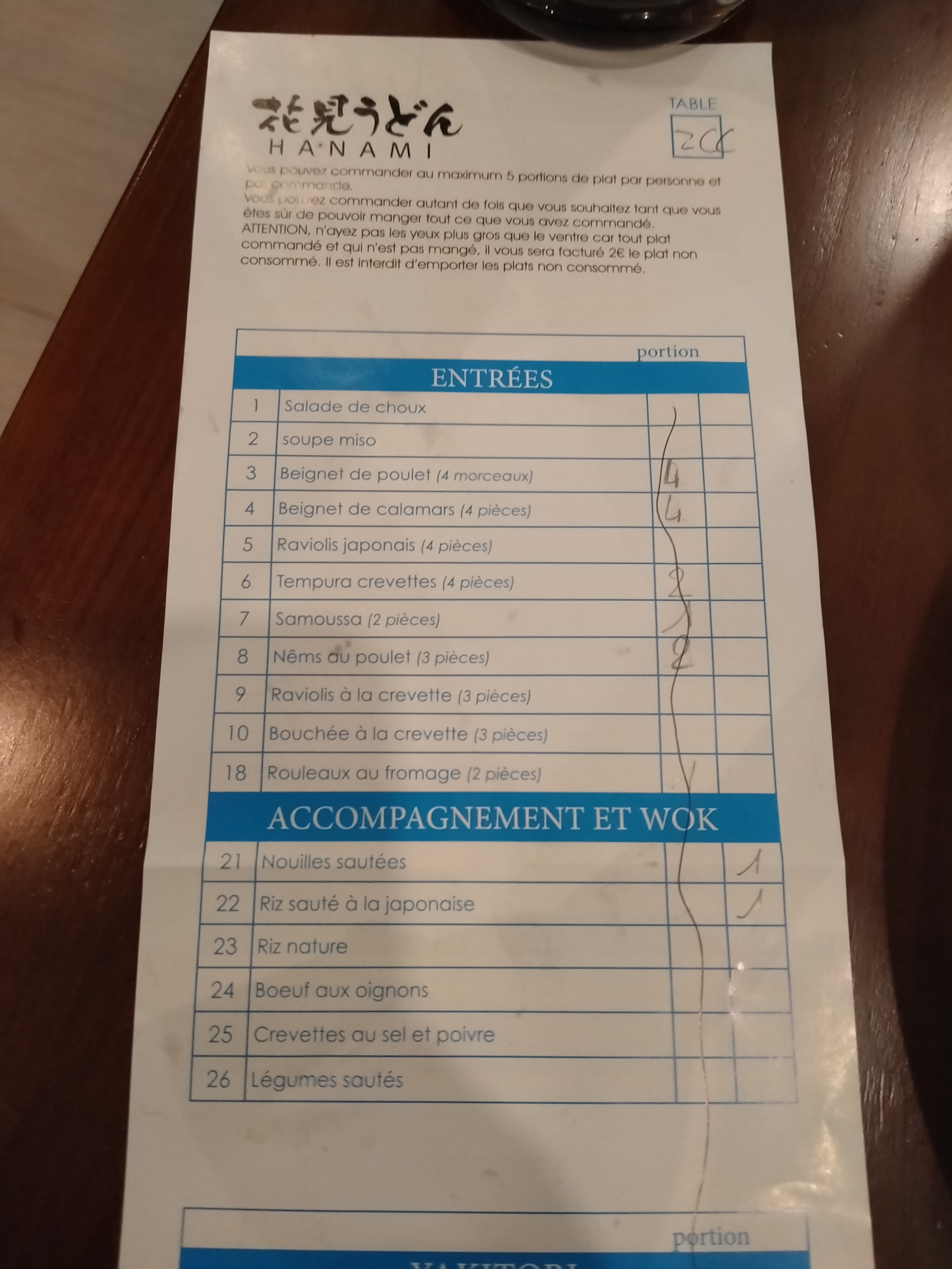 Très mauvaise organisation du service, le service est long, les plats arrivent au compte gouttes et ne correspondent pas à la quantité commandée...j attends toujours mes brochettes de courgettes et mes nouilles sautées. C est vraiment dommage par les plats sont bons et pour le prix cela valait le coup dy retourner, mais beaucoup trop d attente, nous avons été obligés d'interpeller les serveuses pour les plats manquants et les serveuses pas très aimables...donc dommage pour Hanami