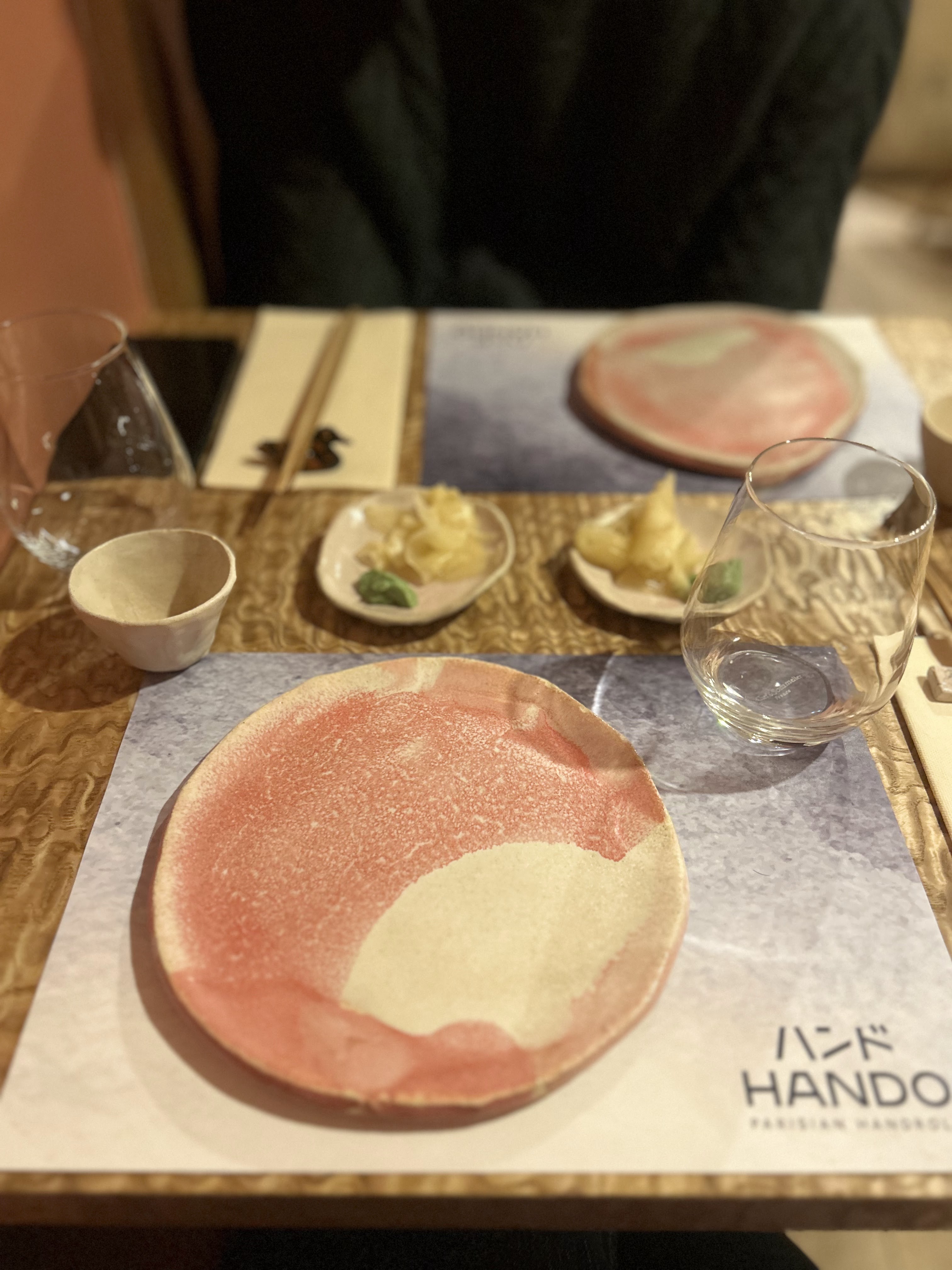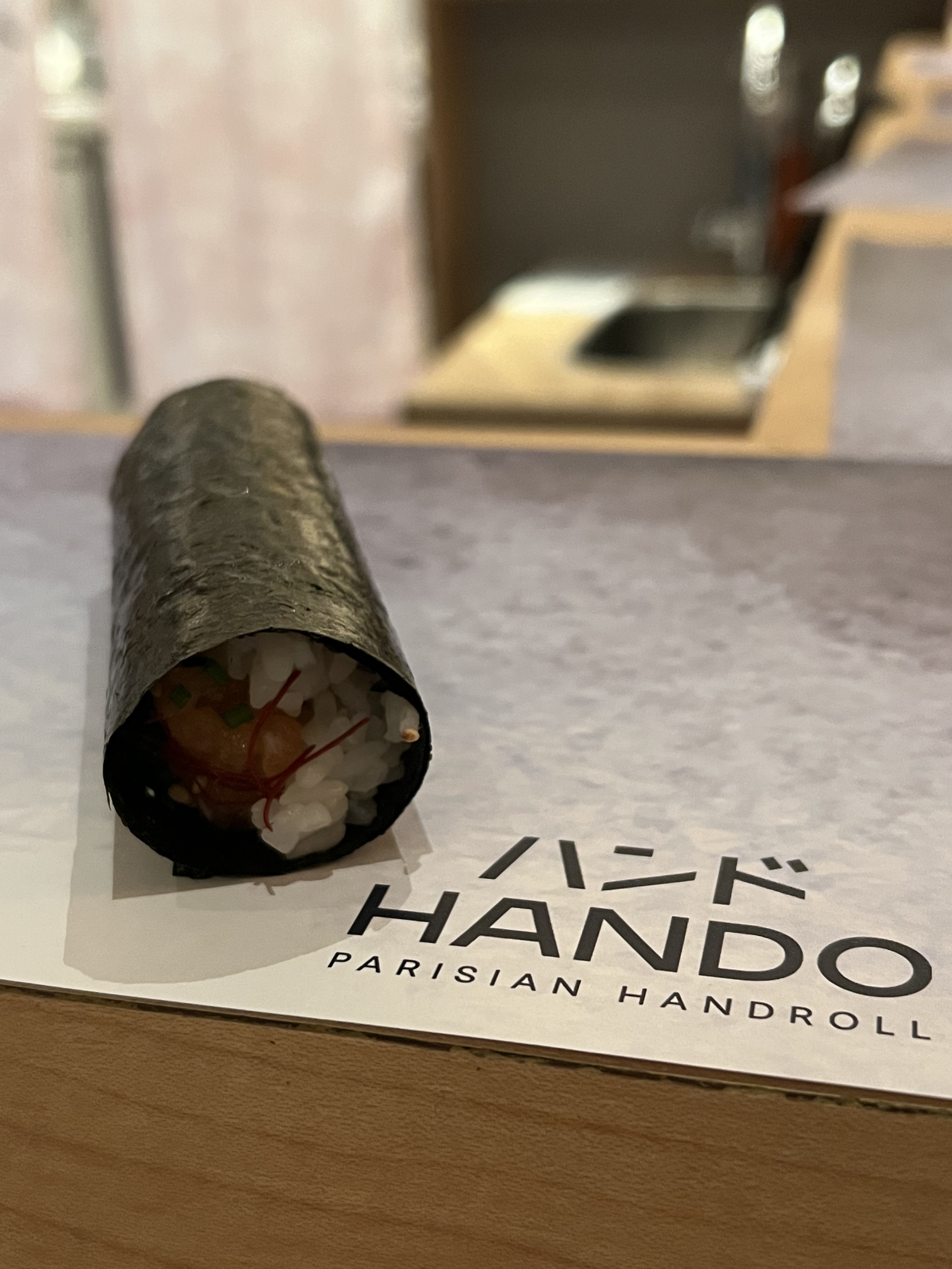 Nous sommes passés devant Hando tous les jours et avons décidé de l'essayer. Même si je pensais que notre réservation se ferait au bar, la table était bien. Notre charmant serveur était serviable et patient. Et ses suggestions étaient toutes pertinentes. Différent des autres handrolls que nous avons eu, les HANDO étaient tout aussi authentiques et délicieux. Mon mari a mangé du saumon (tous les 3) pendant que je goûtais aux crevettes, à la queue jaune et au Toro. Les saveurs étaient toutes différentes et étaient spectaculaires. Mon mari a vraiment apprécié son saumon. Merci! Quand nous reviendrons à Paris, nous reviendrons !