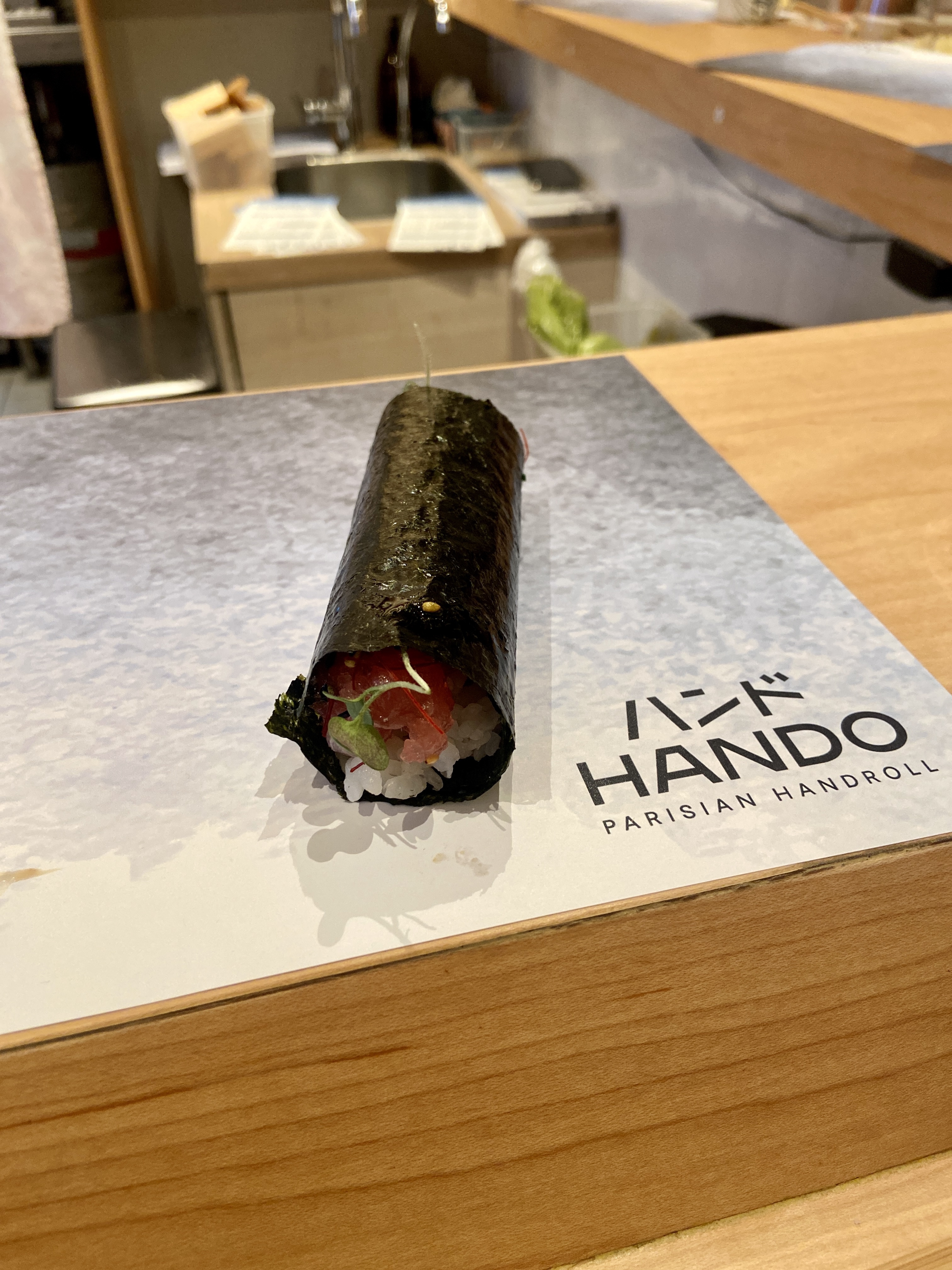 Expérience mitigée.. Je suis allée dès l'ouverture de ce restaurant qui propose un concept encore nouveau à Paris. On voulait me placer à côté d'un autre homme pour optimiser la place au cas où de nouveaux clients arriveraient alors que le resto était vide jusqu'à que je sois partie.. On me sert par la suite, en même temps que la carte, de la sauce soja ainsi qu'une petite assiette de wasabi et de gingembre (j'aurais aimé que le wasabi ne soit pas avec le gingembre car la sauce de ce dernier se mélangeait au wasabi...) La carte a coché est plutôt sympa, j'aime bien ce genre de concept où tu prends le temps de commander et d'écrire ce que tu souhaites. On me sert ensuite mon set de handroll un a un.. voyant la sauce servis au départ, je m'empresse de l'utiliser sans aucun conseil du chef.. que ne fût ma surprise en découvrant que les handrolls étaient déjà assaisonnés, qui plus est, le riz était extrêmement vinaigré.. Je n'ai donc pas compris à quoi servait cette sauce soja servie au départ.. Sinon, le thé Bohoji est délicieux, le cadre est magnifique, le service est sympathique, et les gérants prennent en considération votre avis en fin de repas.