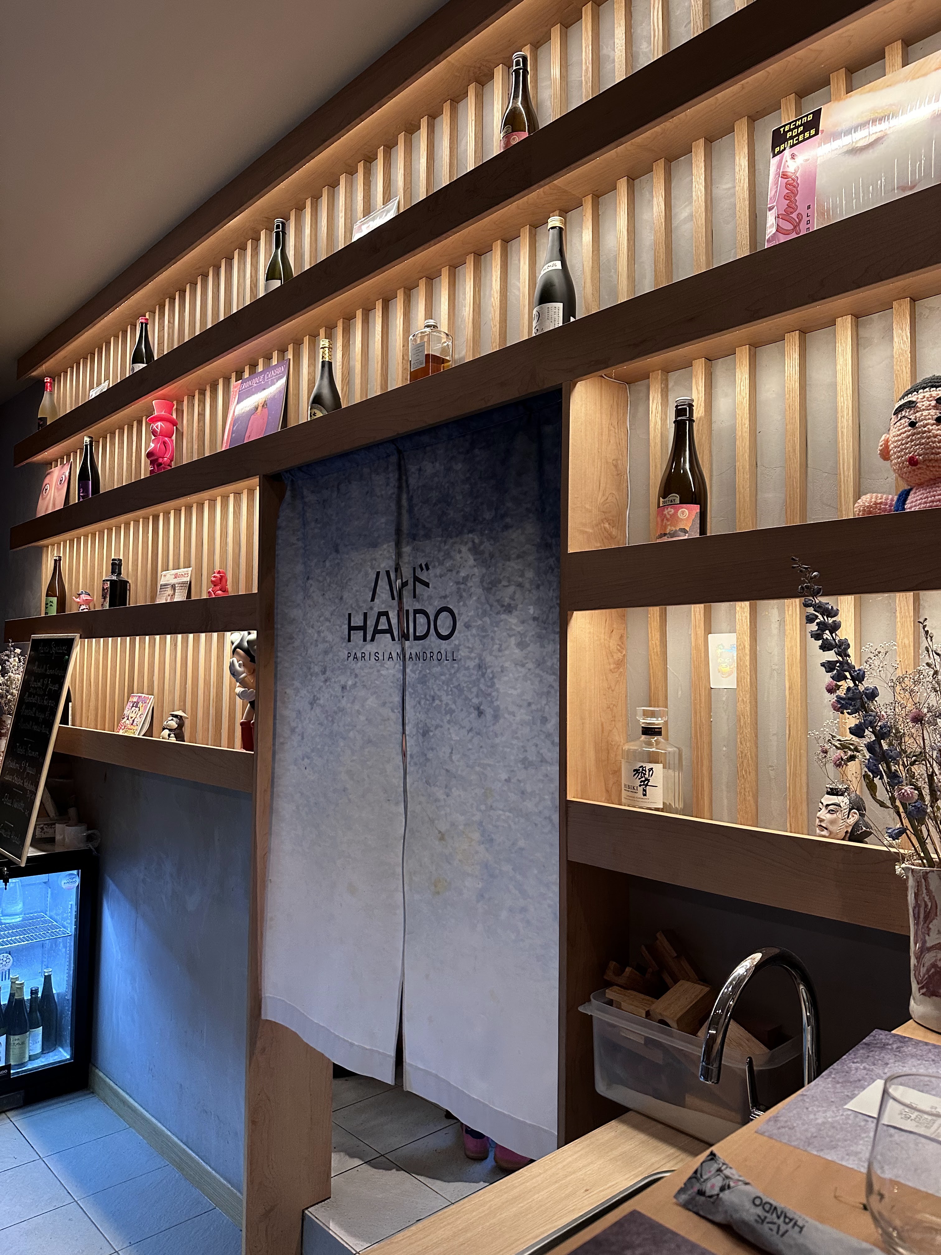 J’aime beaucoup ce restaurant. La nourriture n’exclut personne il y en à aussi pour les vegans. Les Handrolls sont frais à souhait et légèrement croustillant… La déco est épurée, fidèle aux standards japonais, d’où on recherche la tranquillité de l’esprit. Et puis il y à ces subtilités sur les murs dans l’arrière salle, où on trouve une autre forme d’art japonais que je vous laisse le loisir de découvrir, créant une harmonie et une identité propre à cet endroit d’où émane déjà de l’extérieur goût et raffinement. Pour couronner le tout, les playlists sont pensées pour coller à l’ambiance sobrement branchée du lieu. En bref, cette adresse est un de mes planques car on s’y sent bien et en intimité. Attention car quand on goûte une fois à Hando c’est comme une addiction, on en à l’eau à la bouche rien que d’y penser.