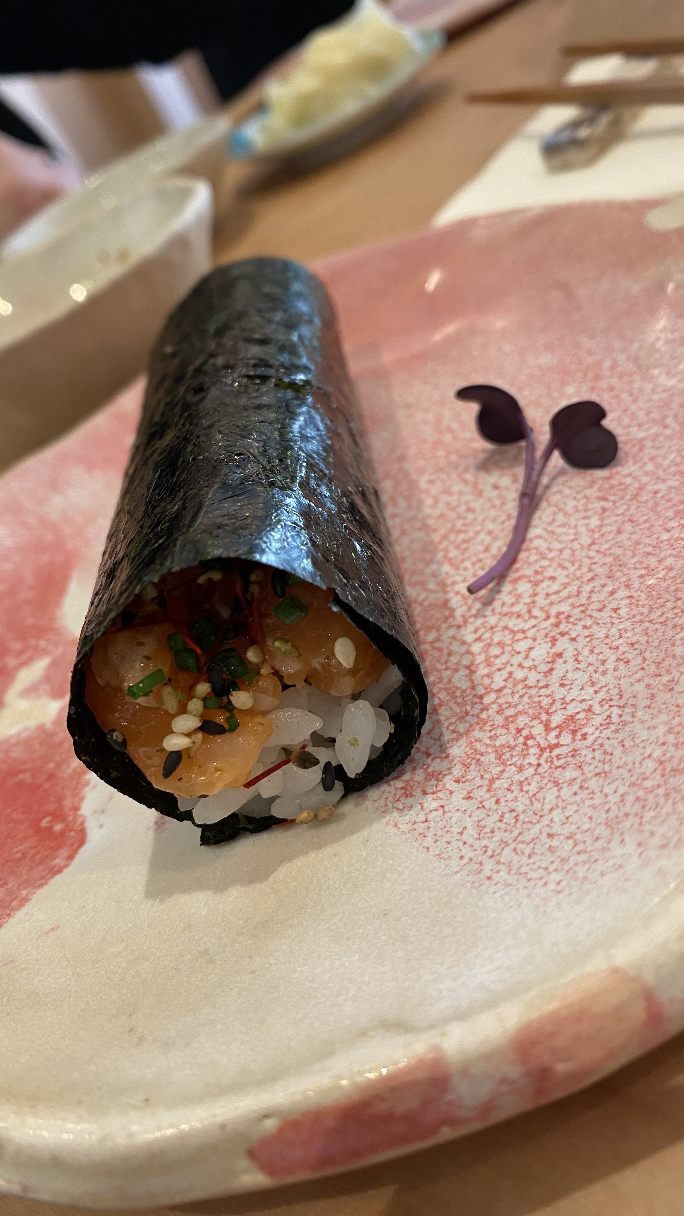 Cet endroit est excellent. Je n’ai jamais mangé de handrolls auparavant qui soient aussi bons, même de loin. Le sashimi de saumon grillé et l'apéritif aux algues aux cacahuètes étaient également très délicieux. Le verre de vin versé pourrait être un peu plus généreux mais je donnerai quand même à cet endroit 5/5.